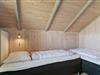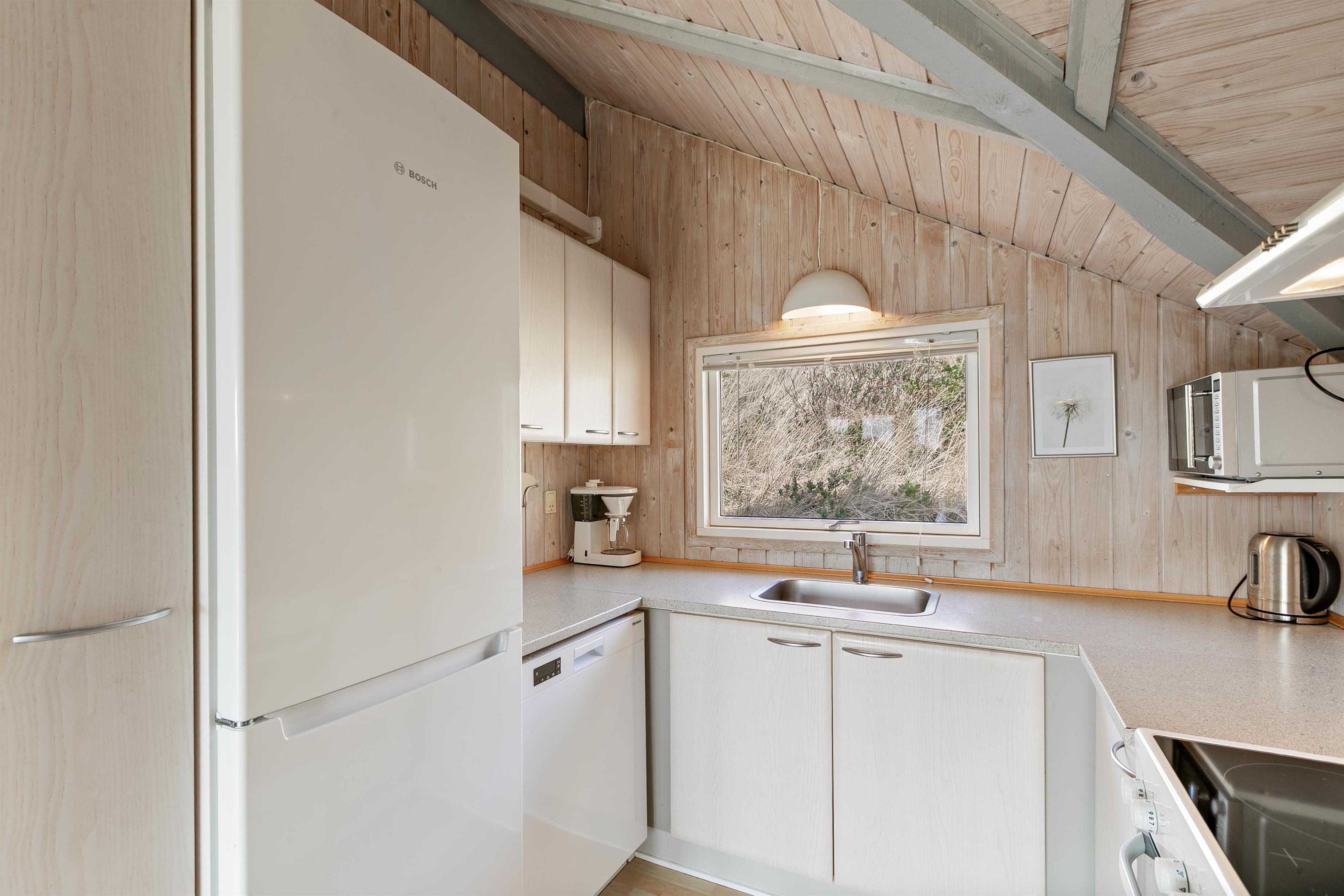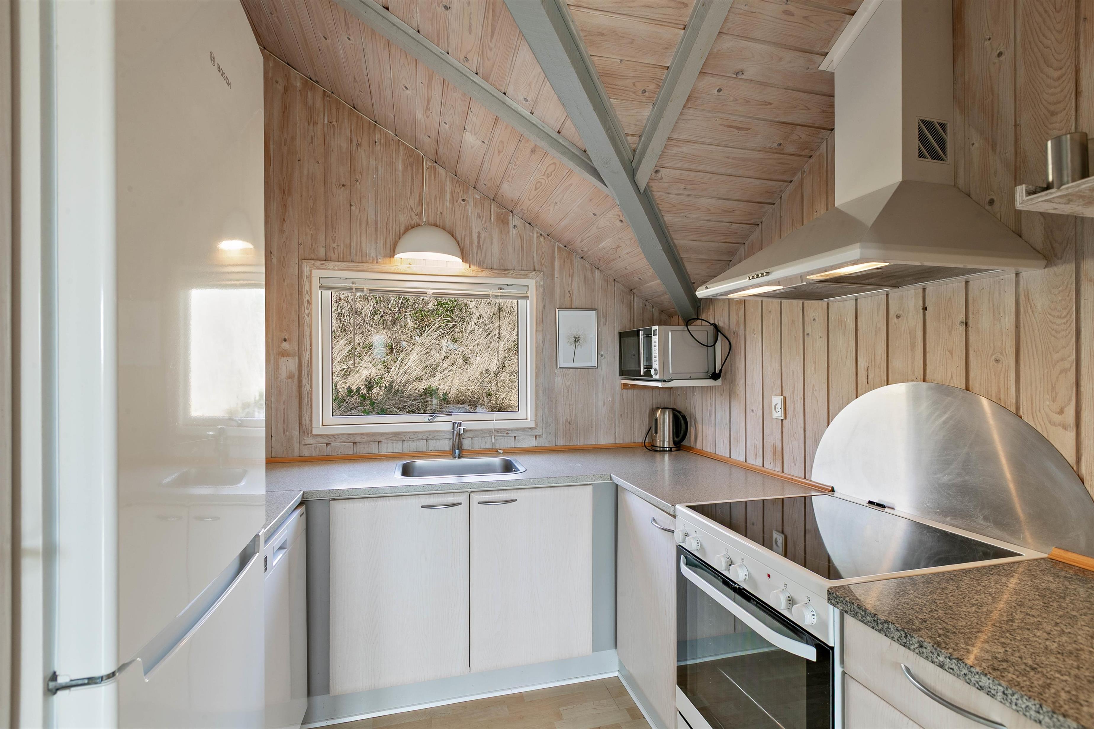 Fritidshusets samlingspunkt er det fine åbne køkken/alrum til familielivet med luftig loftshøjde til kip og en knitrende brændeovn. Her er rustikke bjælker på væggene, komfortable møbler og et dejligt vinduesparti, der lukker dagslyset ind. Køkkenet er udstyret med alle hverdagens bekvemmeligheder såsom mikroovn og opvaskemaskine plus en 80L fryser. Sofaen indbyder til afslapning med en god bog foran den varme pejs. Fra stuen er der udgang til den lukkede terrasse.
