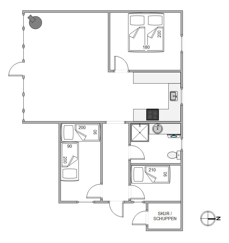 På den skønne klitgrund ligger et hyggeligt sommerhus på 61m2, der emmer af dansk sommerhusstemning. Her er tre gode værelser med indbyggede skabe til opbevaring samt et funktionelt badeværelse med gulvvarme. Herinde finder I også feriehusets vaskemaskine – super praktisk så håndklæderne kan blive opfrisket under opholdet.