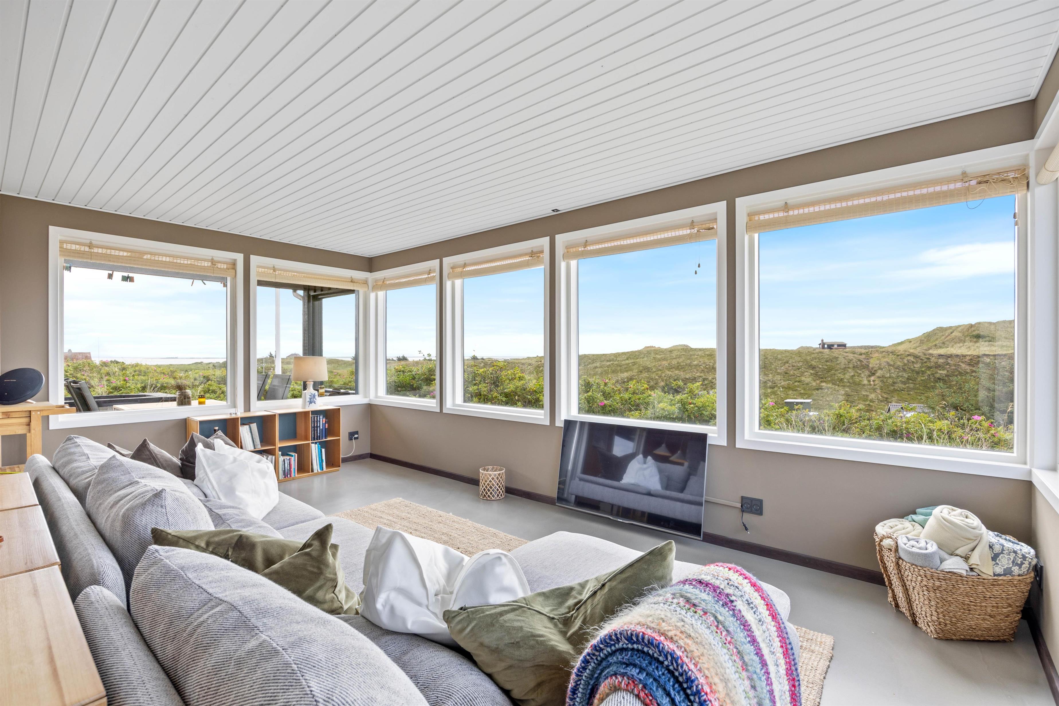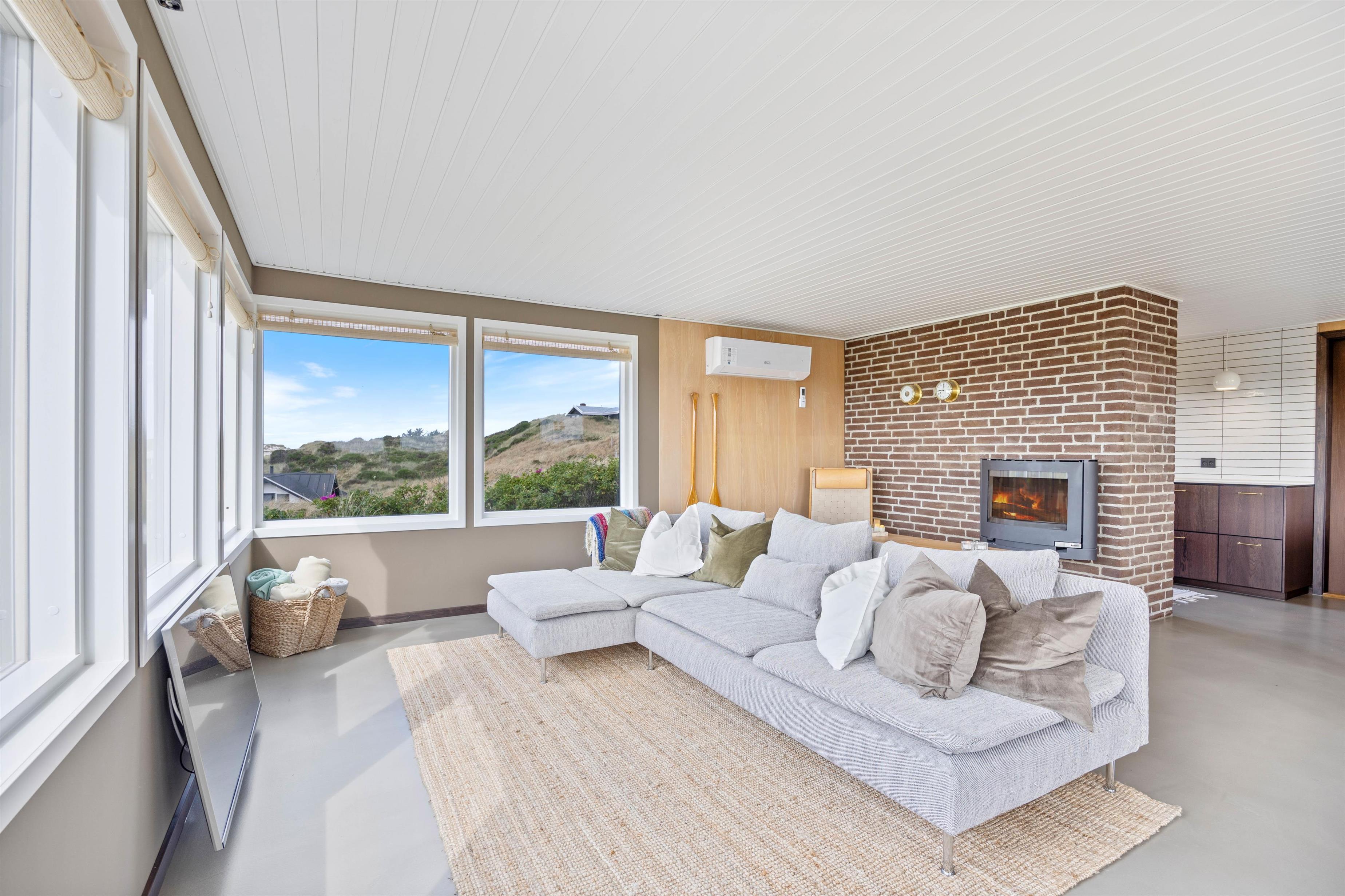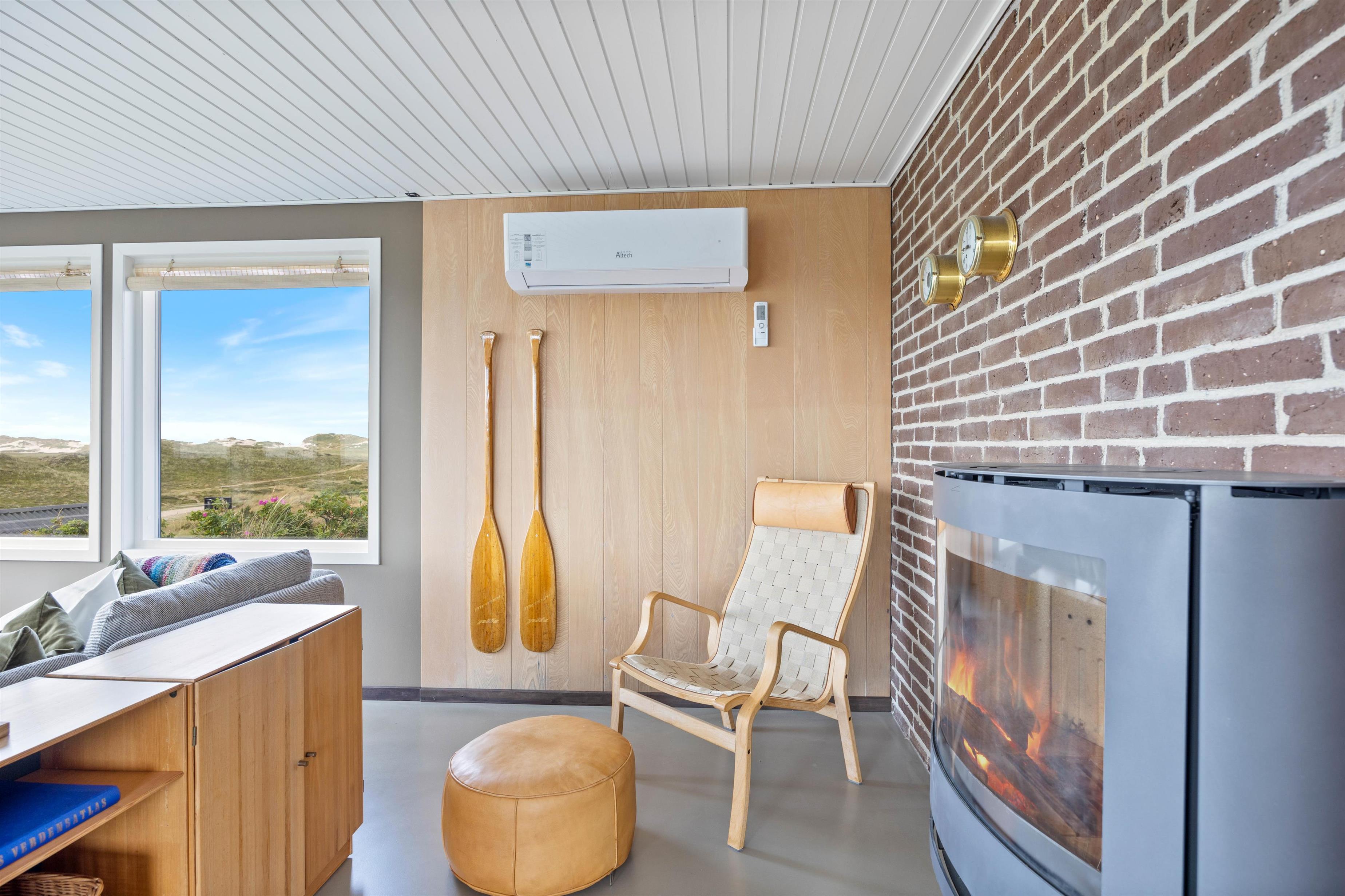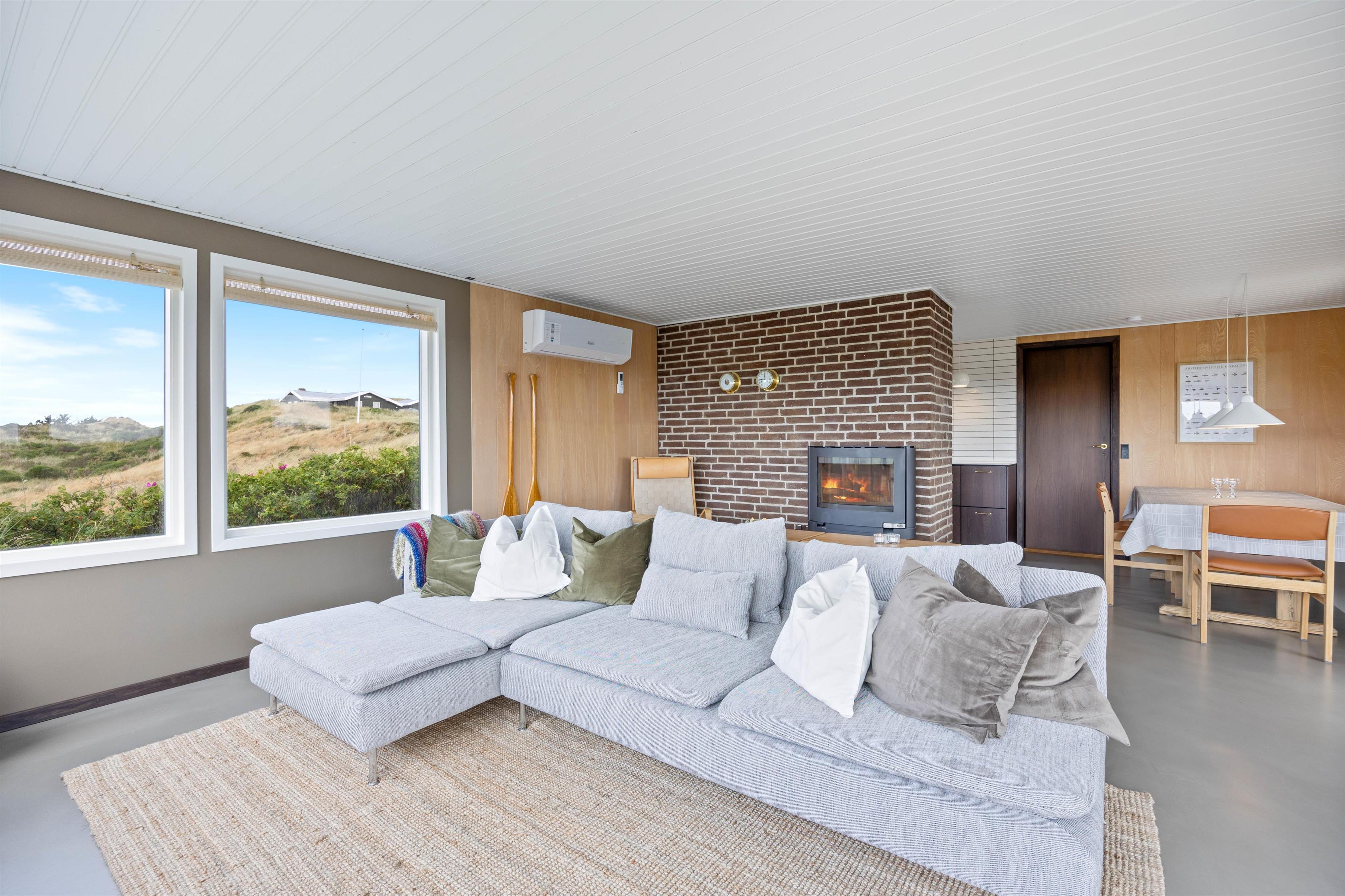 Du vil straks føle dig hjemme, når du træder ind i sommerhuset på Havvej 30. Den rummelige opholdsstue med det skønne lysindfald har brændeovn og panoramaudsigt, så du kan følge horisonten over klitterne i det betagende landskab. Her er hyggeligt i både dag- og aftentimerne, om du sidder med en god bog og en kop te, eller I spiller Besserwisser med baggrundslyd af den knitrende ild i brændeovnen.