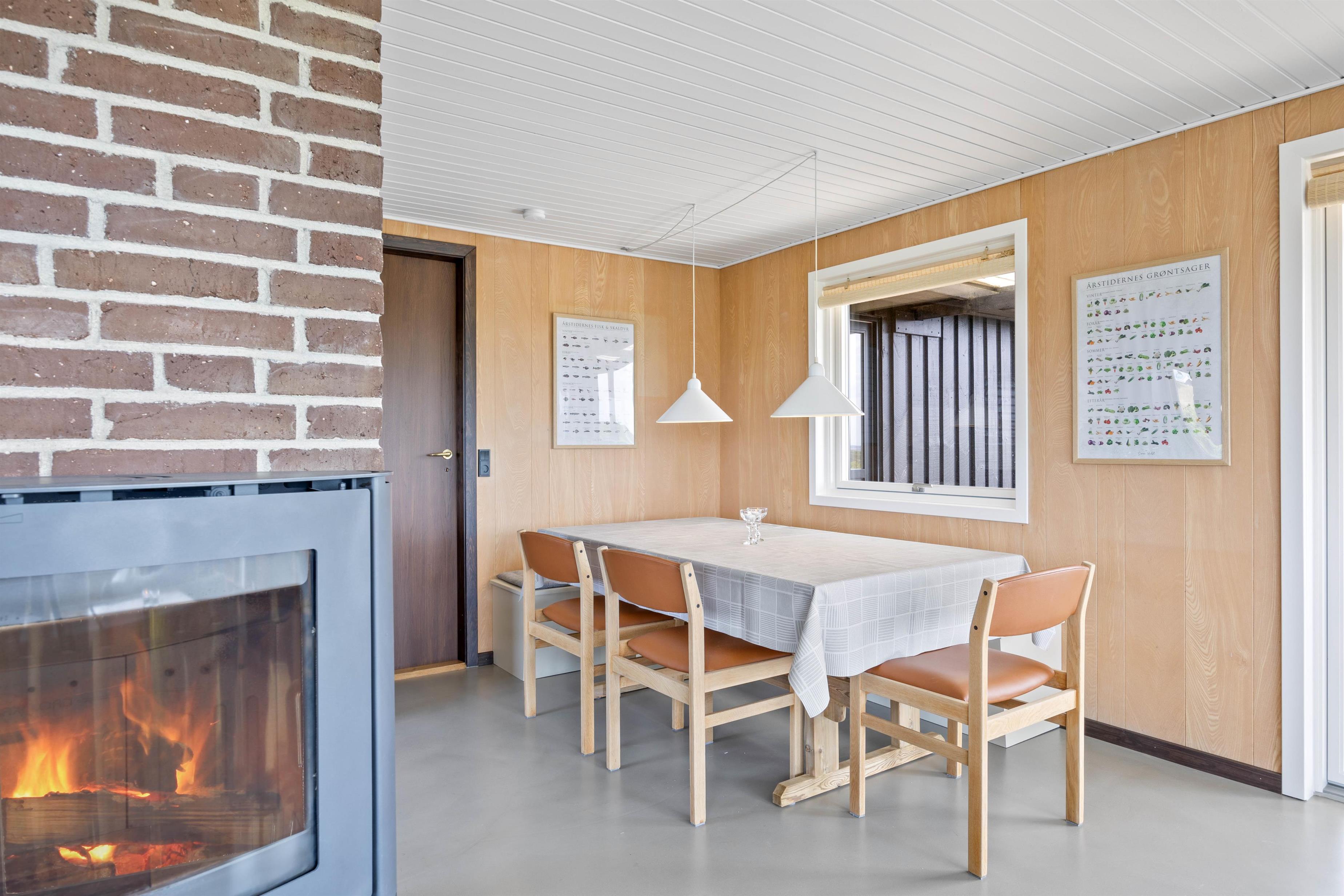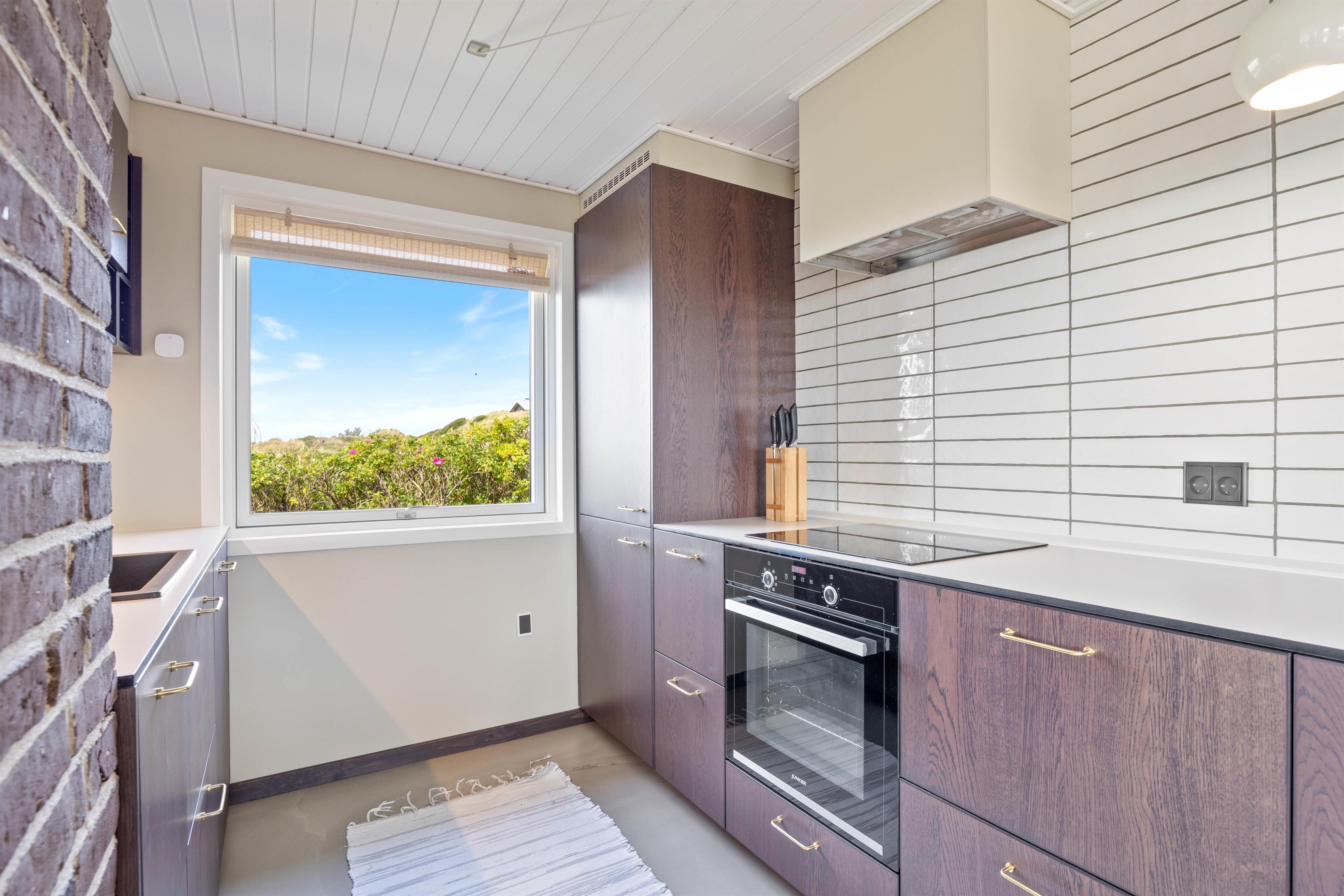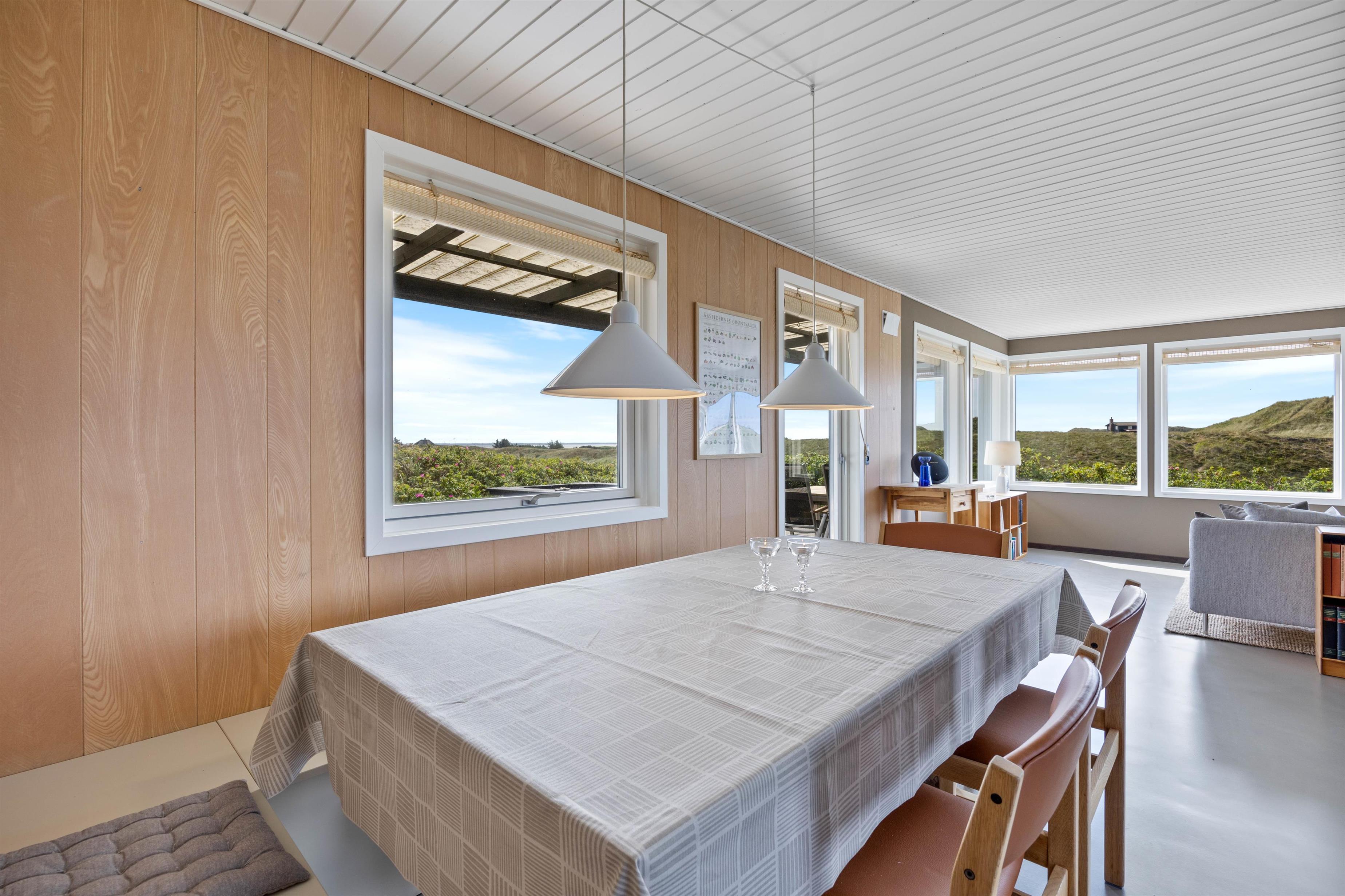 Du vil straks føle dig hjemme, når du træder ind i sommerhuset på Havvej 30. Den rummelige opholdsstue med det skønne lysindfald har brændeovn og panoramaudsigt, så du kan følge horisonten over klitterne i det betagende landskab. Her er hyggeligt i både dag- og aftentimerne, om du sidder med en god bog og en kop te, eller I spiller Besserwisser med baggrundslyd af den knitrende ild i brændeovnen.