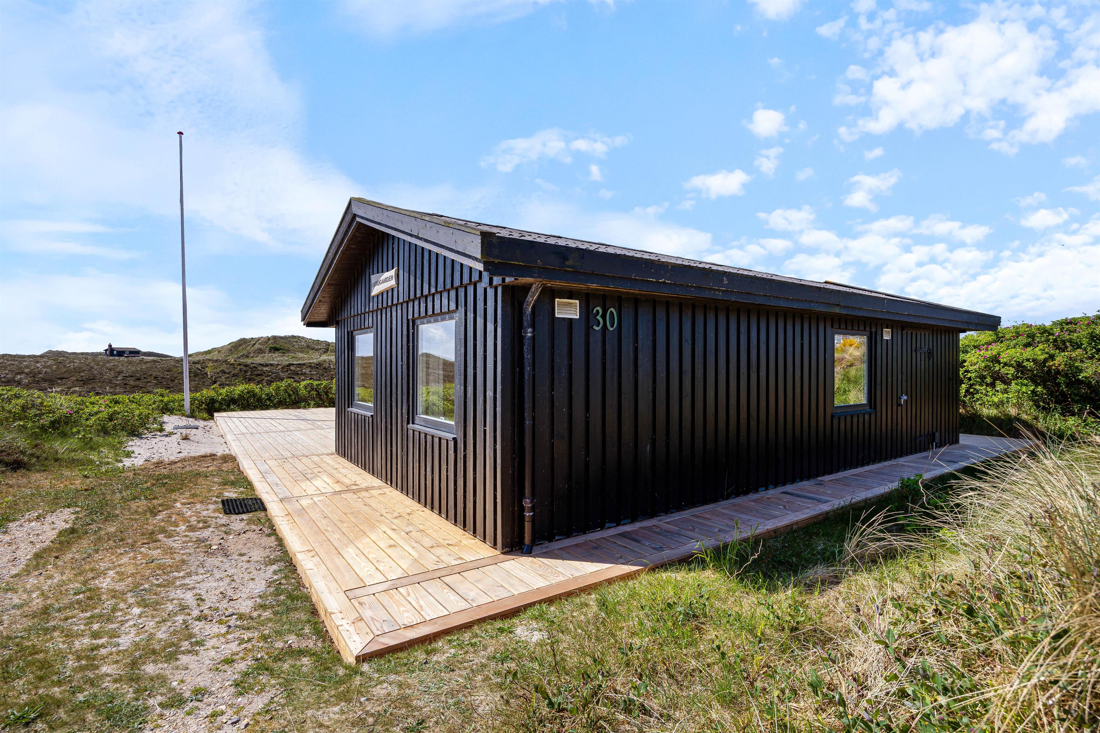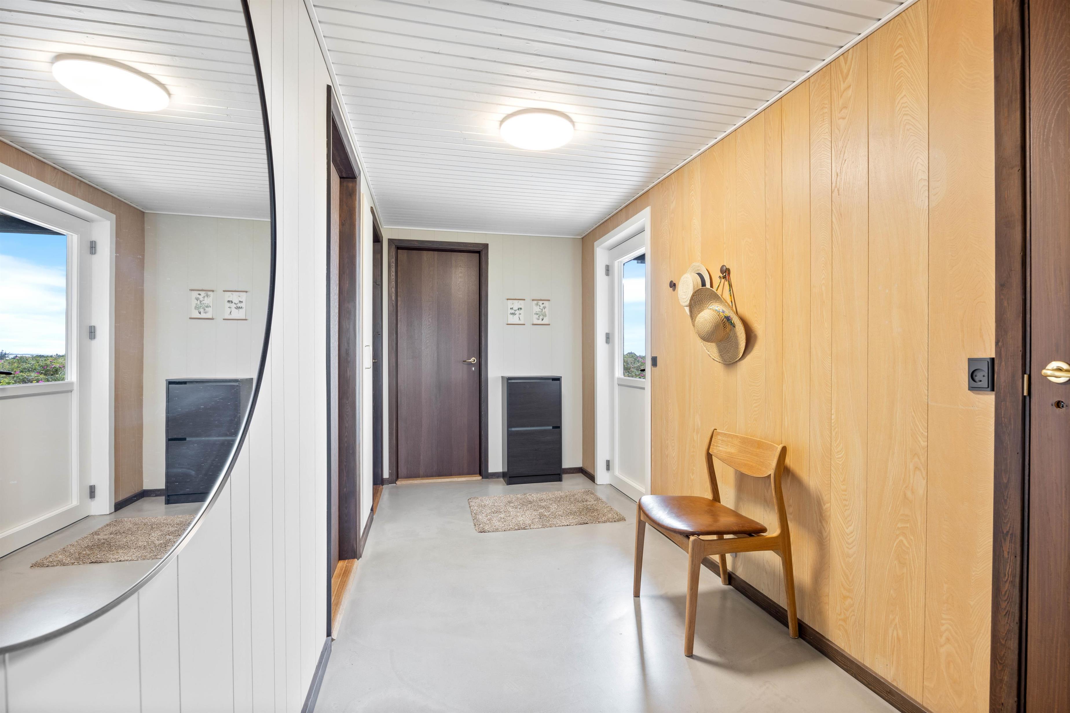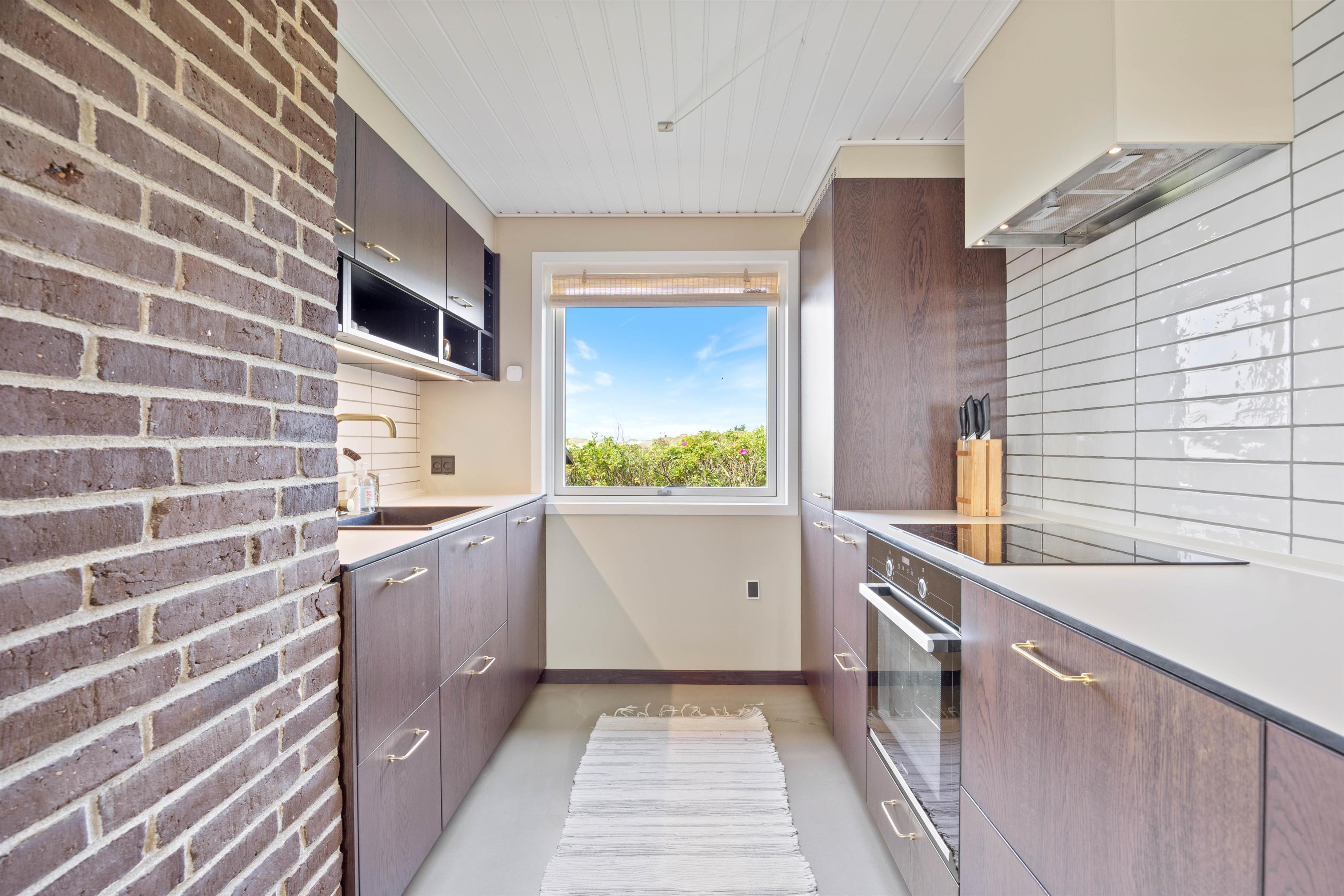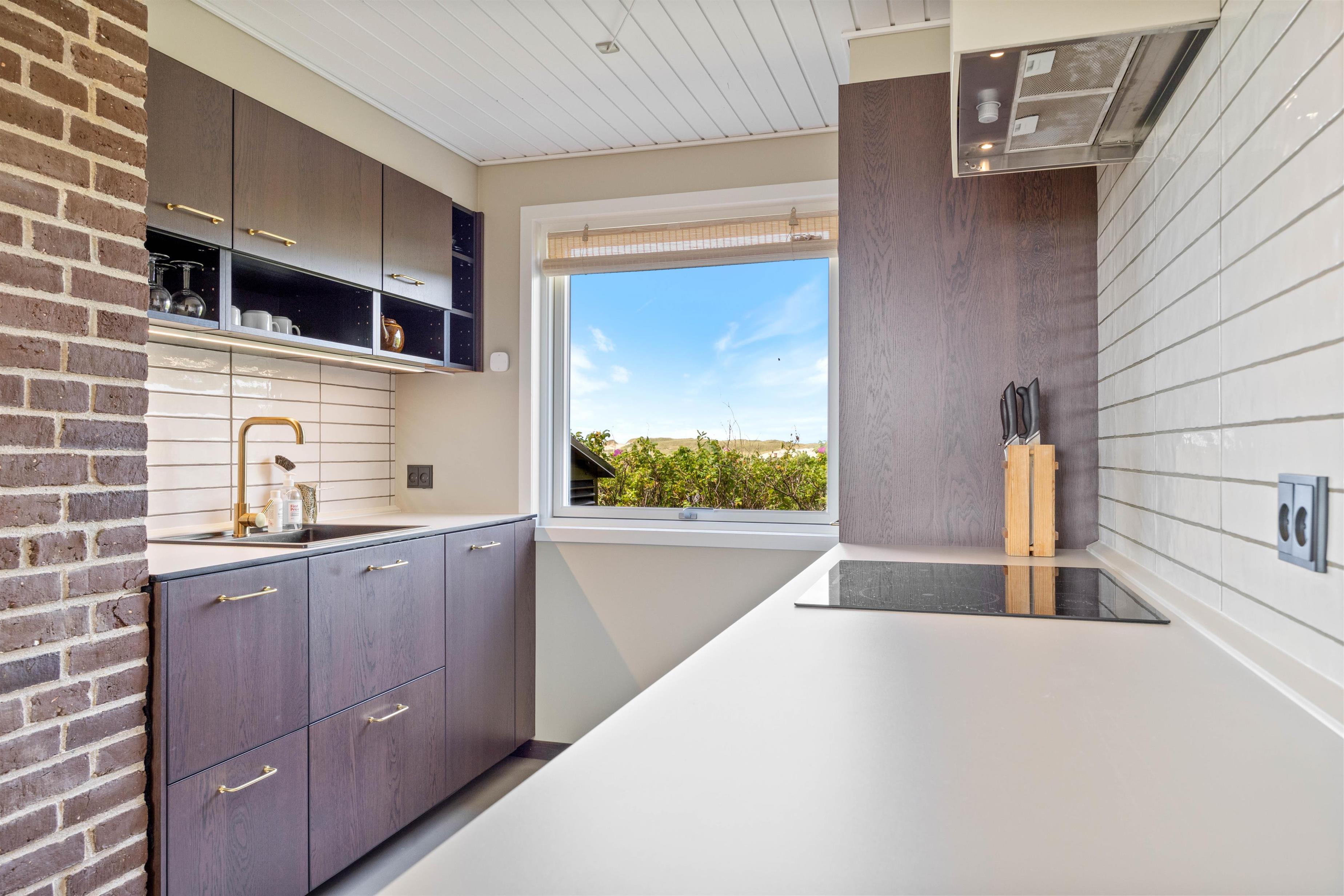 Du vil straks føle dig hjemme, når du træder ind i sommerhuset på Havvej 30. Den rummelige opholdsstue med det skønne lysindfald har brændeovn og panoramaudsigt, så du kan følge horisonten over klitterne i det betagende landskab. Her er hyggeligt i både dag- og aftentimerne, om du sidder med en god bog og en kop te, eller I spiller Besserwisser med baggrundslyd af den knitrende ild i brændeovnen.