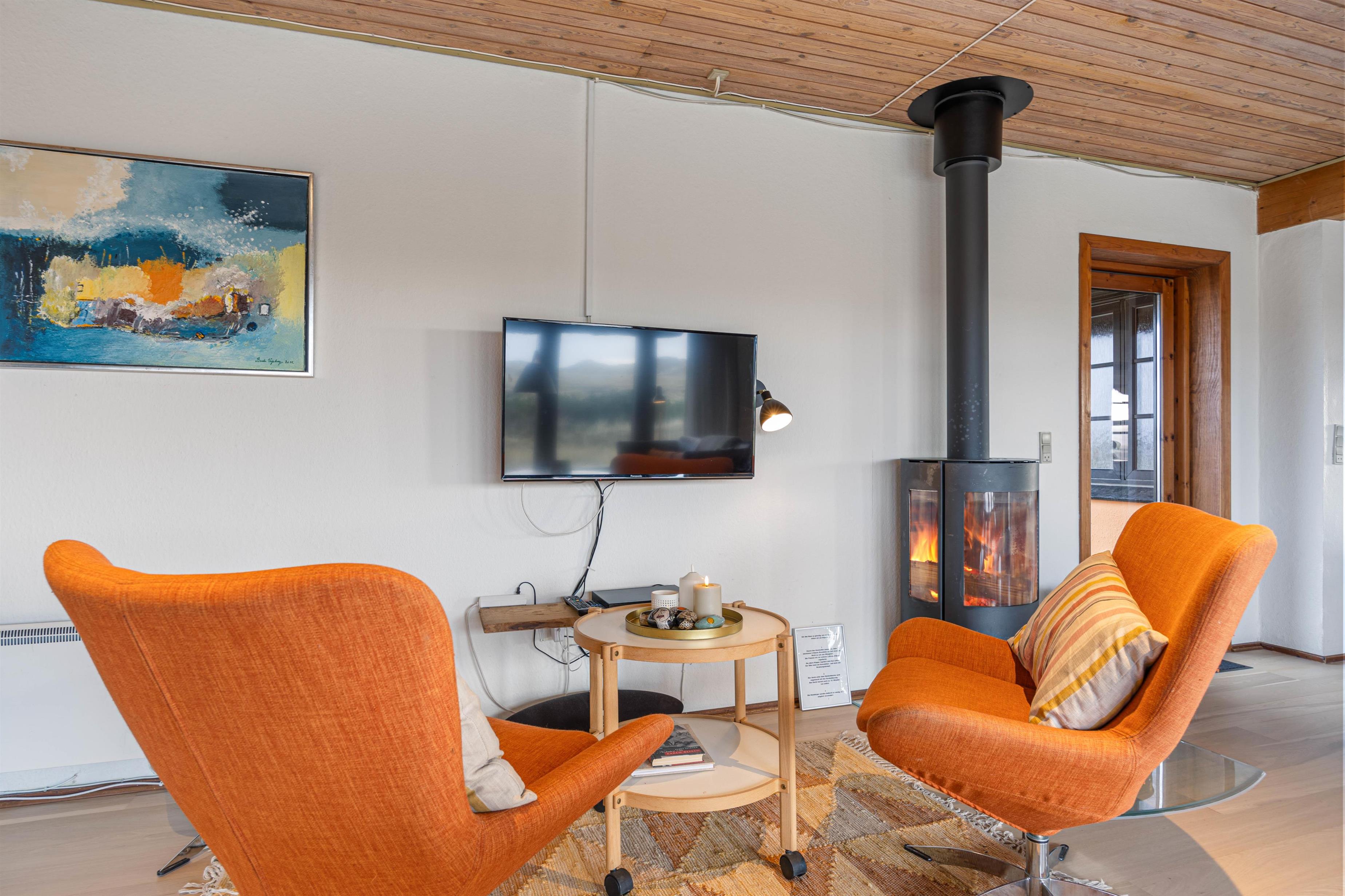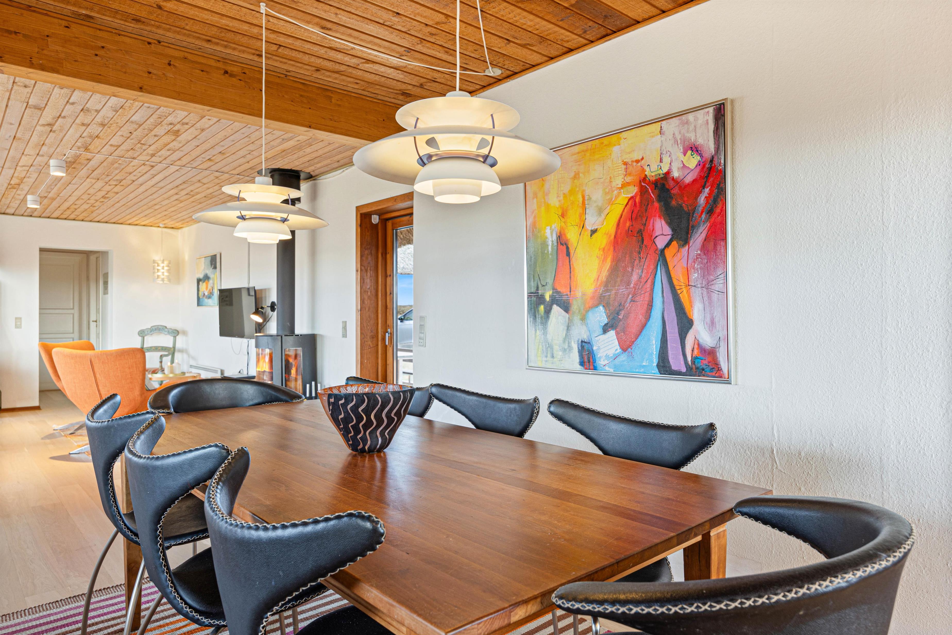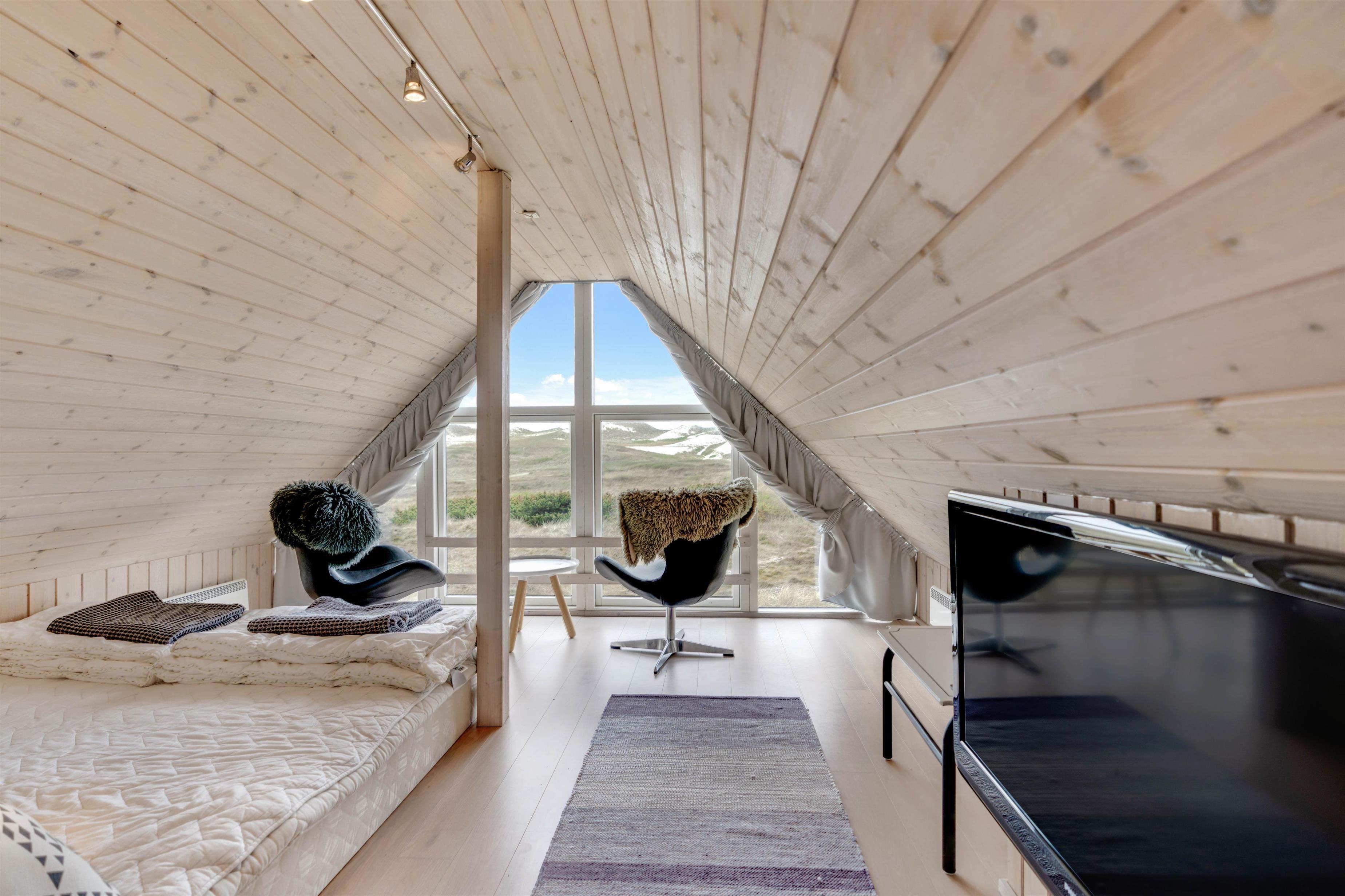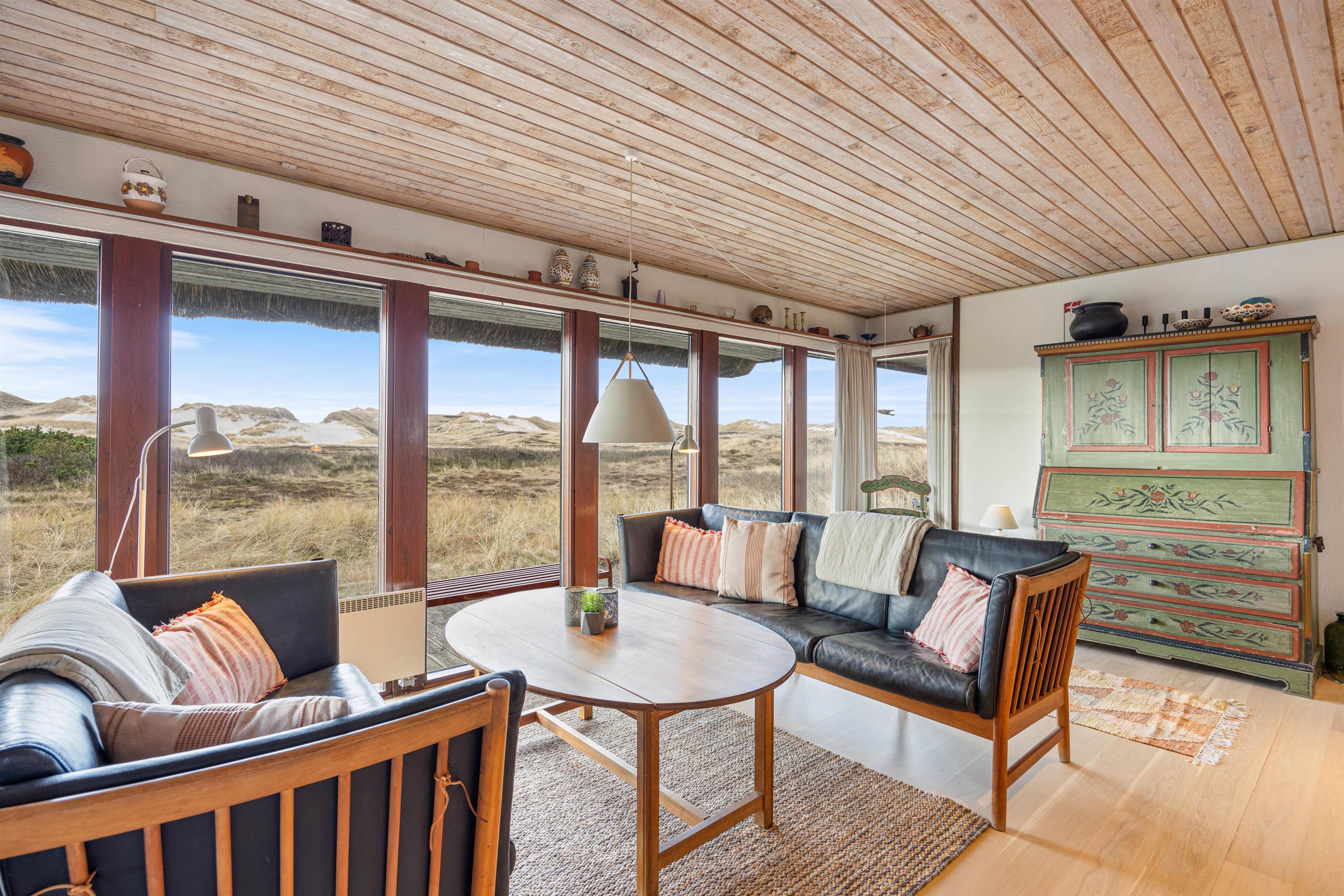 Fra det store vinduespartie i stuen, men specielt også fra første salen, kan I nyde panoramaudsigten over hede- og klitlandskabet mod vest. Sommer som vinter byder det en fantastisk udsigt over den vestjyske natur.