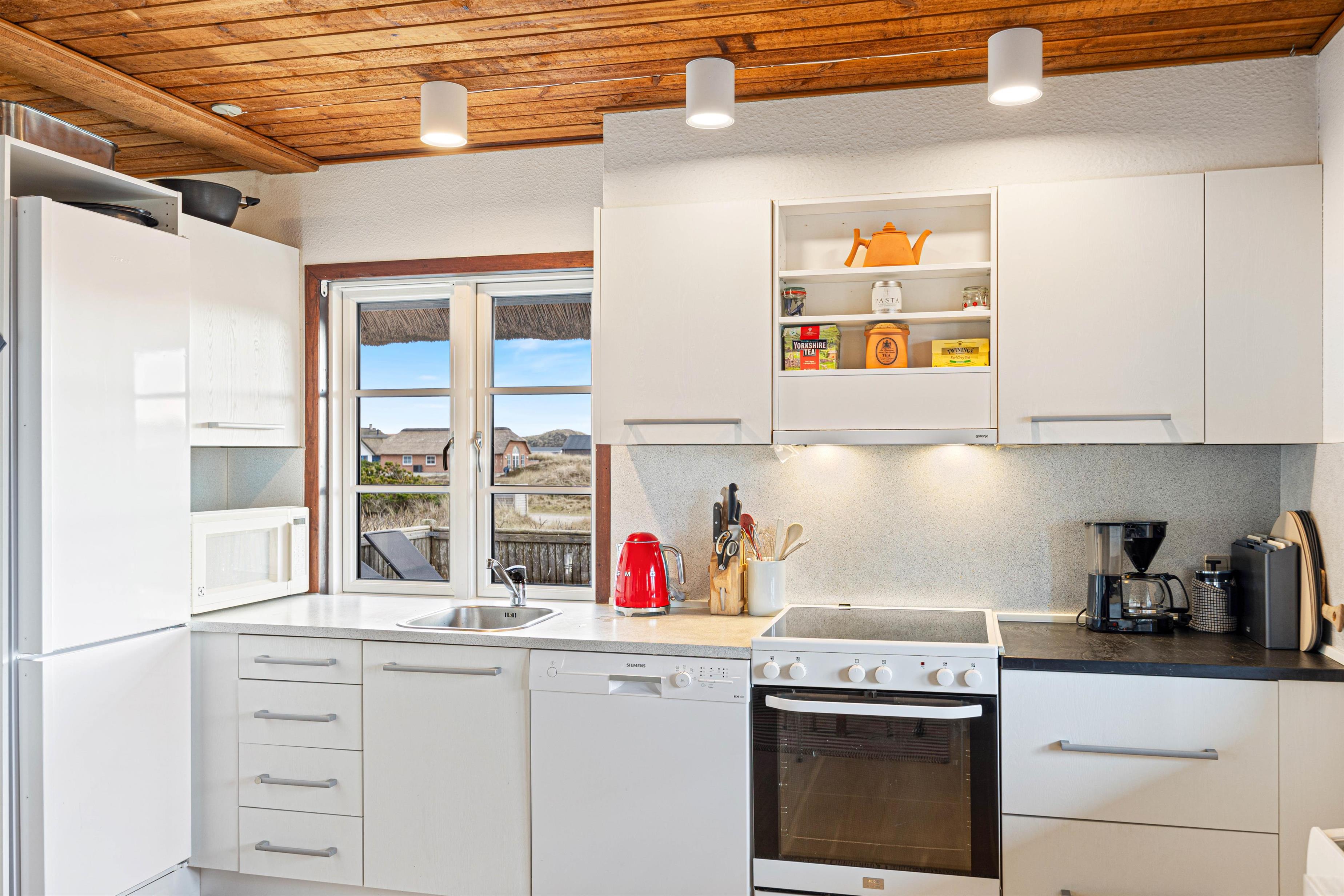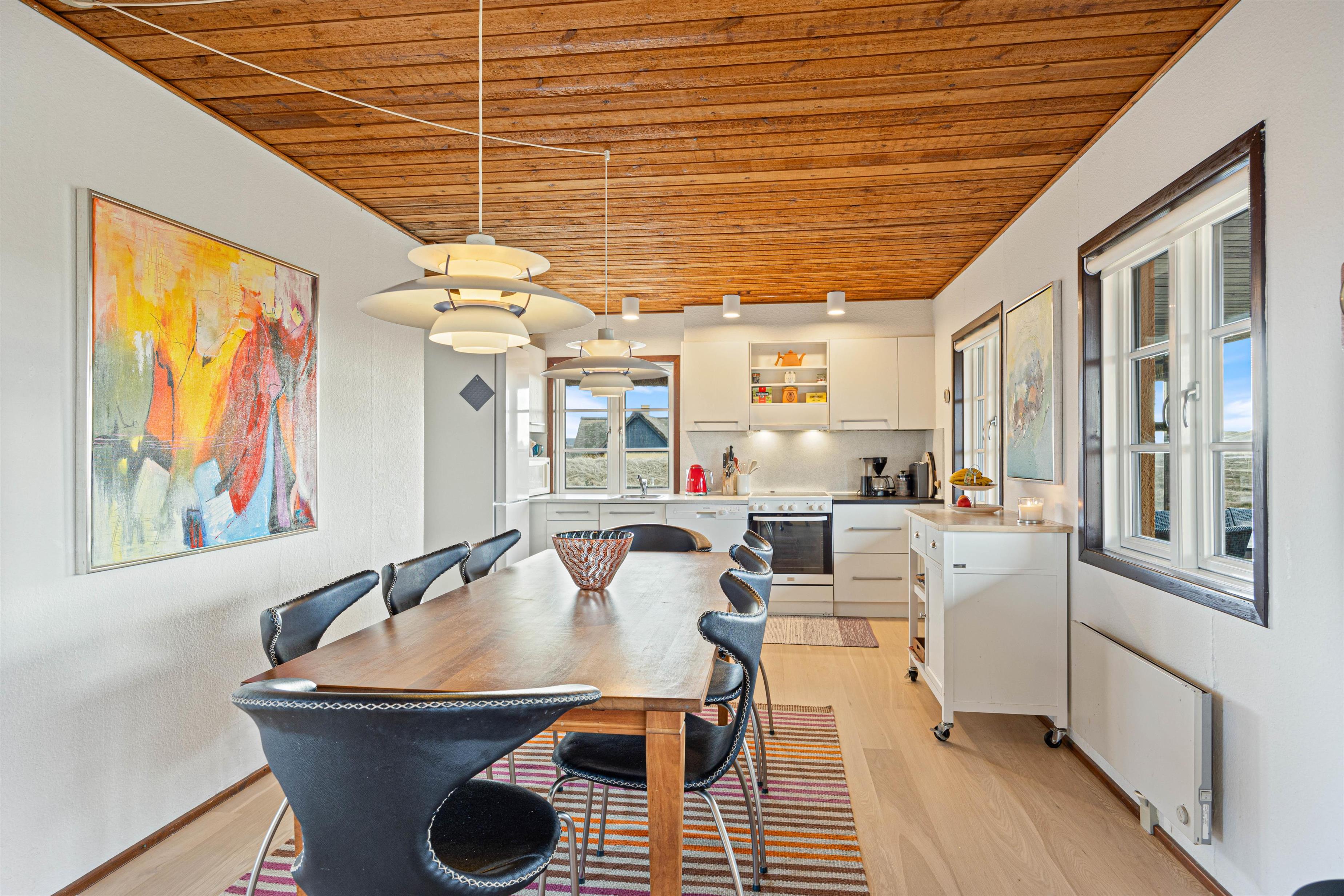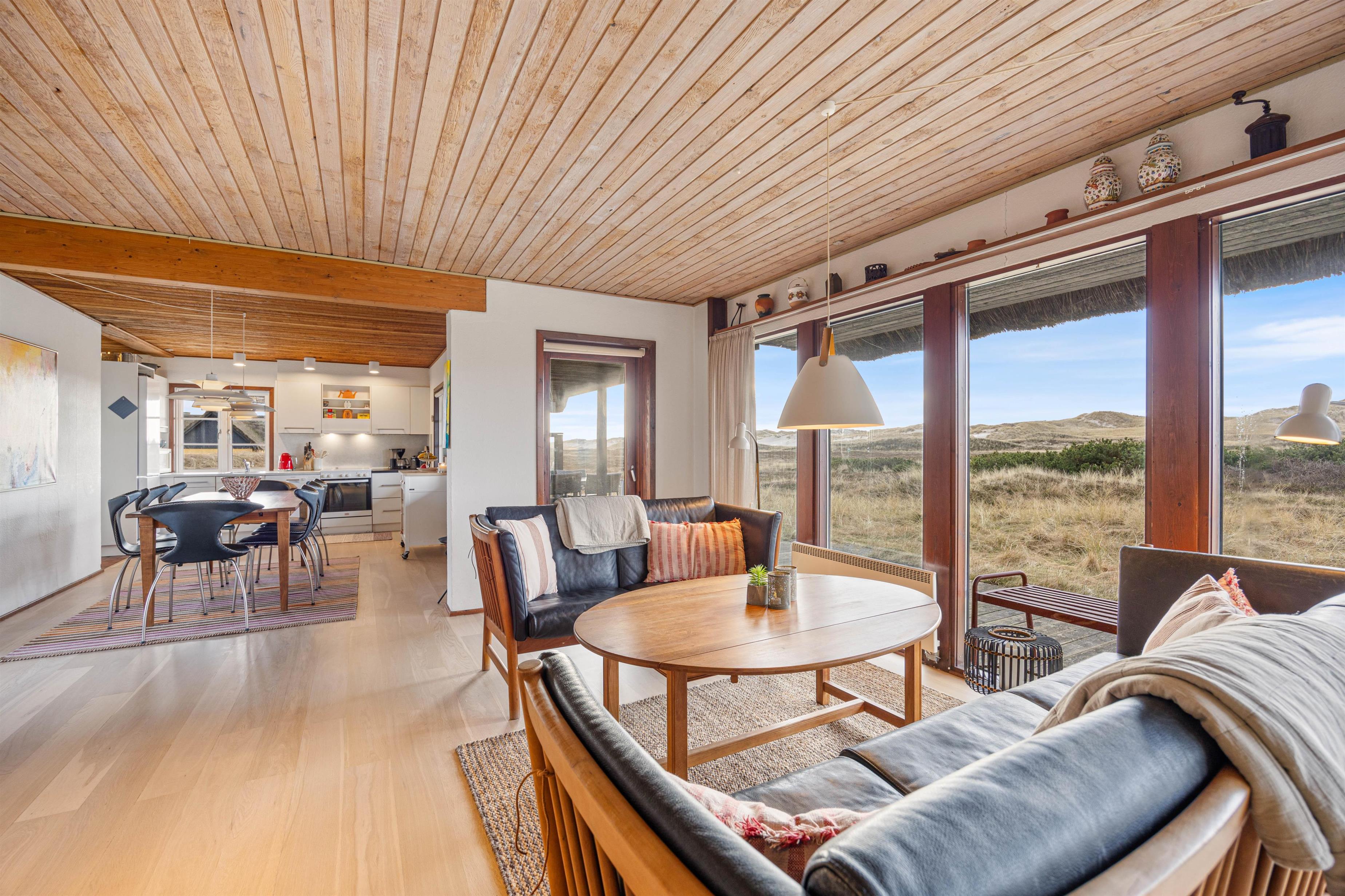 Dette personligt indrettede sommerhus i Skodbjerge er lyst og venligt indrettet, og her kan I føle jer godt tilpasse sammen. Her er helt perfekt til afslapning og til at få genopladet batterierne. Køkkenet er åbent i forbindelse med spiseafdeling og stuen, så I kan være sammen, uanset om I er på madholdet, spiller brætspil eller hygger jer i sofagruppen foran brændeovnen. Der er også en energibesparende varmepumpe. Fra alle rum i sommerhuset er der et fantastisk lysindfald og udsigt over det helt specielle klitlandskab.