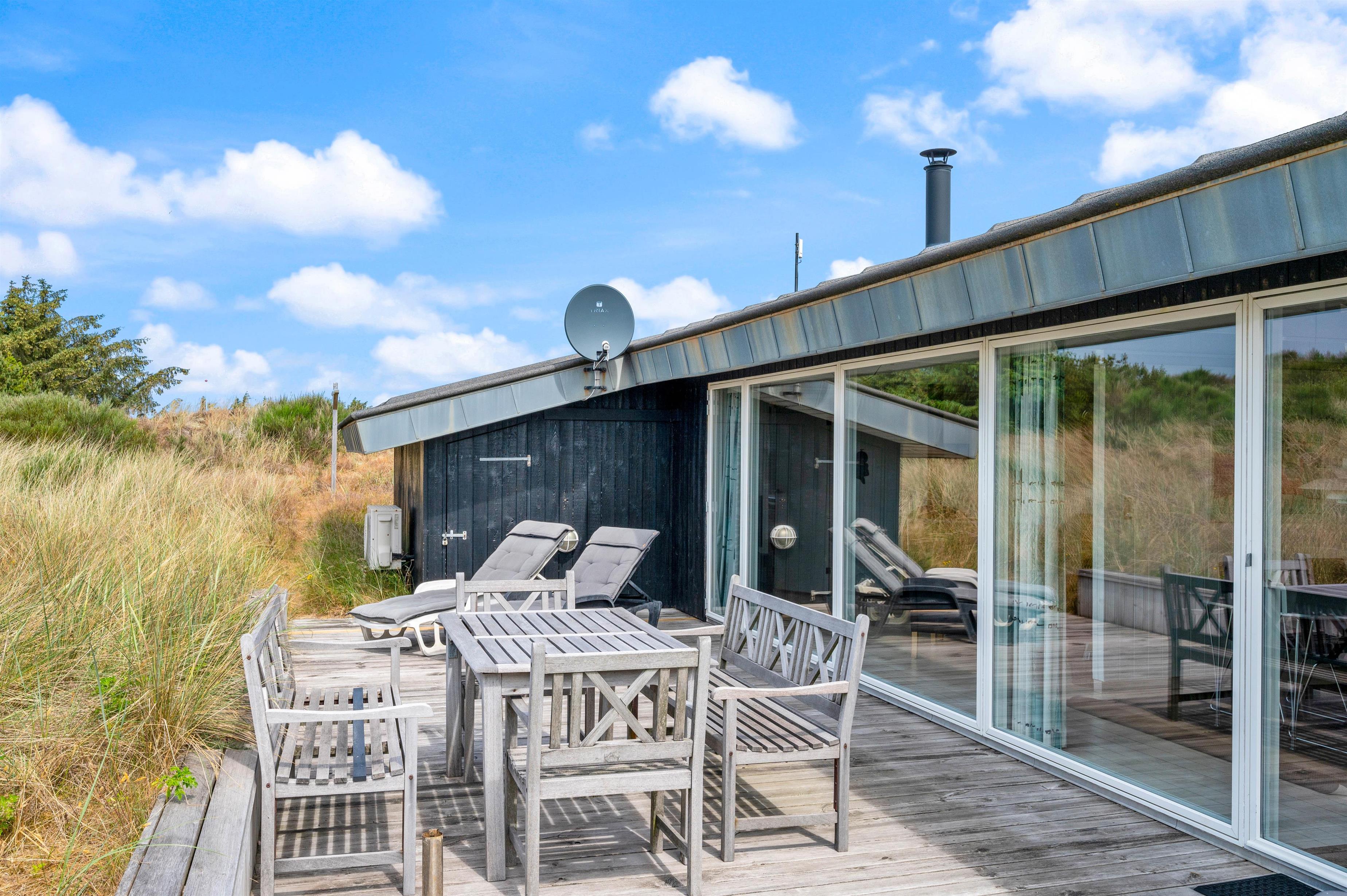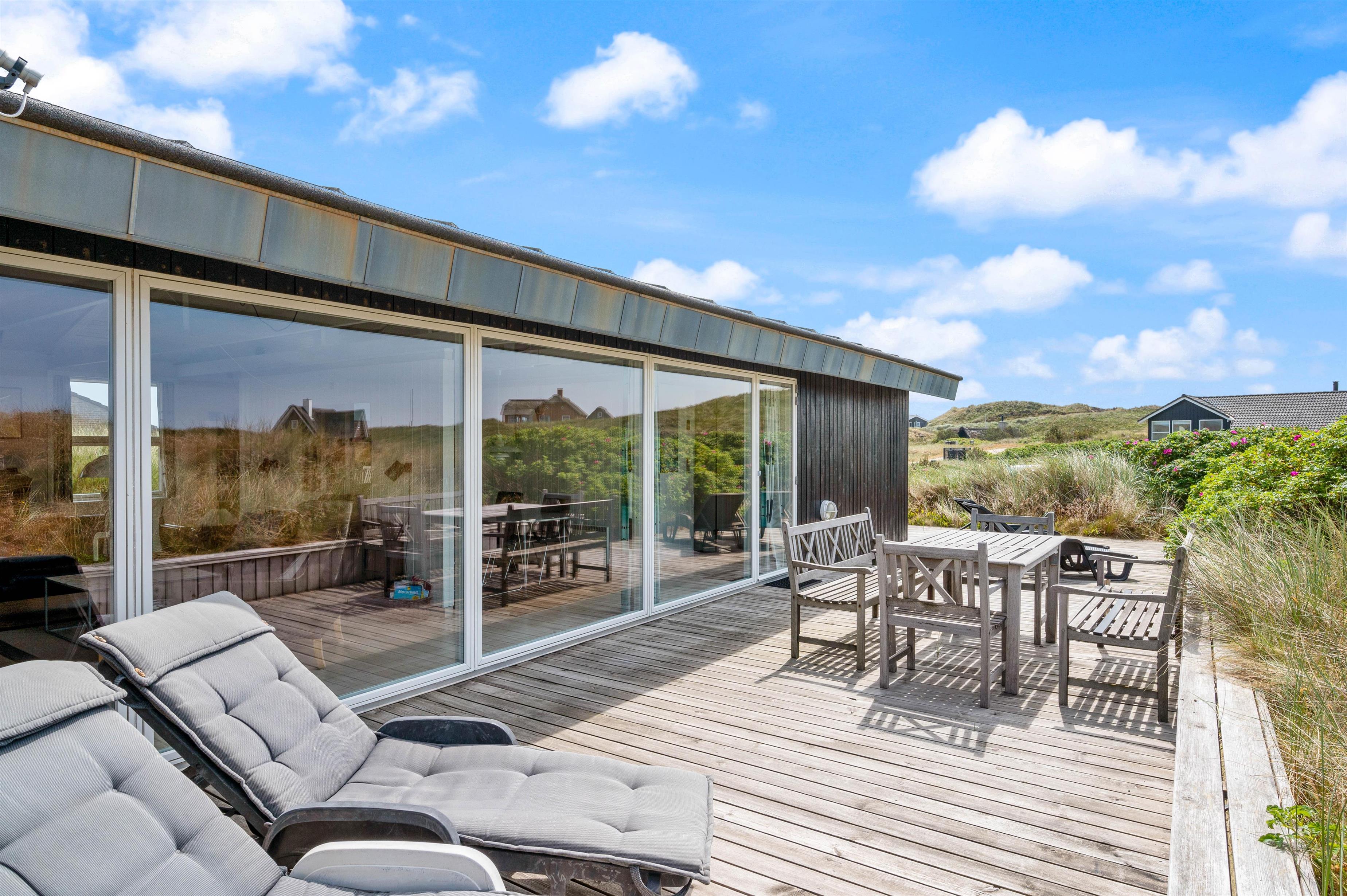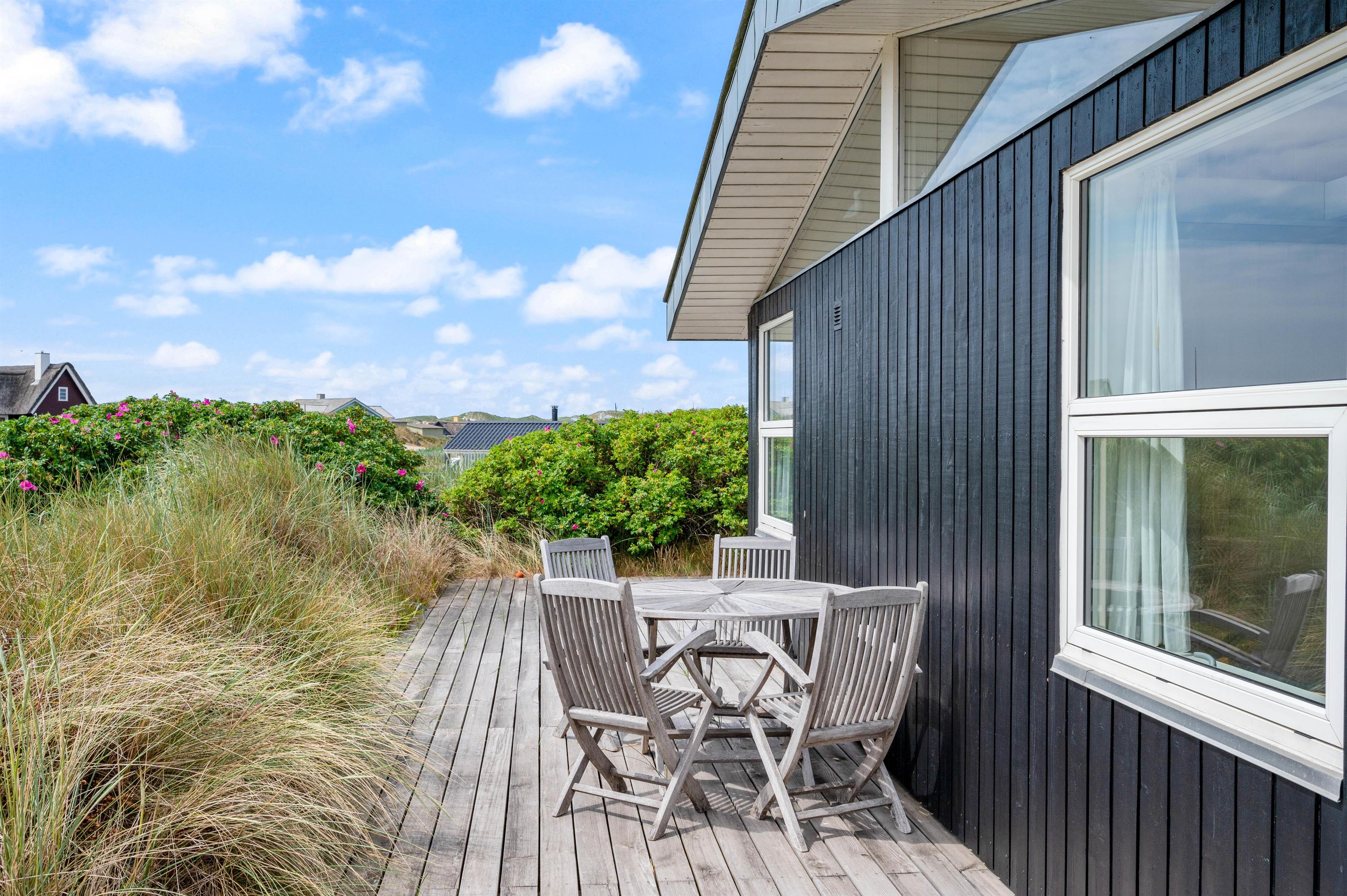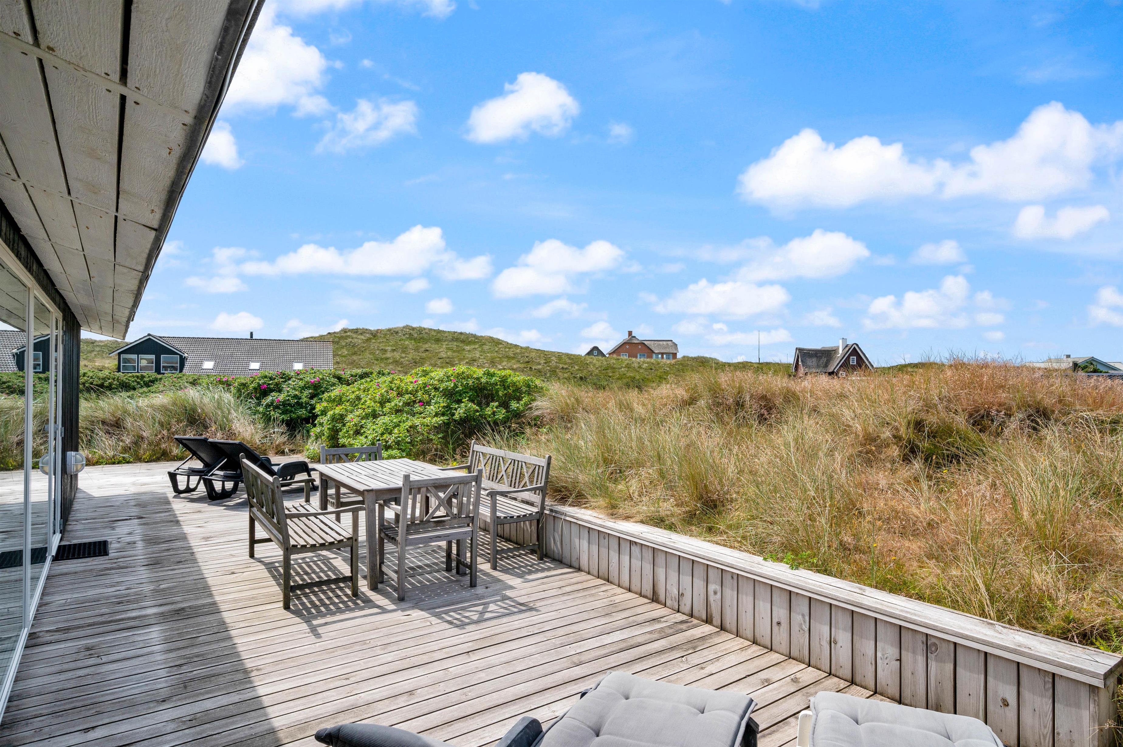 Der er skønne terrasser tilhørende sommerhuset. Mod øst er der en helt lukket terrasse, som er særdeles anvendelig i morgen og formiddagstimerne, og herfra kan I også se over Ringkøbing Fjord. Mod syd og mod vest er terrassen sammenhængende, og klitterne danner samtidig en god afskærmning, især mod vest.
