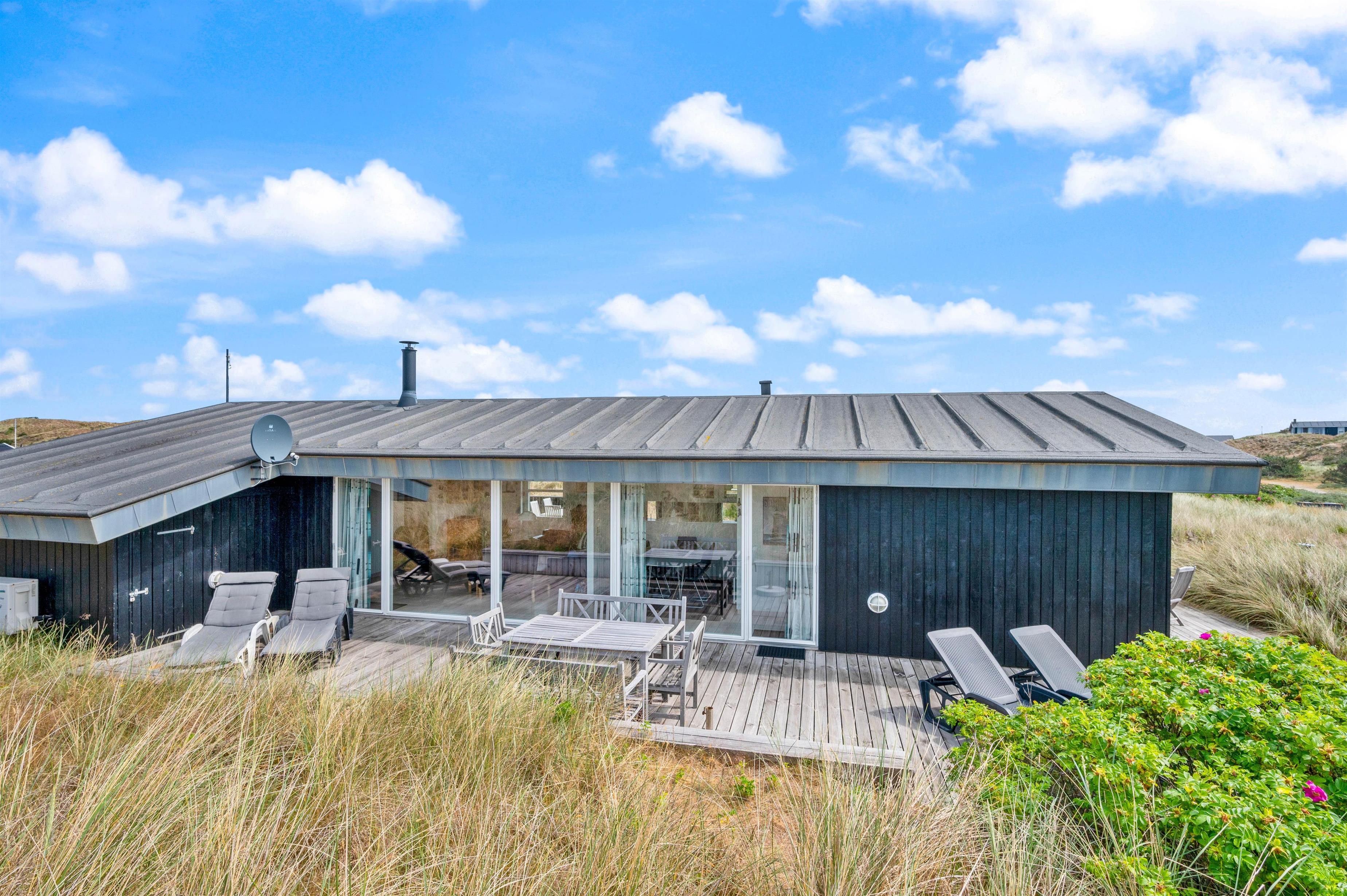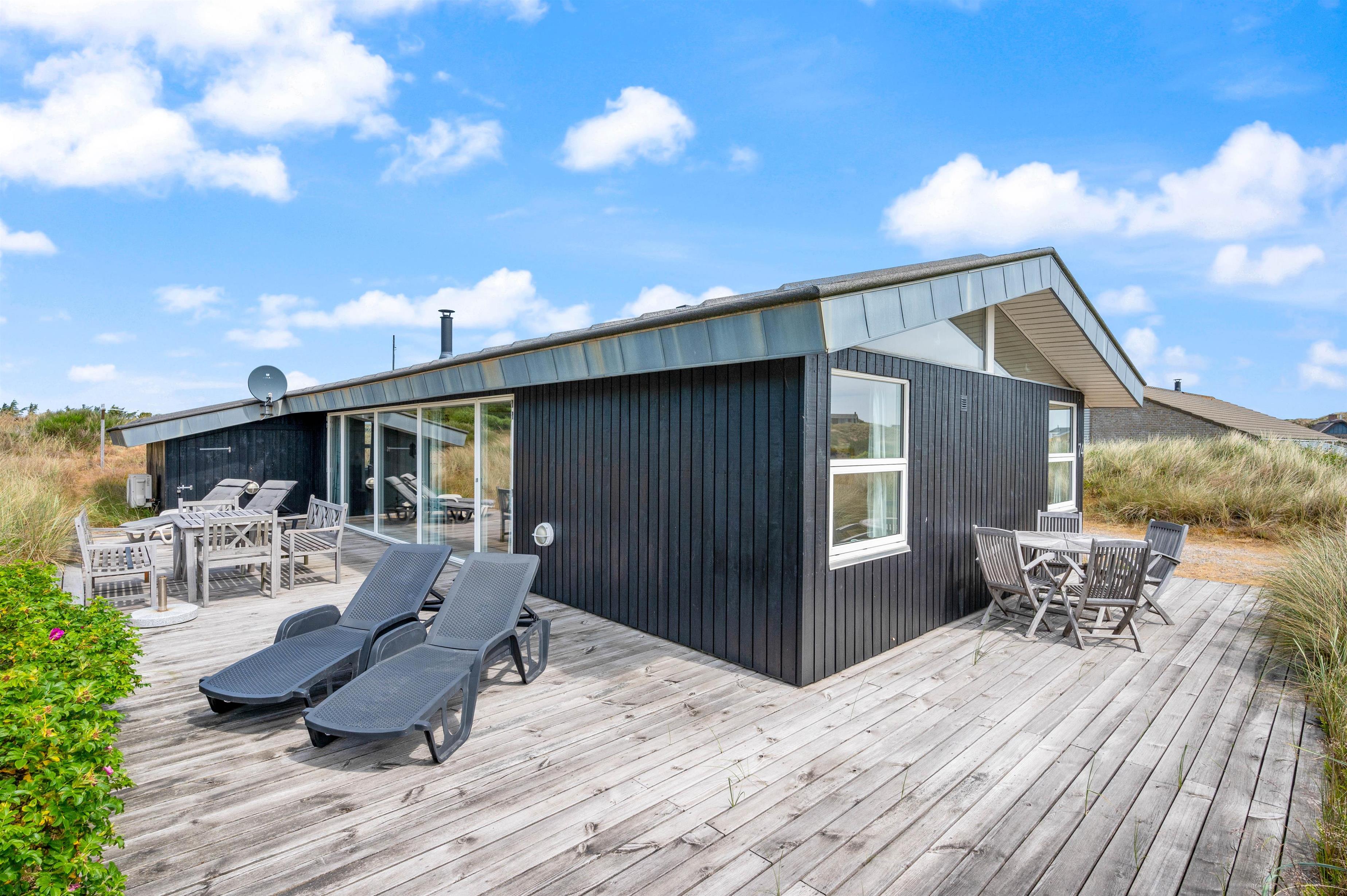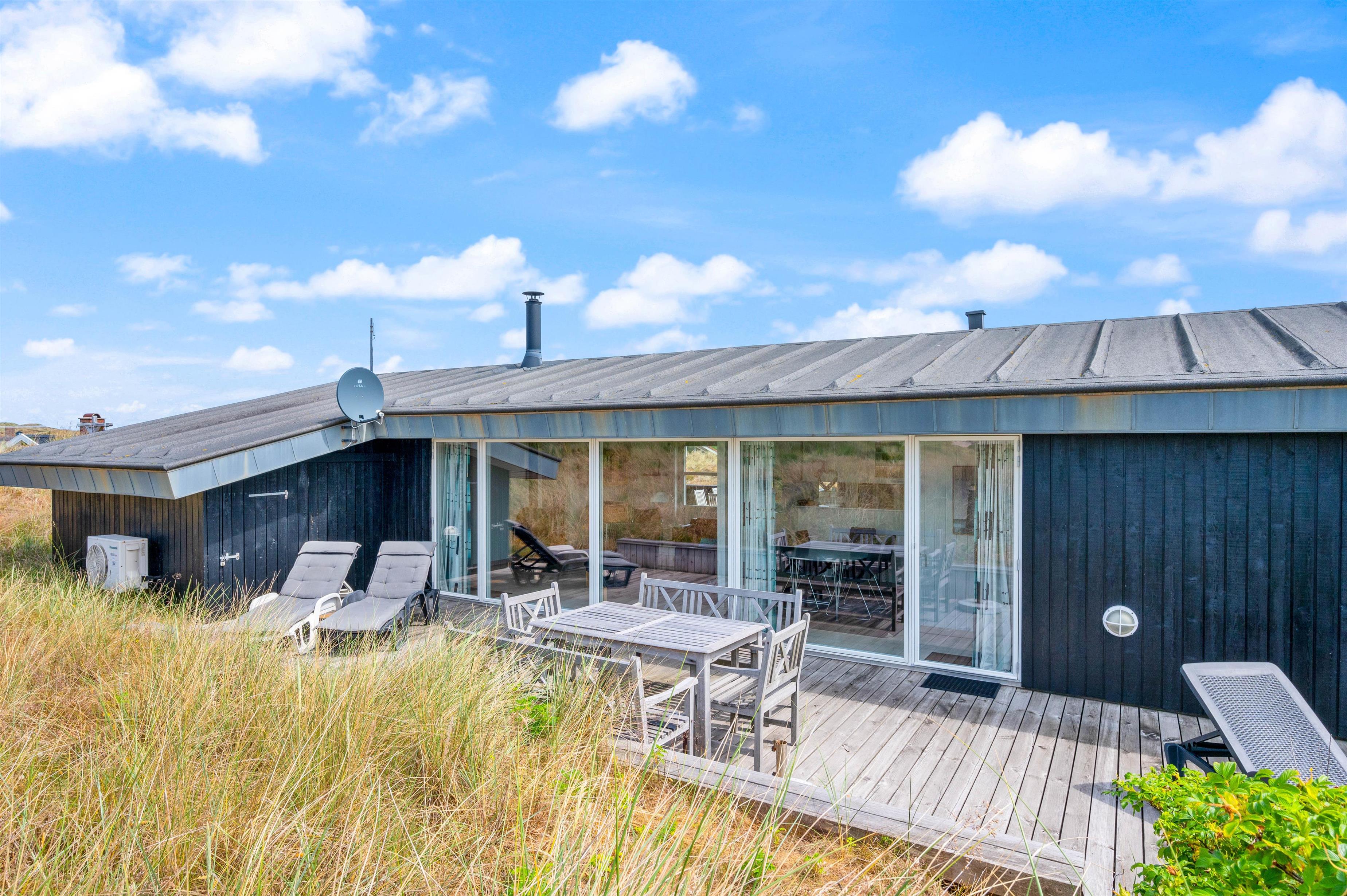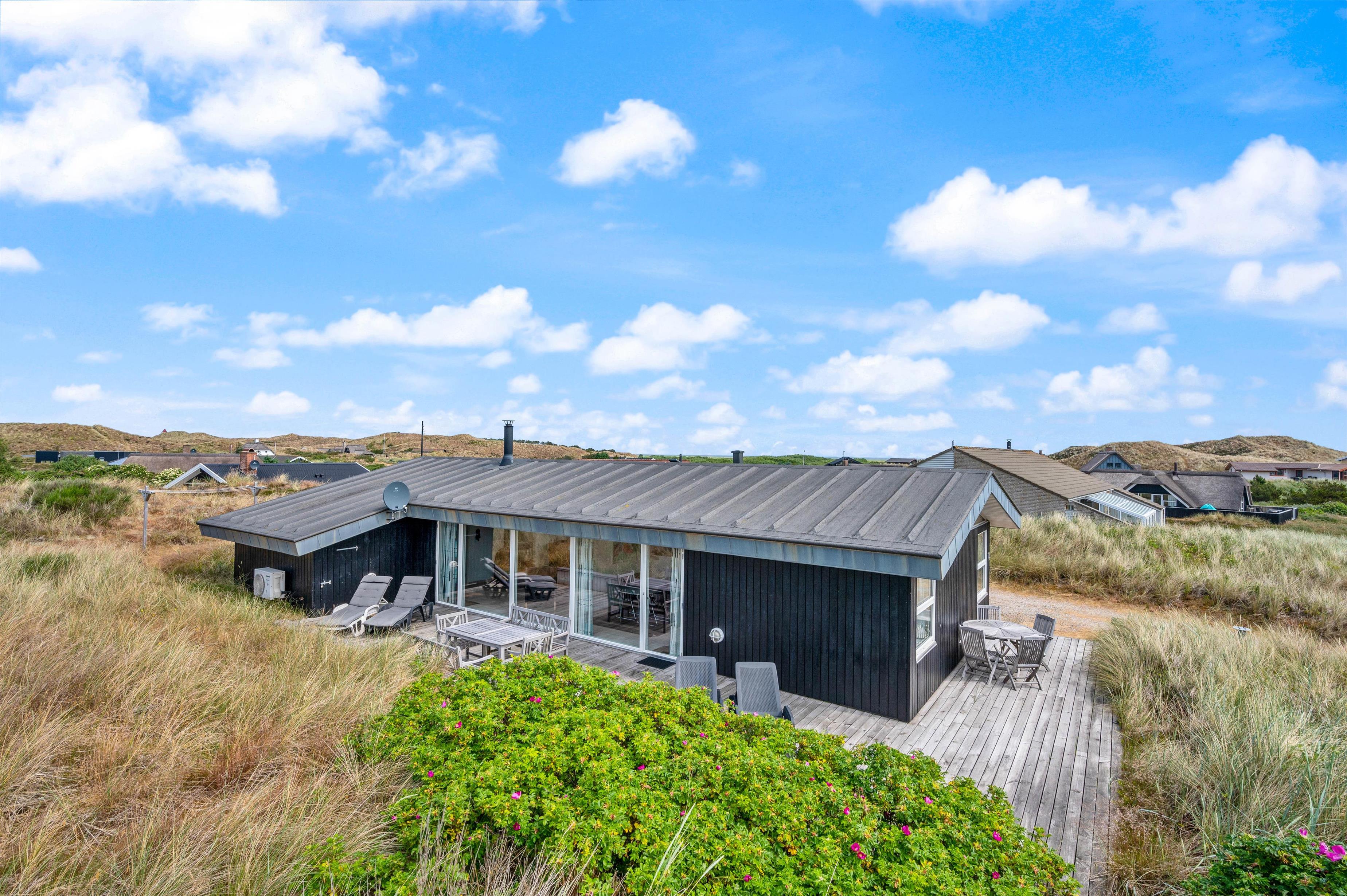 Der er skønne terrasser tilhørende sommerhuset. Mod øst er der en helt lukket terrasse, som er særdeles anvendelig i morgen og formiddagstimerne, og herfra kan I også se over Ringkøbing Fjord. Mod syd og mod vest er terrassen sammenhængende, og klitterne danner samtidig en god afskærmning, især mod vest.