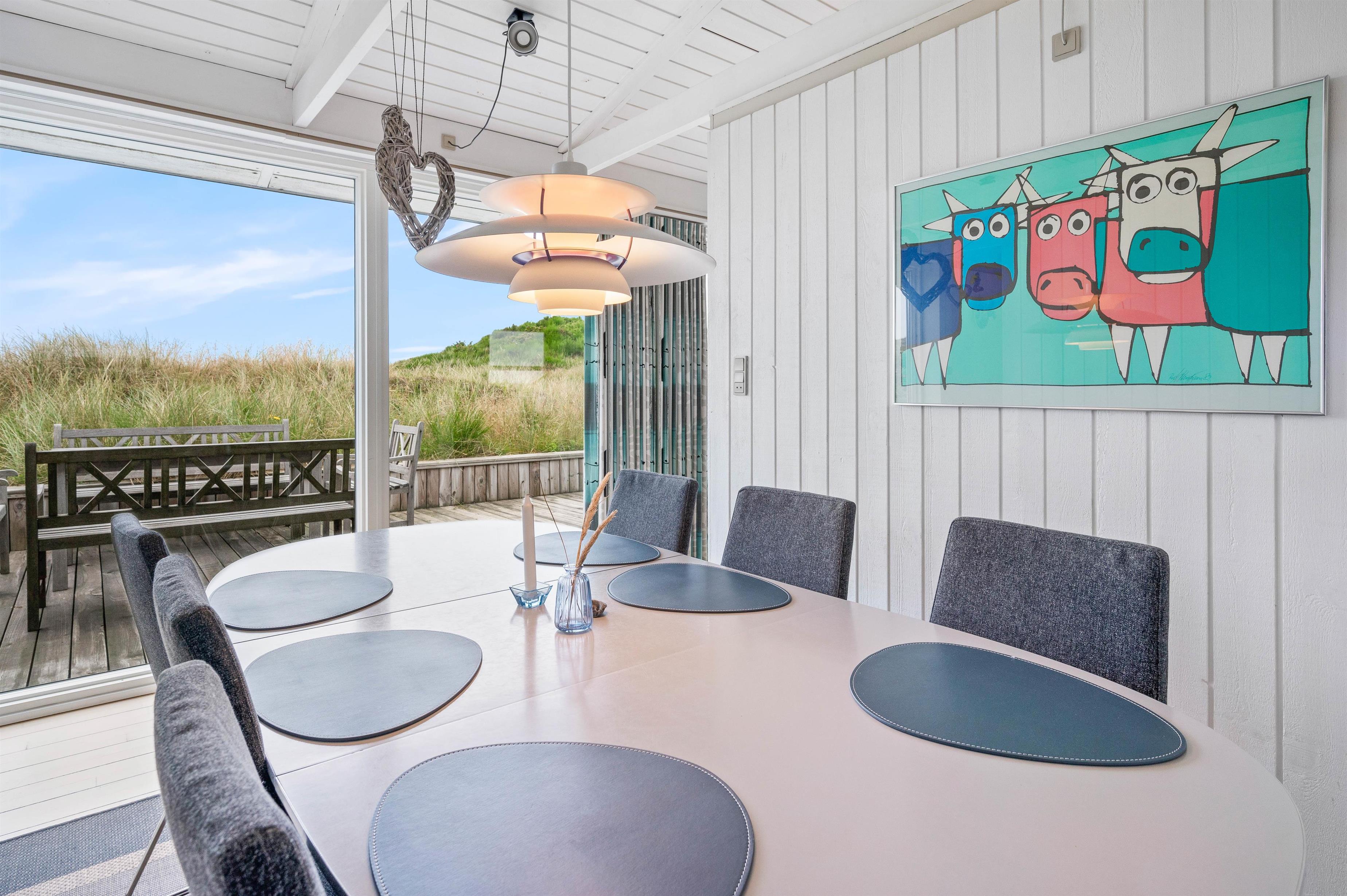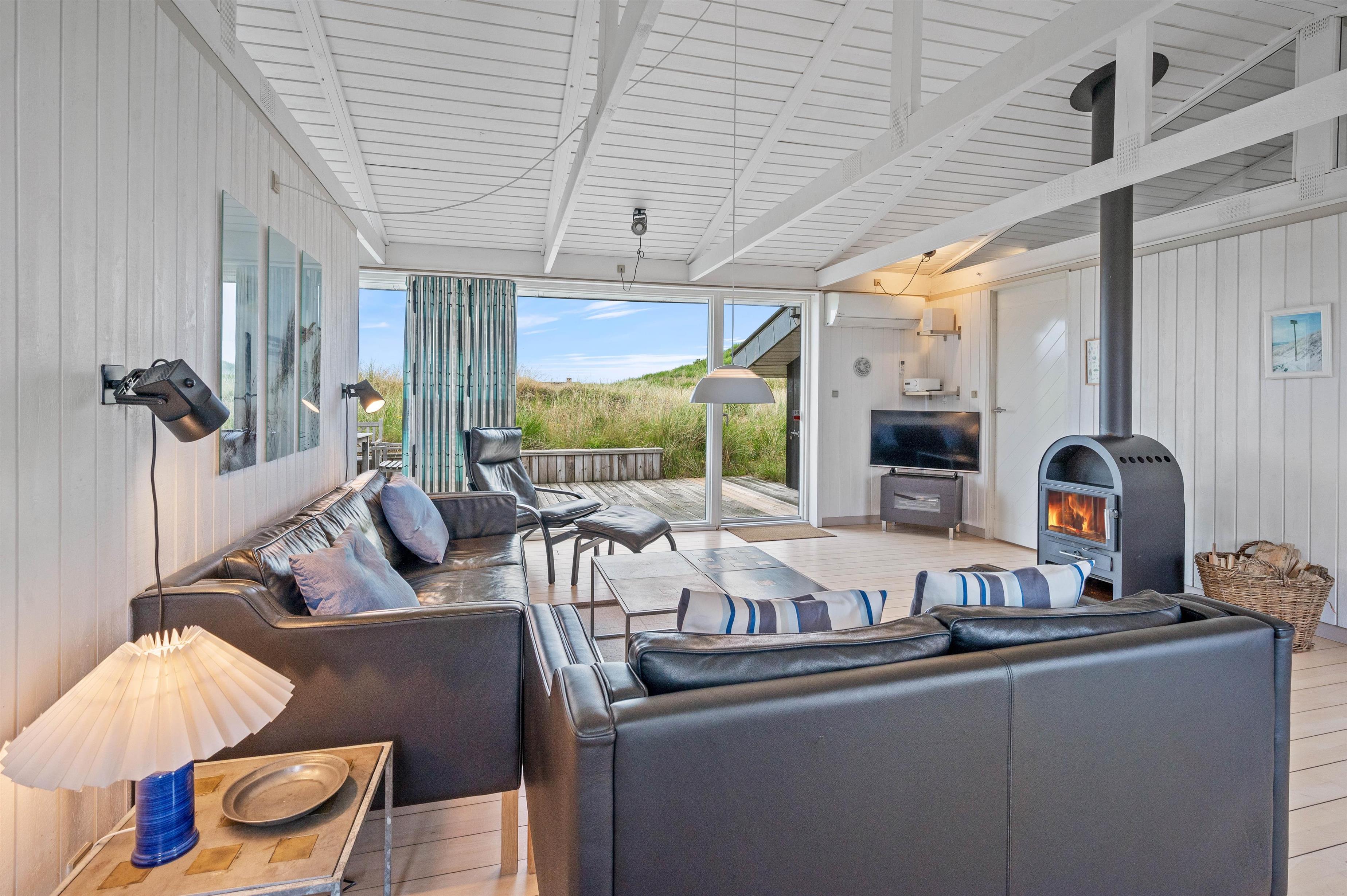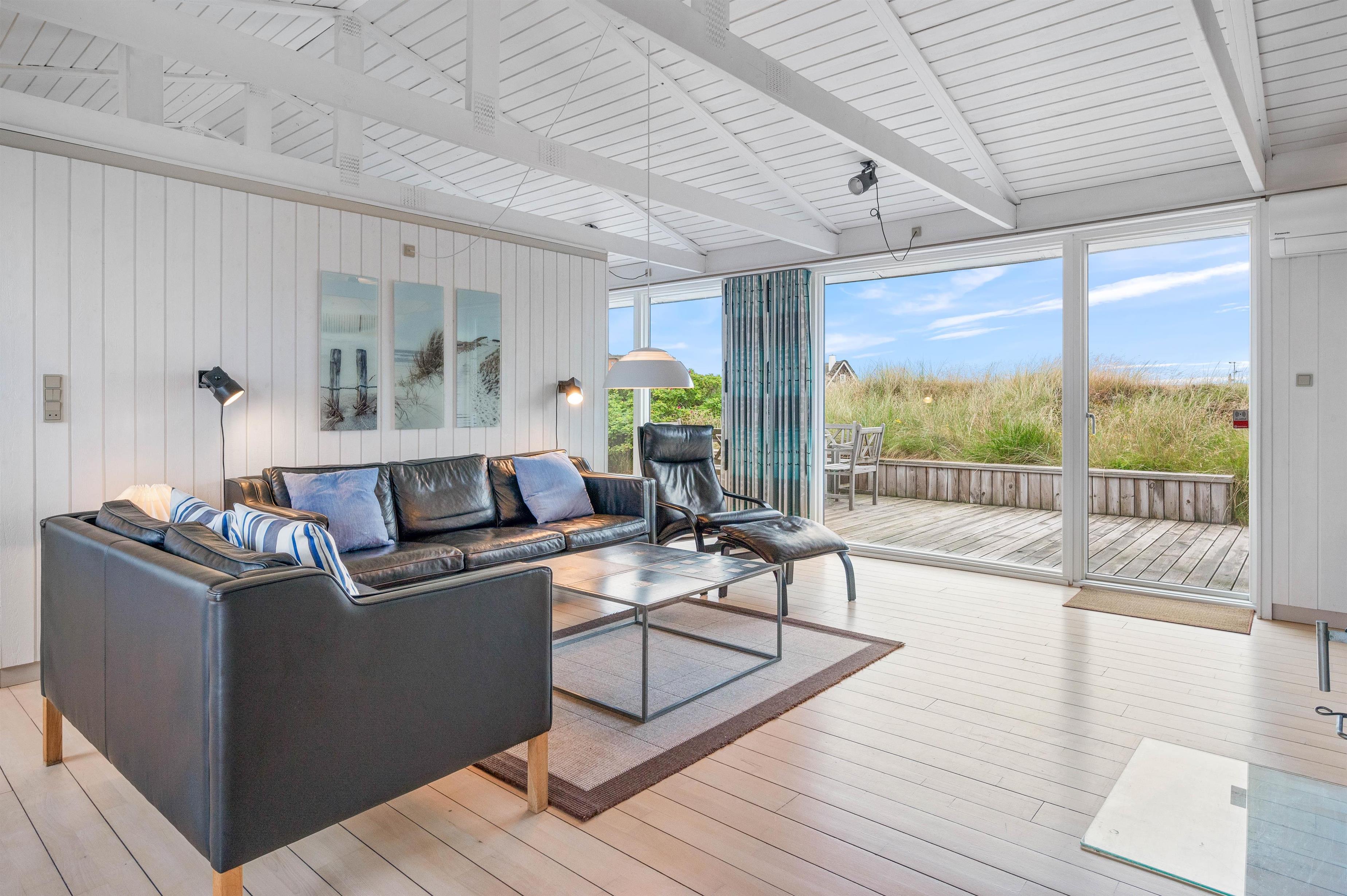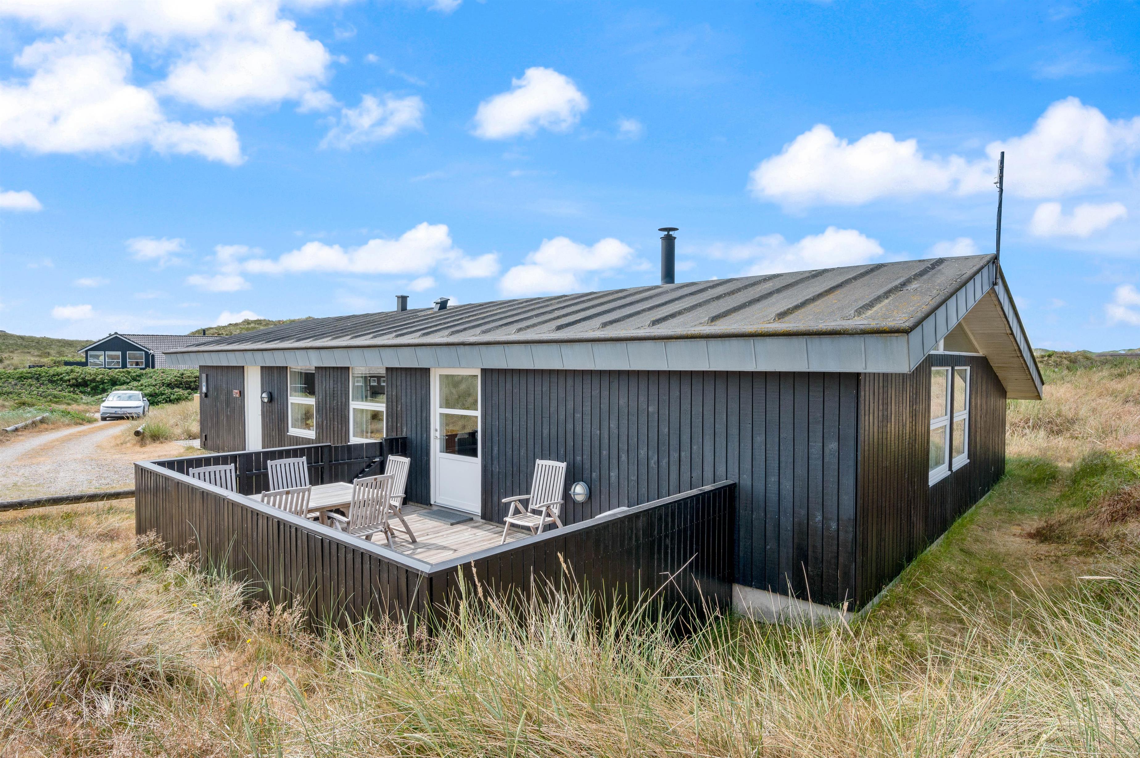 Der er skønne terrasser tilhørende sommerhuset. Mod øst er der en helt lukket terrasse, som er særdeles anvendelig i morgen og formiddagstimerne, og herfra kan I også se over Ringkøbing Fjord. Mod syd og mod vest er terrassen sammenhængende, og klitterne danner samtidig en god afskærmning, især mod vest.