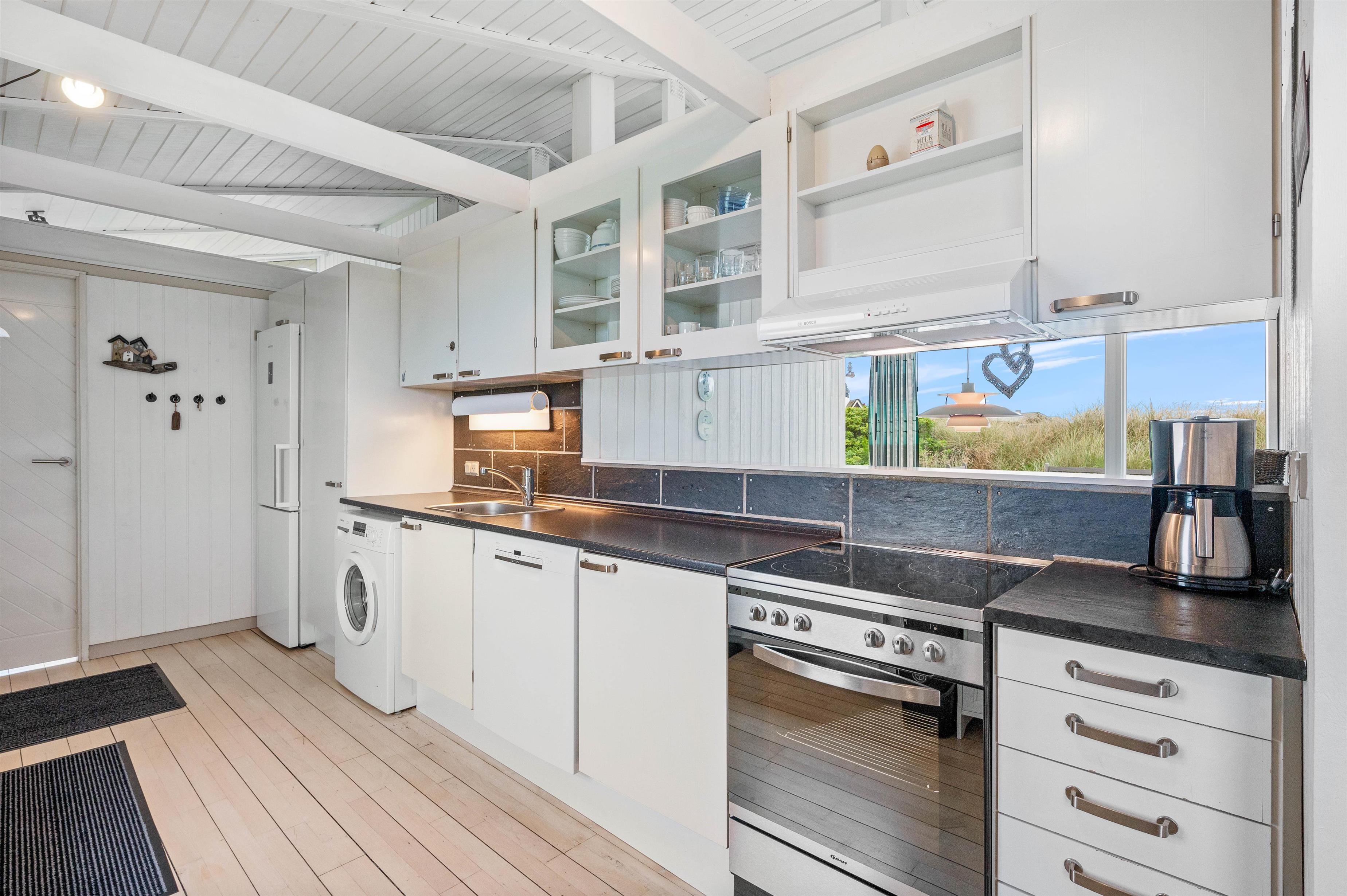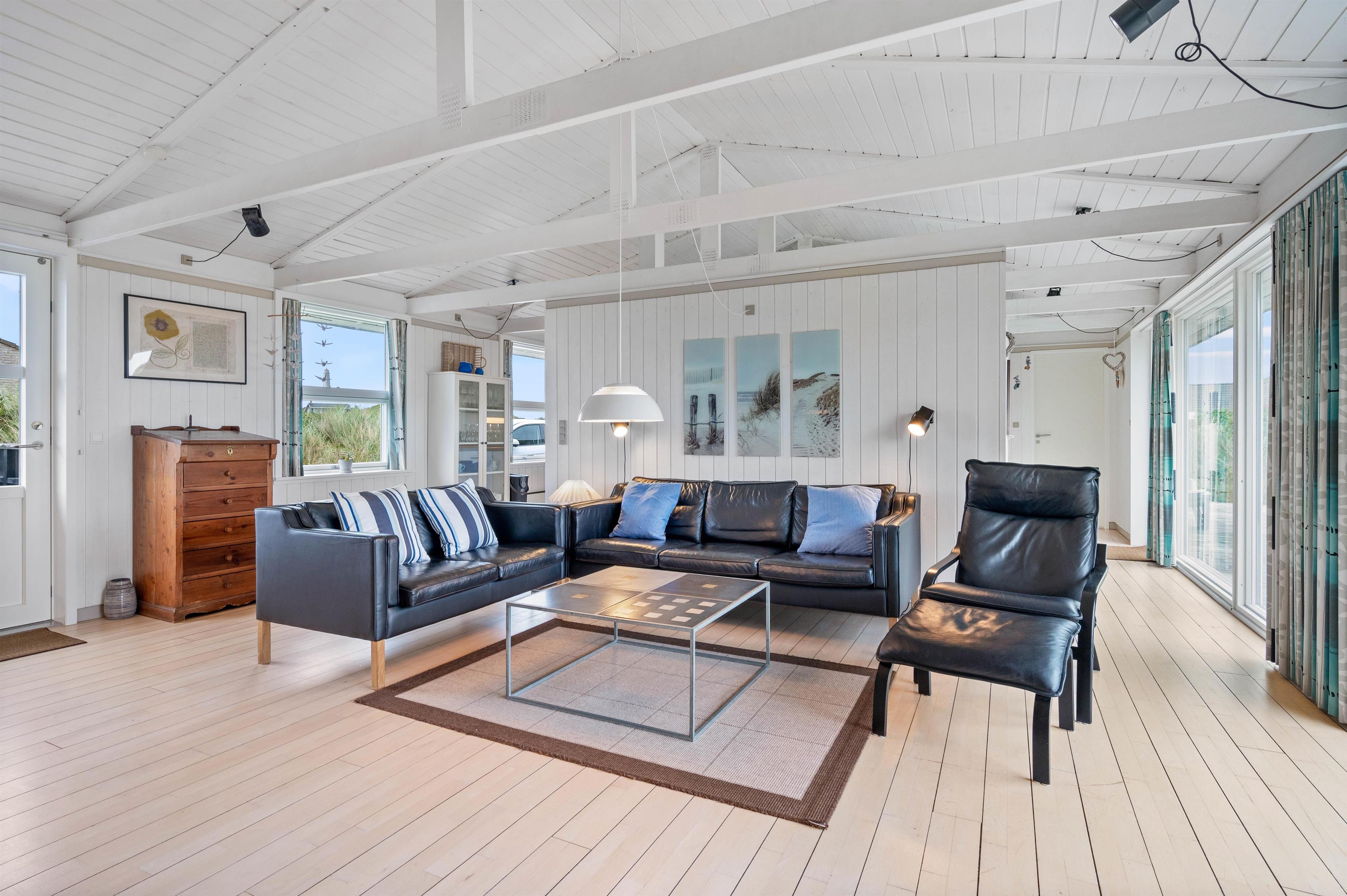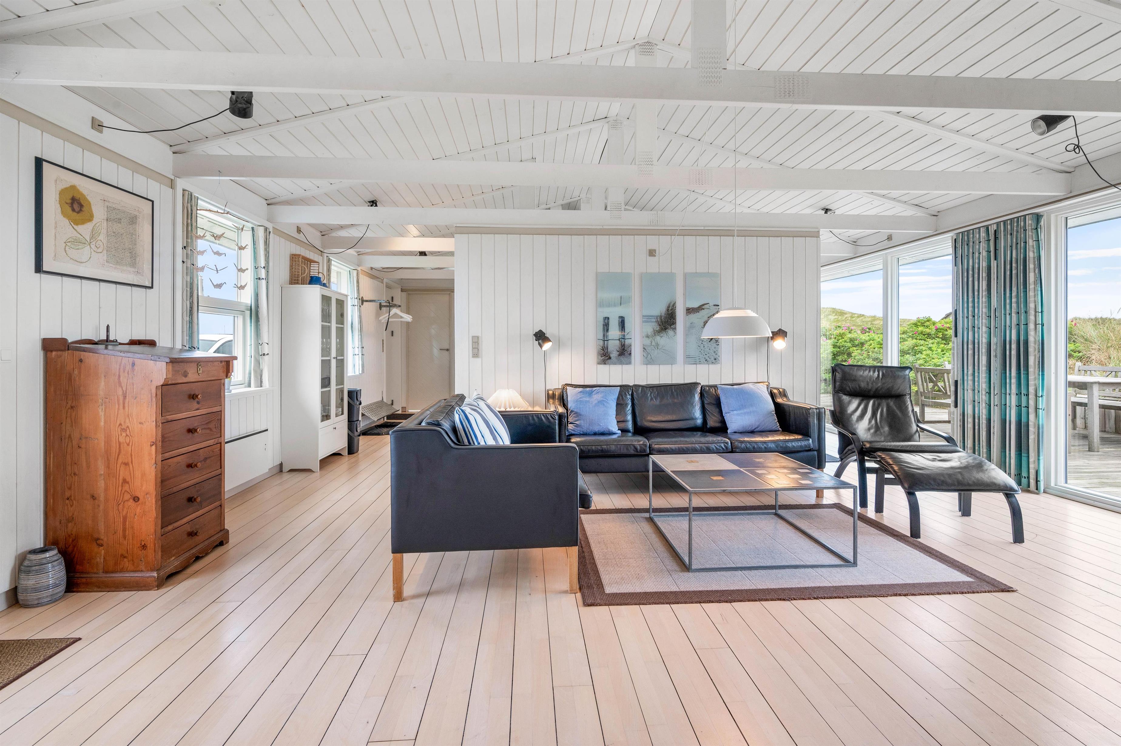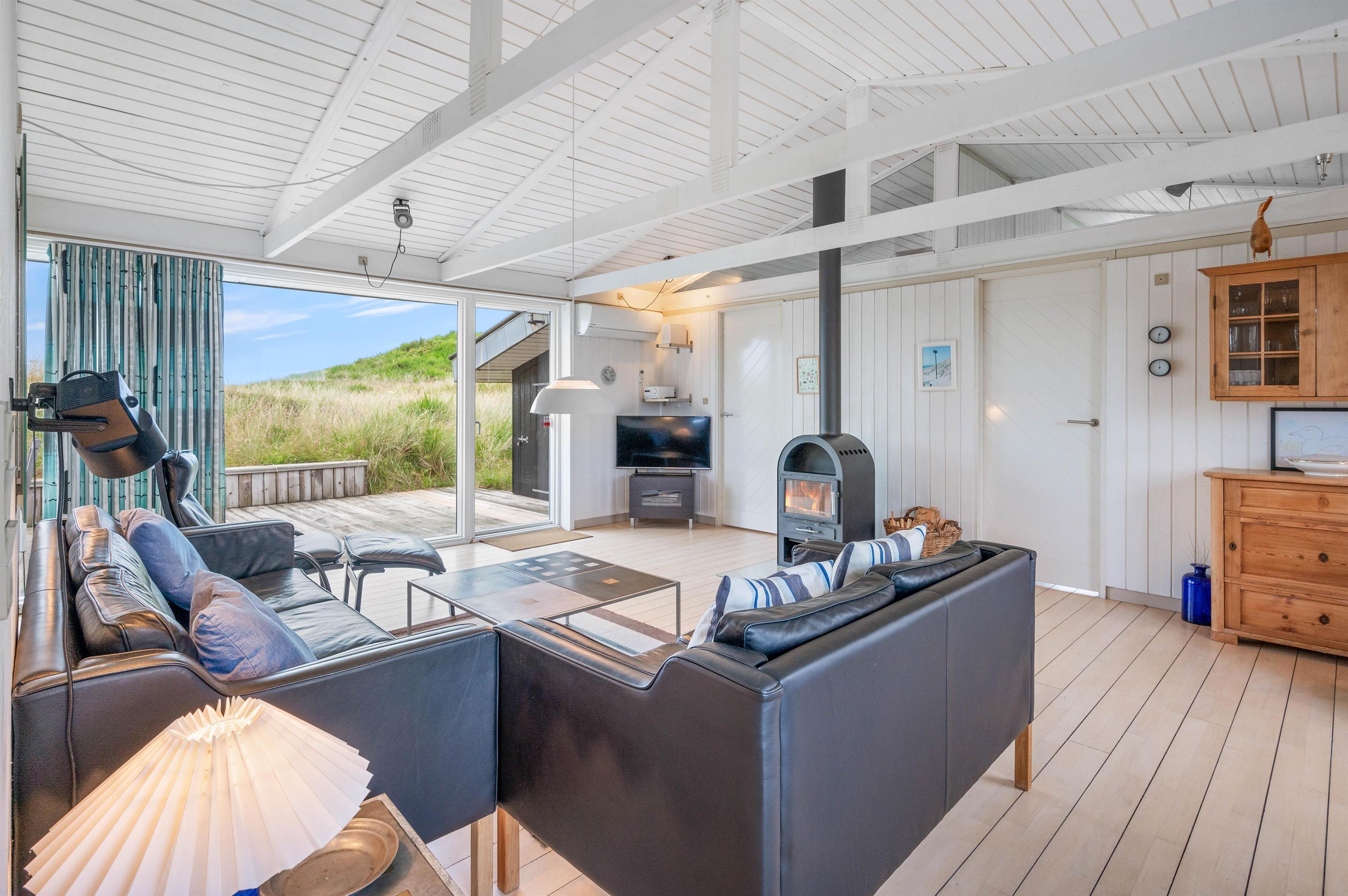 Sommerhuset er på 114 m2 fordelt på 4 værelser, køkken/stue og et badeværelse med sauna. Fra køkkenet er der en skøn udsigt mod øst og vest, ligesom der fra stuen er en vidunderlig udsigt mod vest. De lyse trægulve er flotte og passer godt ind i sommerhusets arkitektur. Sommerhuset indeholder bl.a. gratis trådløst internet, vaskemaskine, brændeovn og varmepumpe.