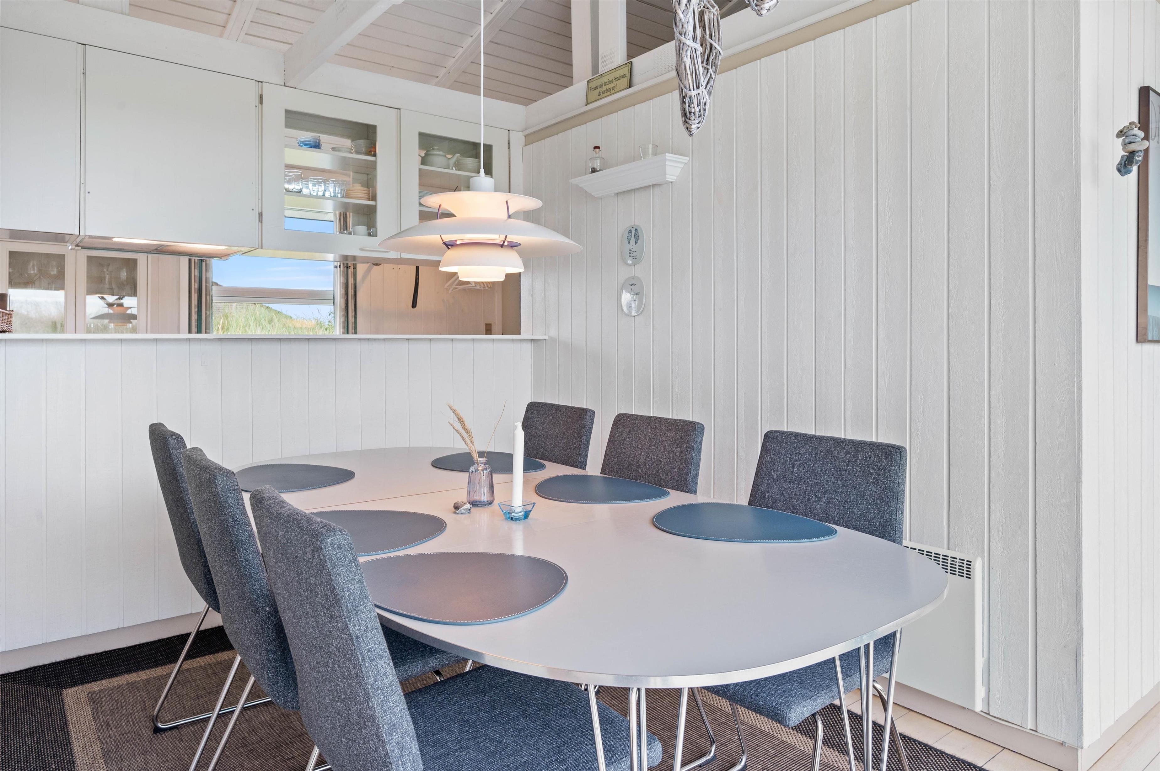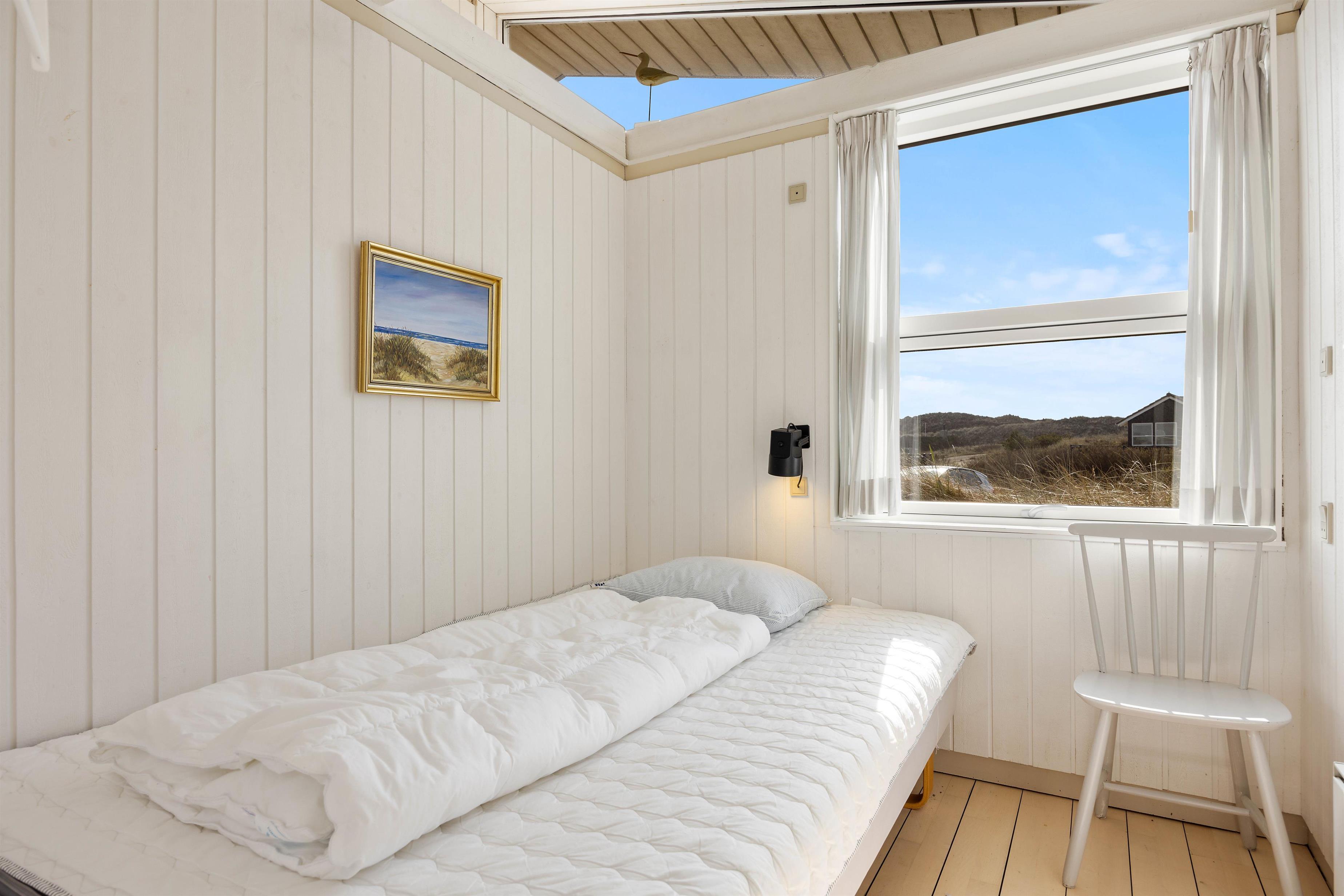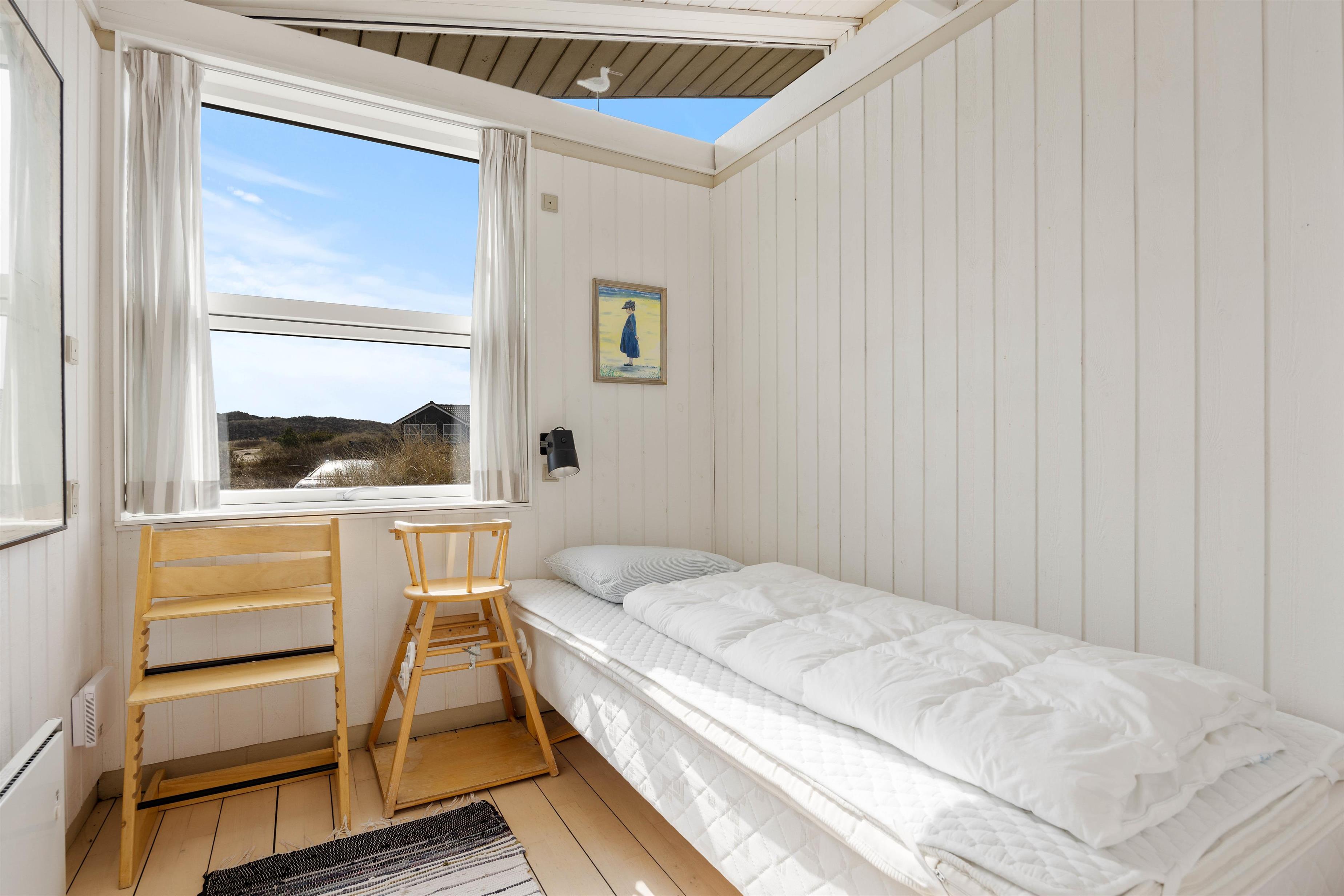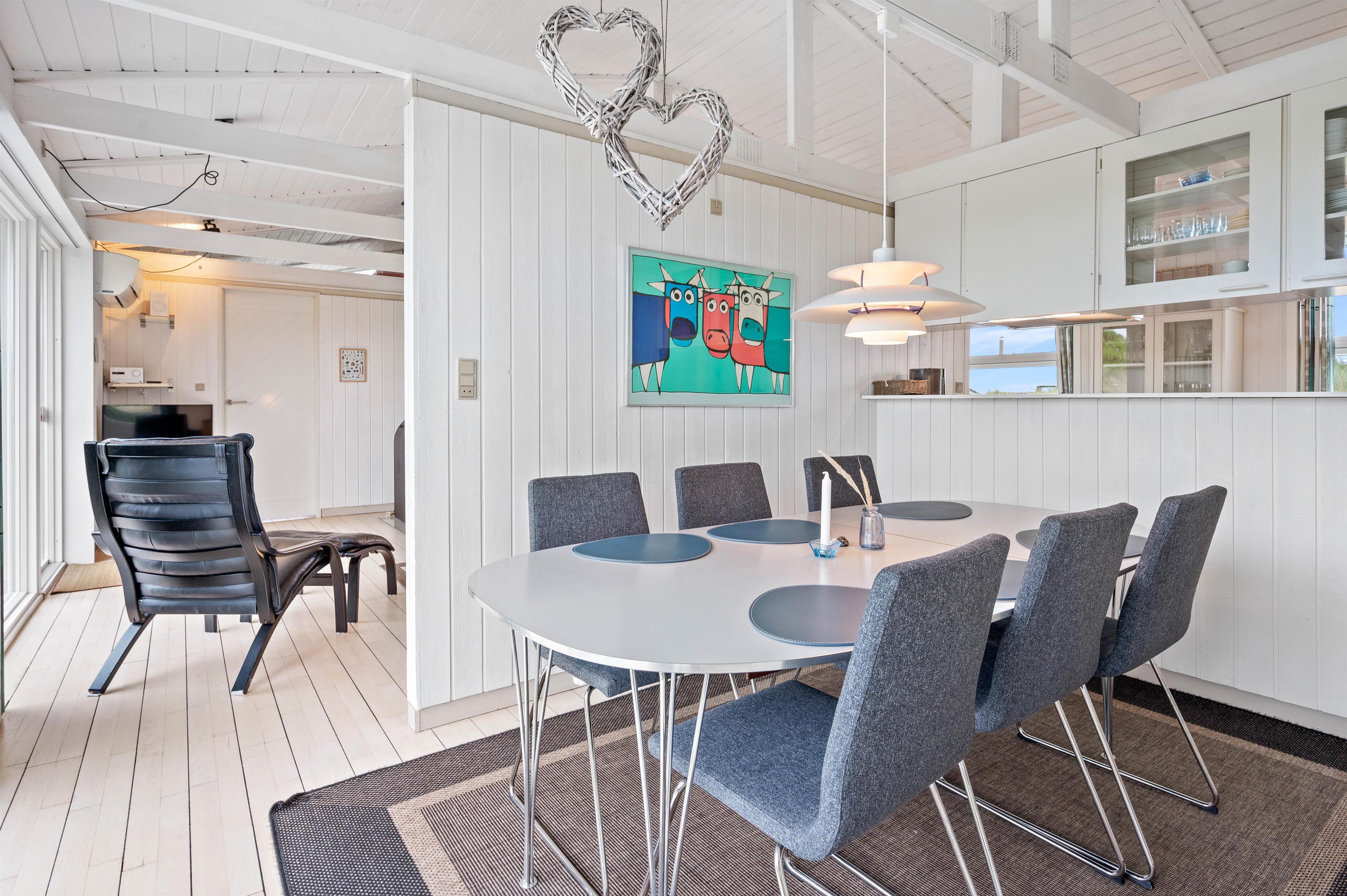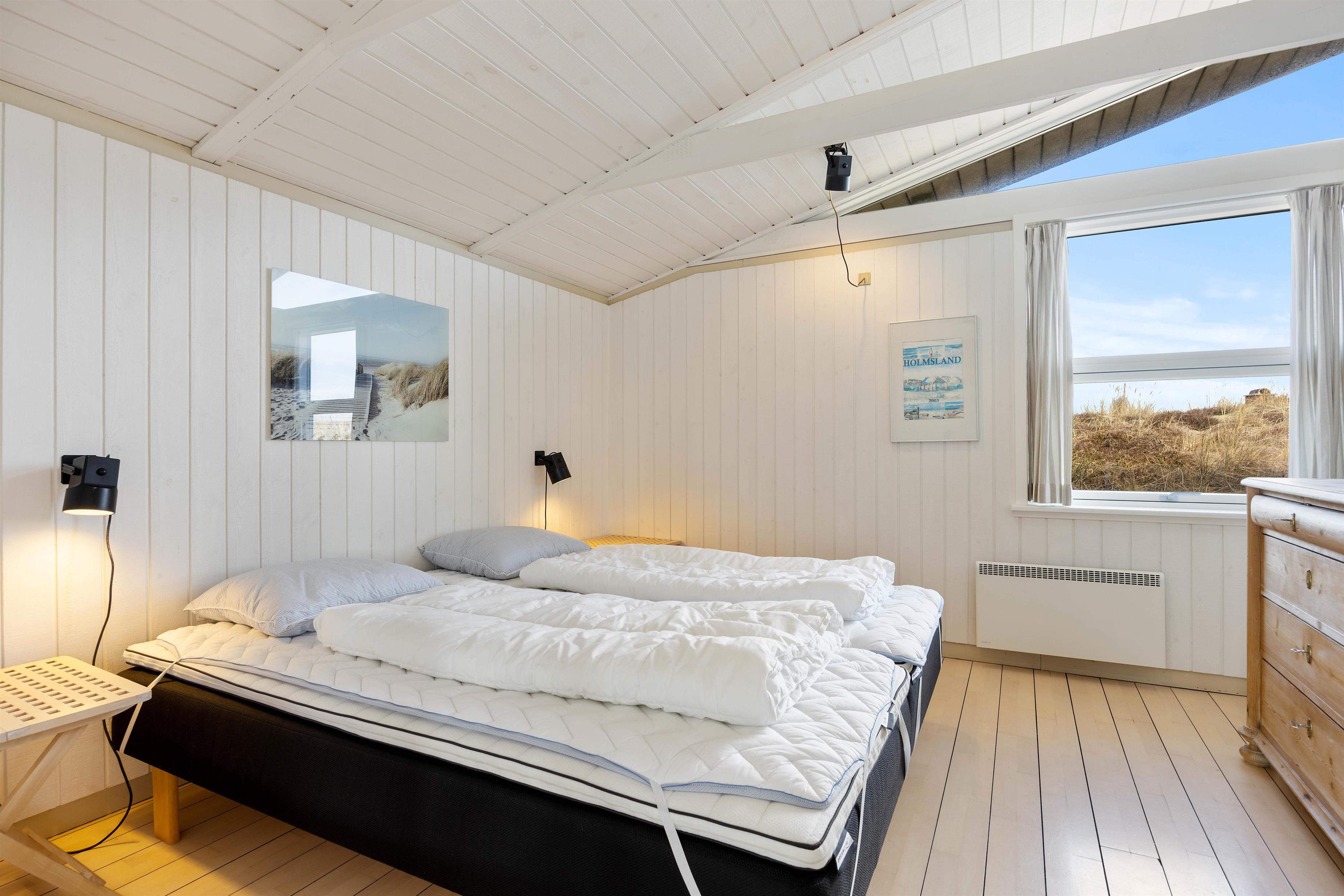 Sommerhuset er på 114 m2 fordelt på 4 værelser, køkken/stue og et badeværelse med sauna. Fra køkkenet er der en skøn udsigt mod øst og vest, ligesom der fra stuen er en vidunderlig udsigt mod vest. De lyse trægulve er flotte og passer godt ind i sommerhusets arkitektur. Sommerhuset indeholder bl.a. gratis trådløst internet, vaskemaskine, brændeovn og varmepumpe.