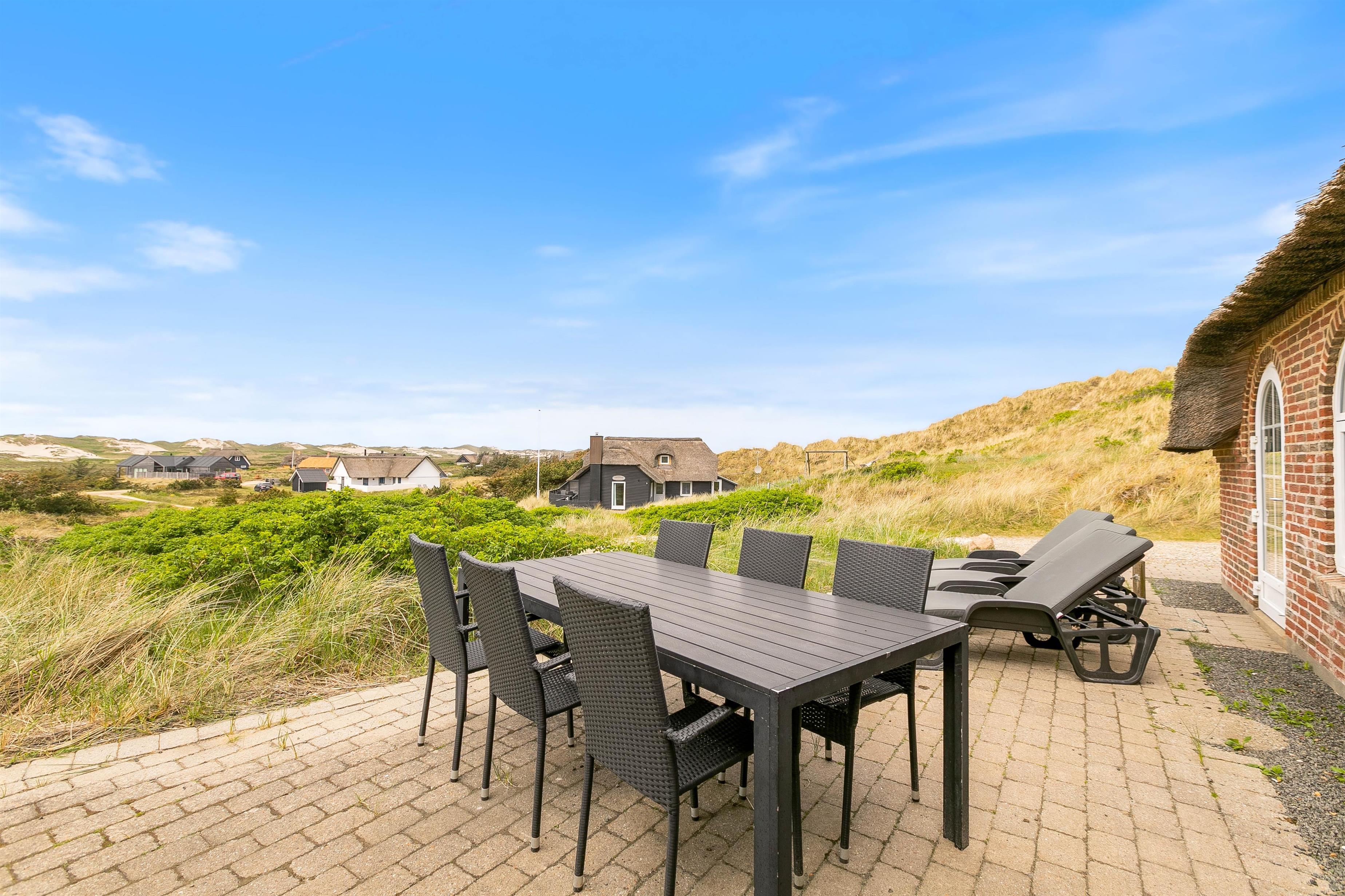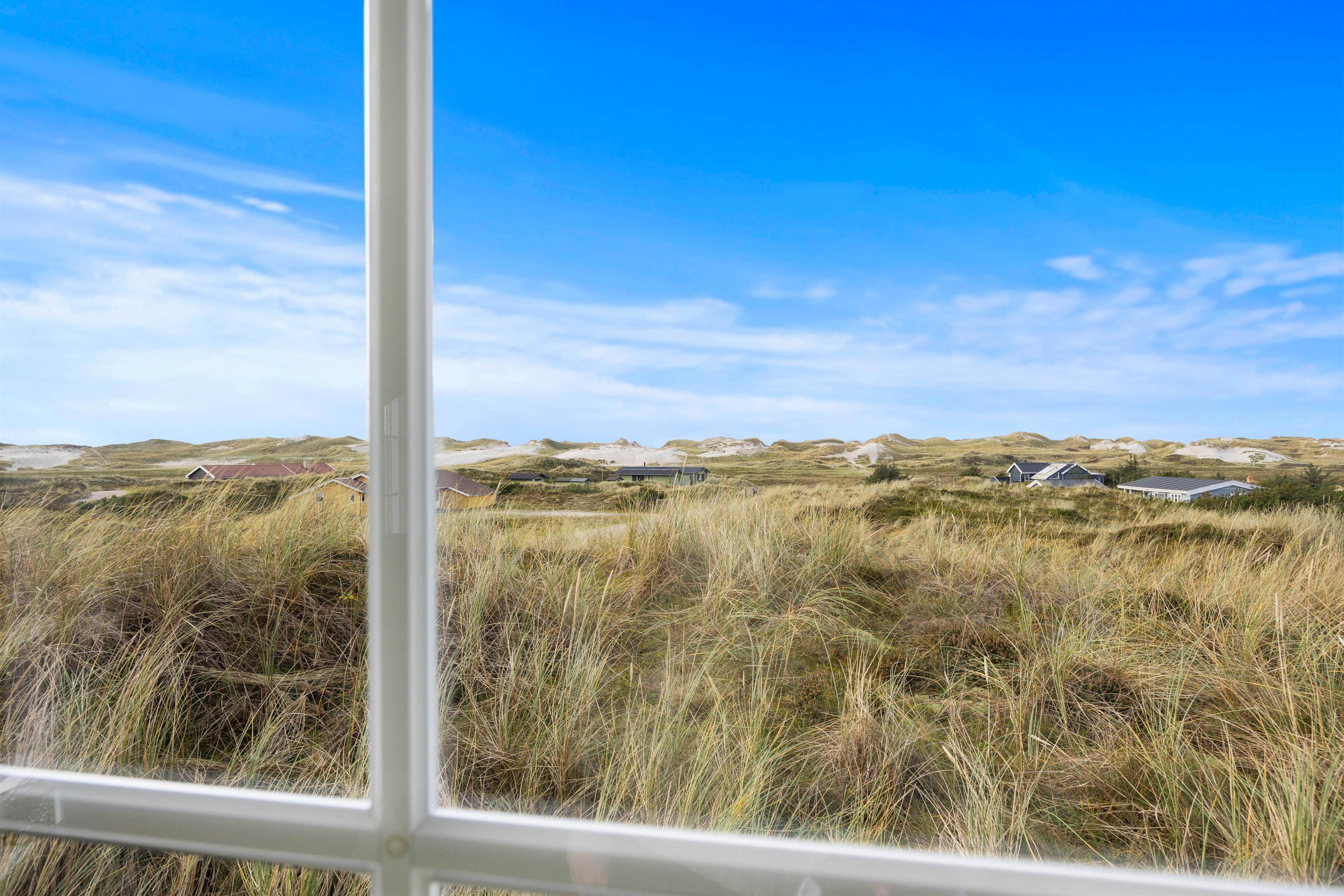 Sommerhuset ligger højt placeret på en kuperet klitgrund, hvorfra der er en skøn udsigt mod syd og vest. Der er fliser hele vejen rundt med særlig god terrasseplads mod øst og vest. Her er der rig mulighed for at nyde solen hele dagen lang. For de små er der en sandkasse.