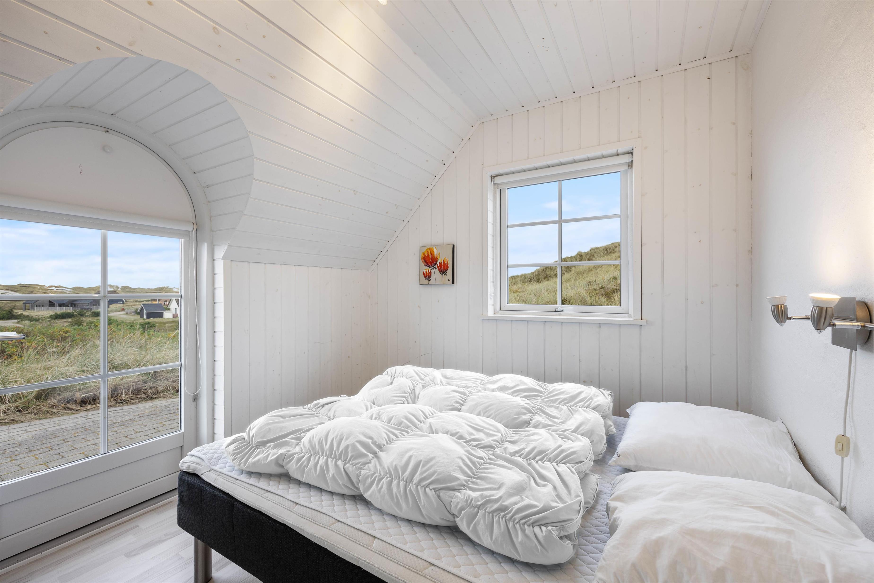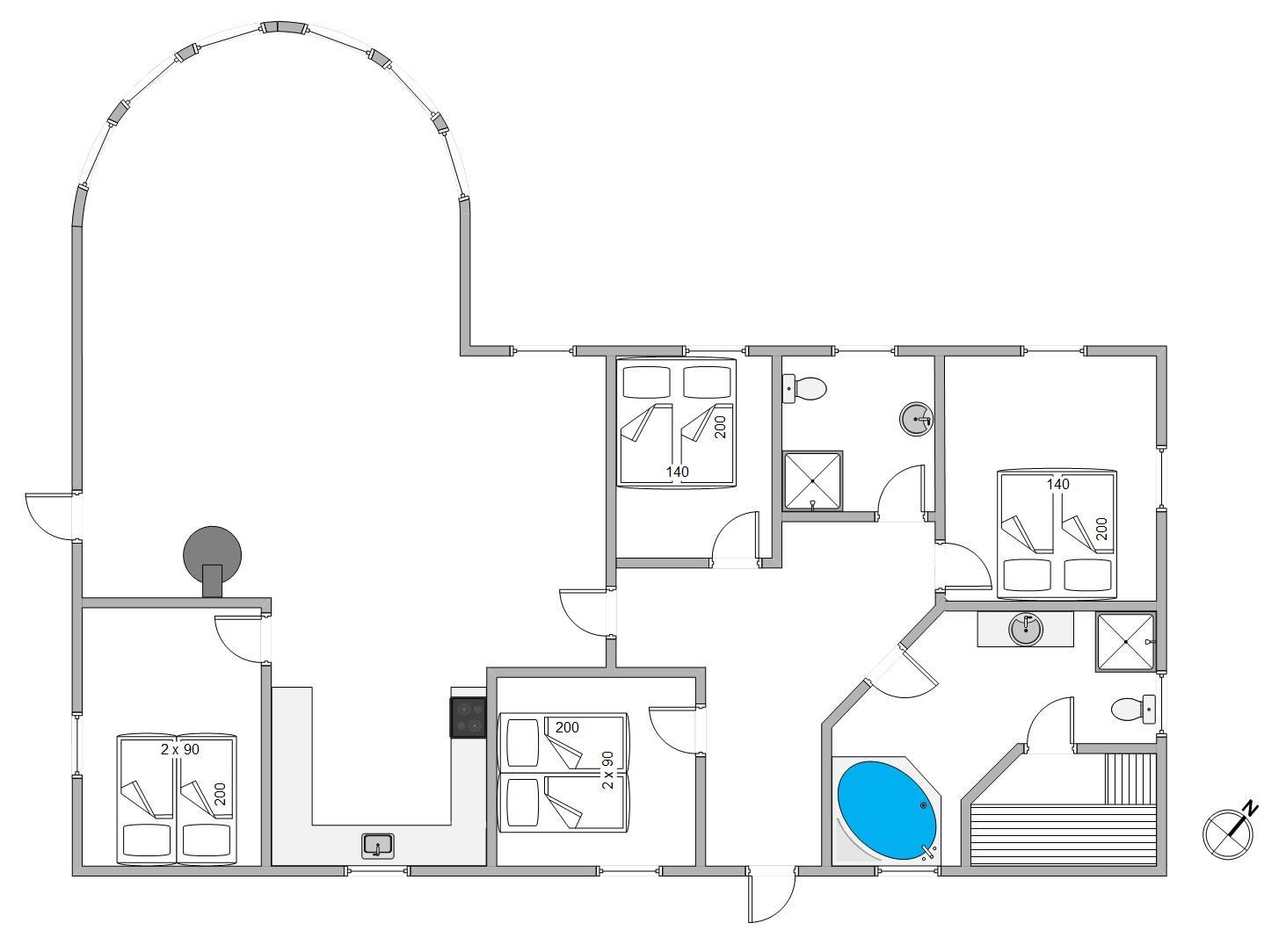 Her er 4 gode værelser alle med dobbeltsenge, hvoraf 3 har målene 180x200 og det fjerde 140x200. Alle er rummelige og har indbyggede skabe, så kufferter osv. kan gemmes af vejen. Som skrevet er feriehuset også oplagt til to familier, da der er to badeværelser, så hver familie kan få sit eget – begge med gulvvarme. På det største badeværelse er der både sauna og spa. Det indbyder ikke alene til selvforkælelse og ren afslapning med tændte stearinlys for de voksne. Men også til leg i de varme bobler for børnene. Ekstra praktisk for børnefamilien er her installeret vaskemaskine og tørretumbler.