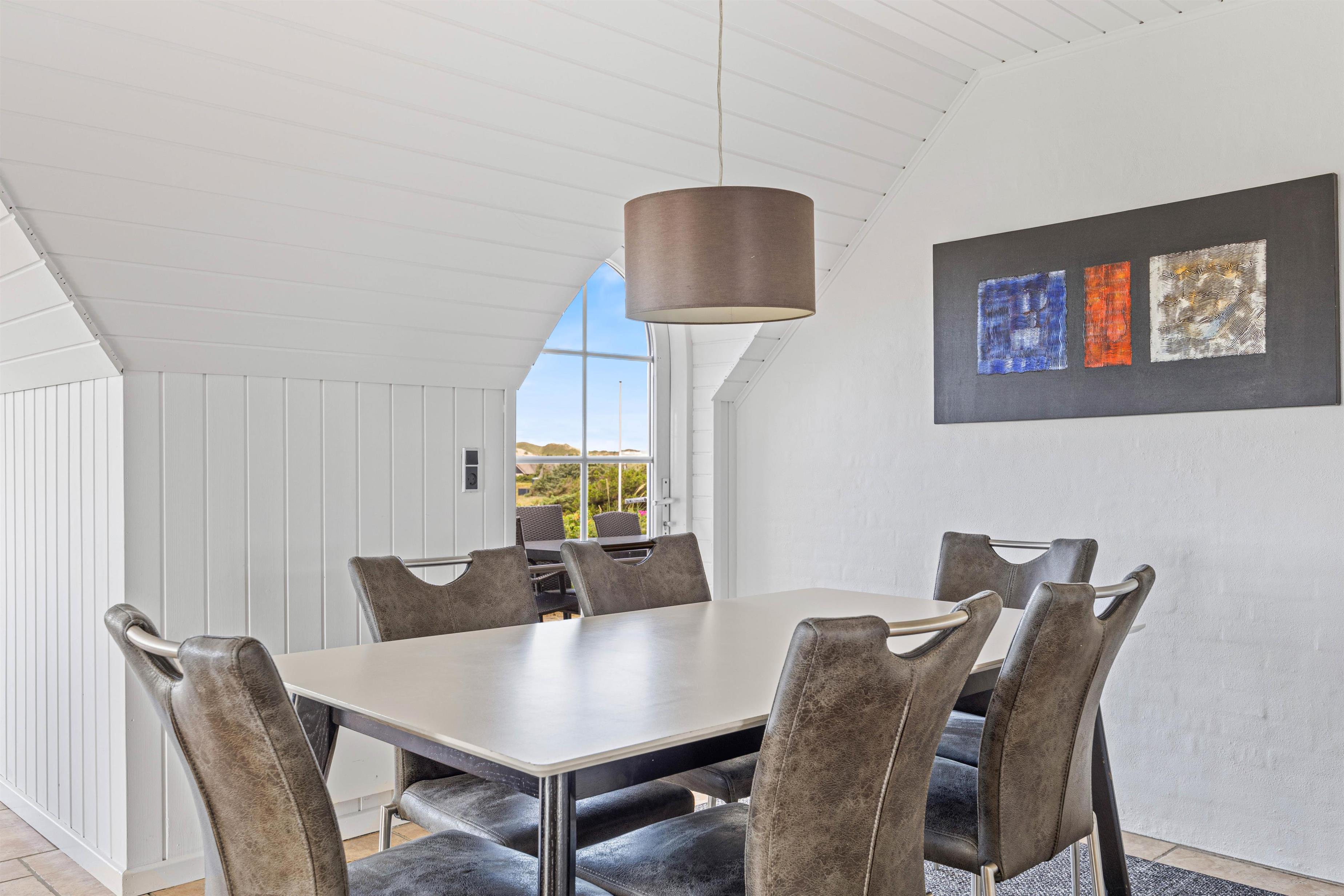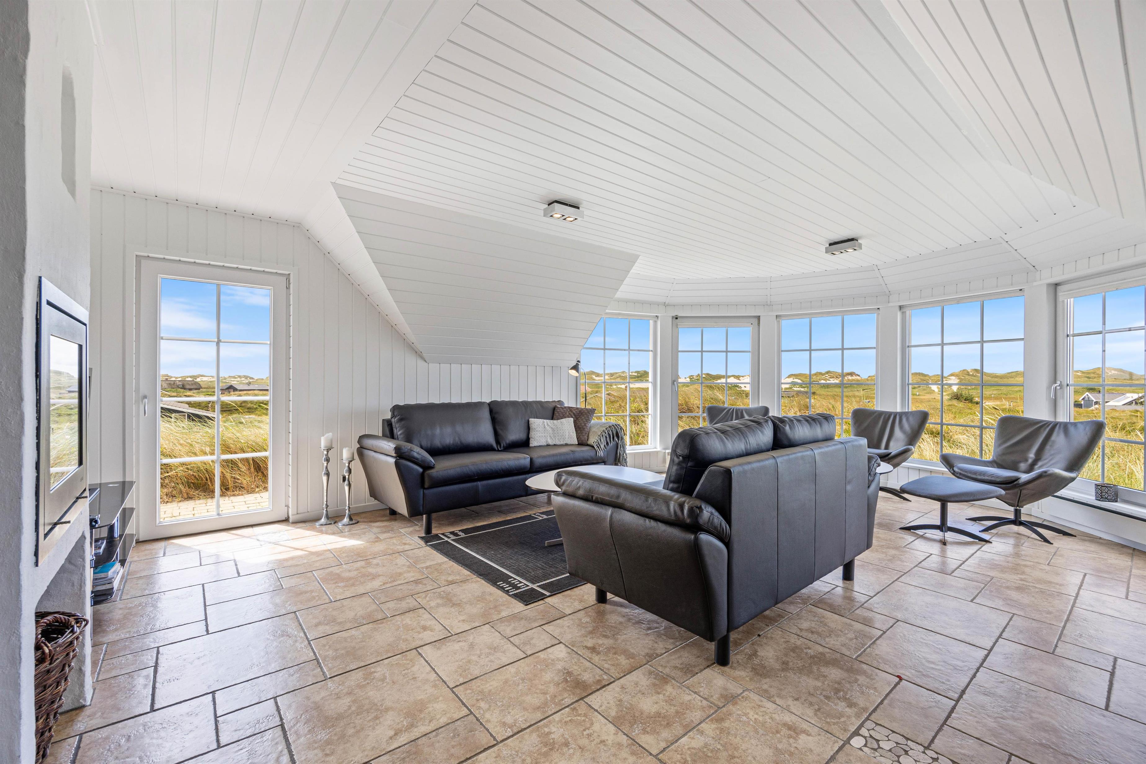 Den tidsløse og lyse indretning giver feriehuset en rolig atmosfære – den helt rigtige stemning til en afslappende ferie. Det store alrum kombinerer køkken, spiseafdeling og stue, hvorfra der er den smukkeste panoramaudsigt. Her er der plads til at være sammen og nyde tiden med hinanden i nuet. Hyg jer med fælles madlavning, sjove spil eller en god bog og kop kaffe fra lænestolen. For at skabe lidt ekstra hygge på en køligere regnvejrsdag, kan I tænde op i brændeovnen.