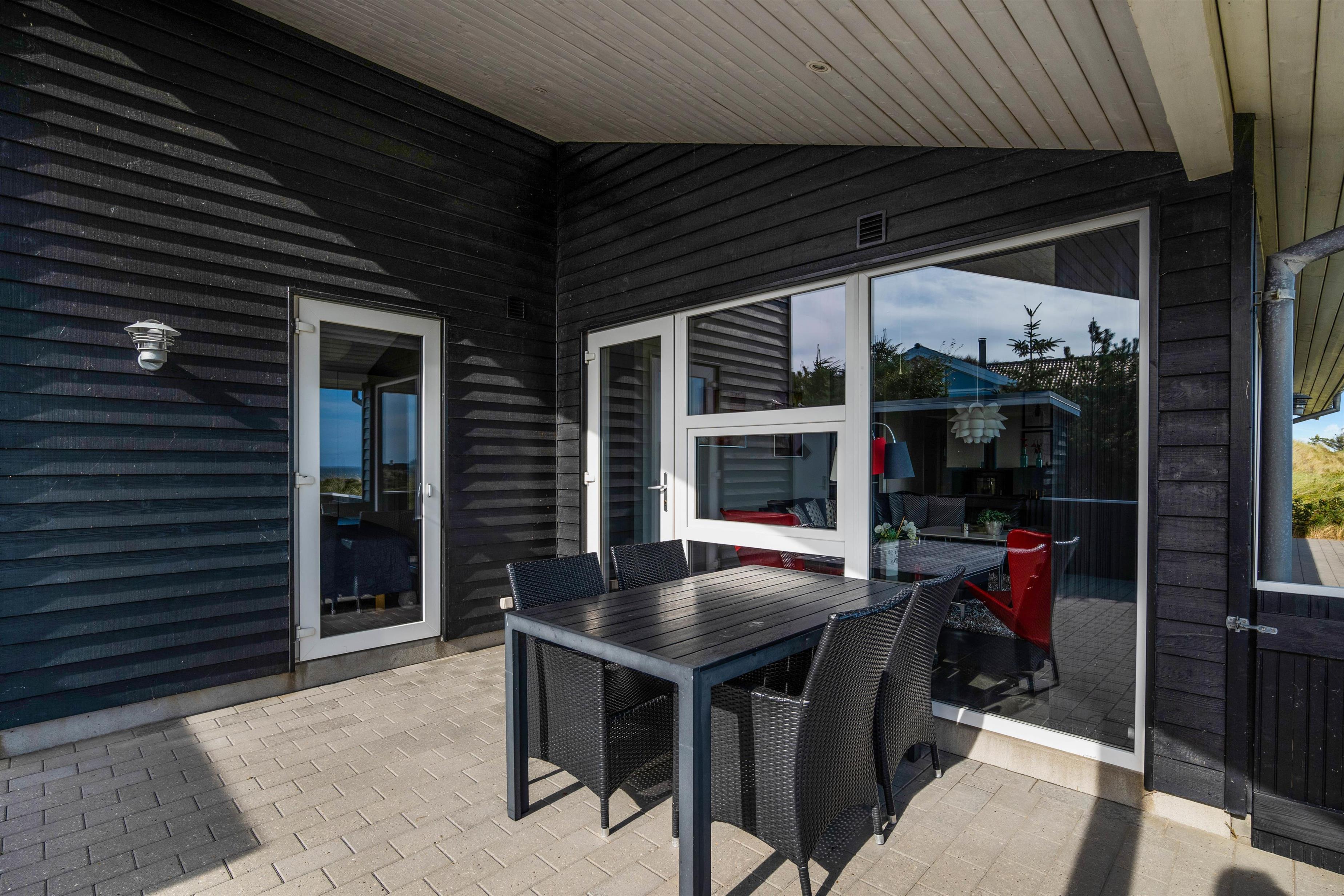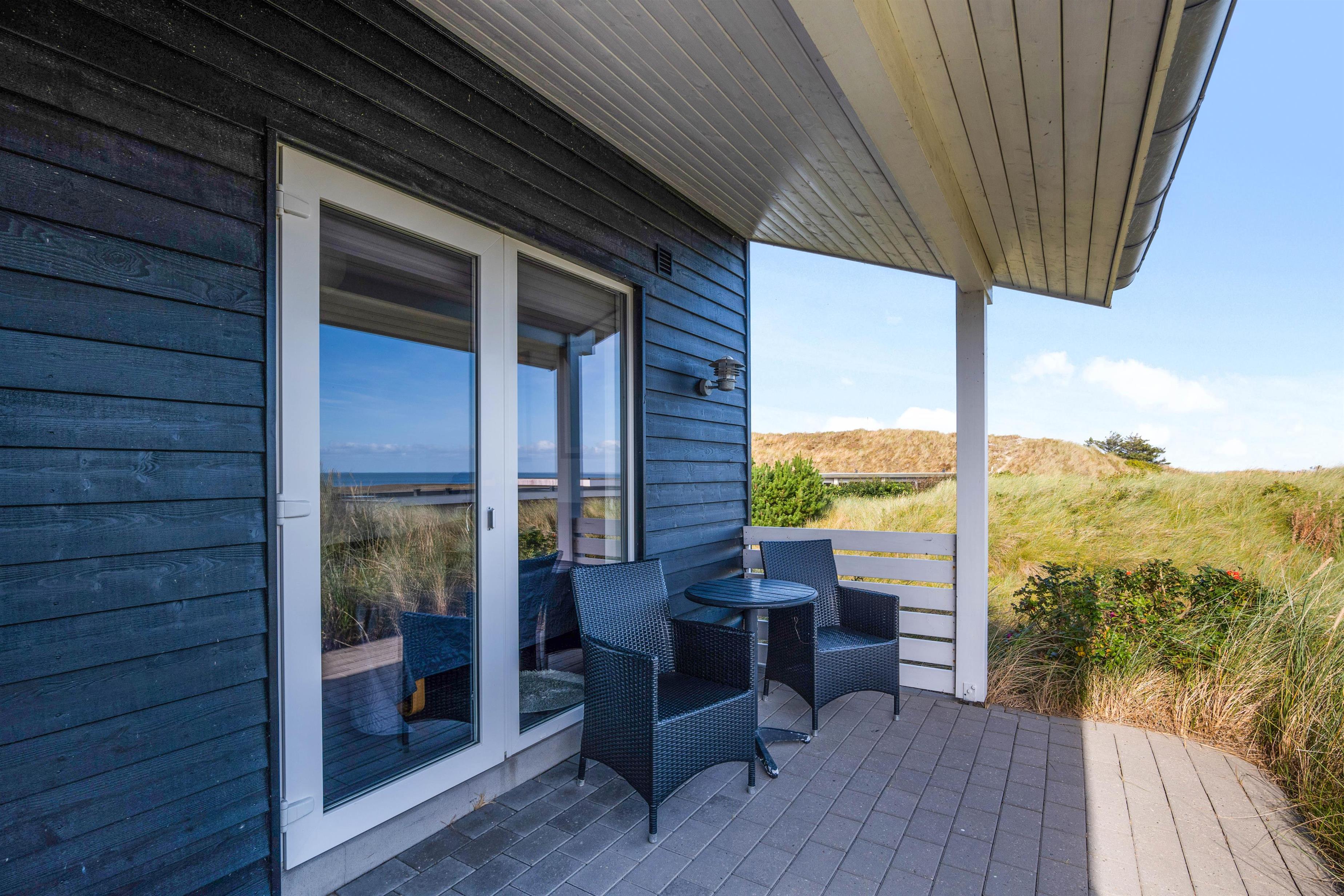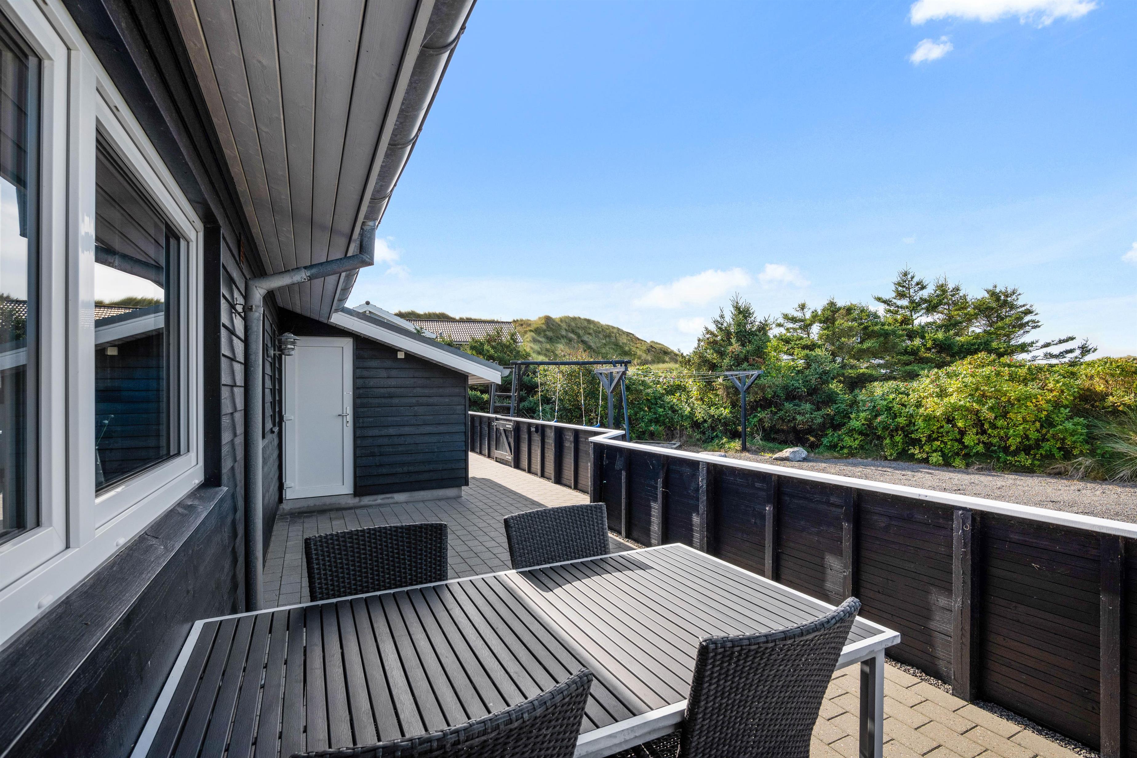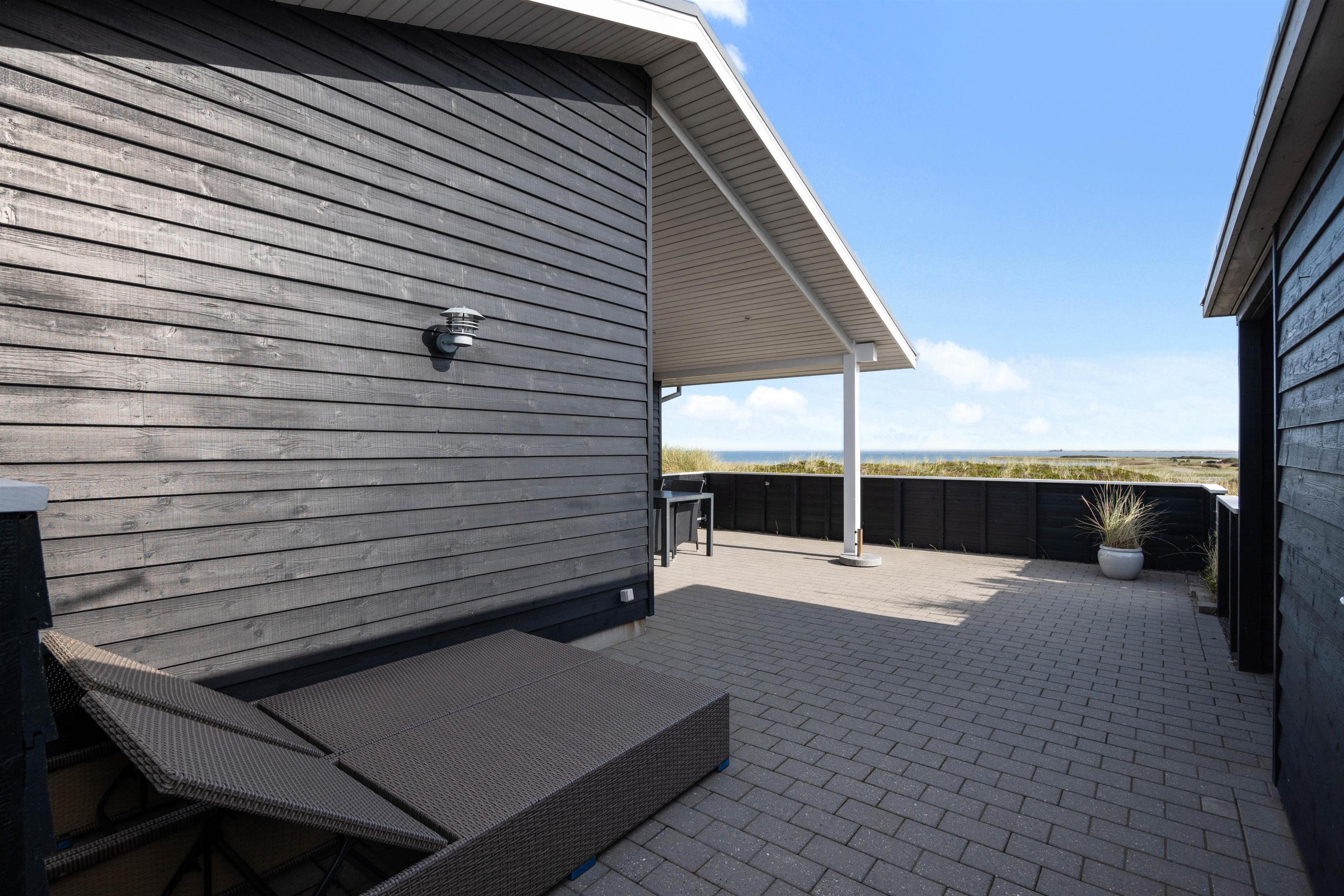 Feriehuset har en flot afskærmet terrasse med pragtfuld udsigt. Terrassen er udstyret med liggestole, havemøbler og grill. Her er desuden indrettet et godt udekøkken med fiskerenseplads.