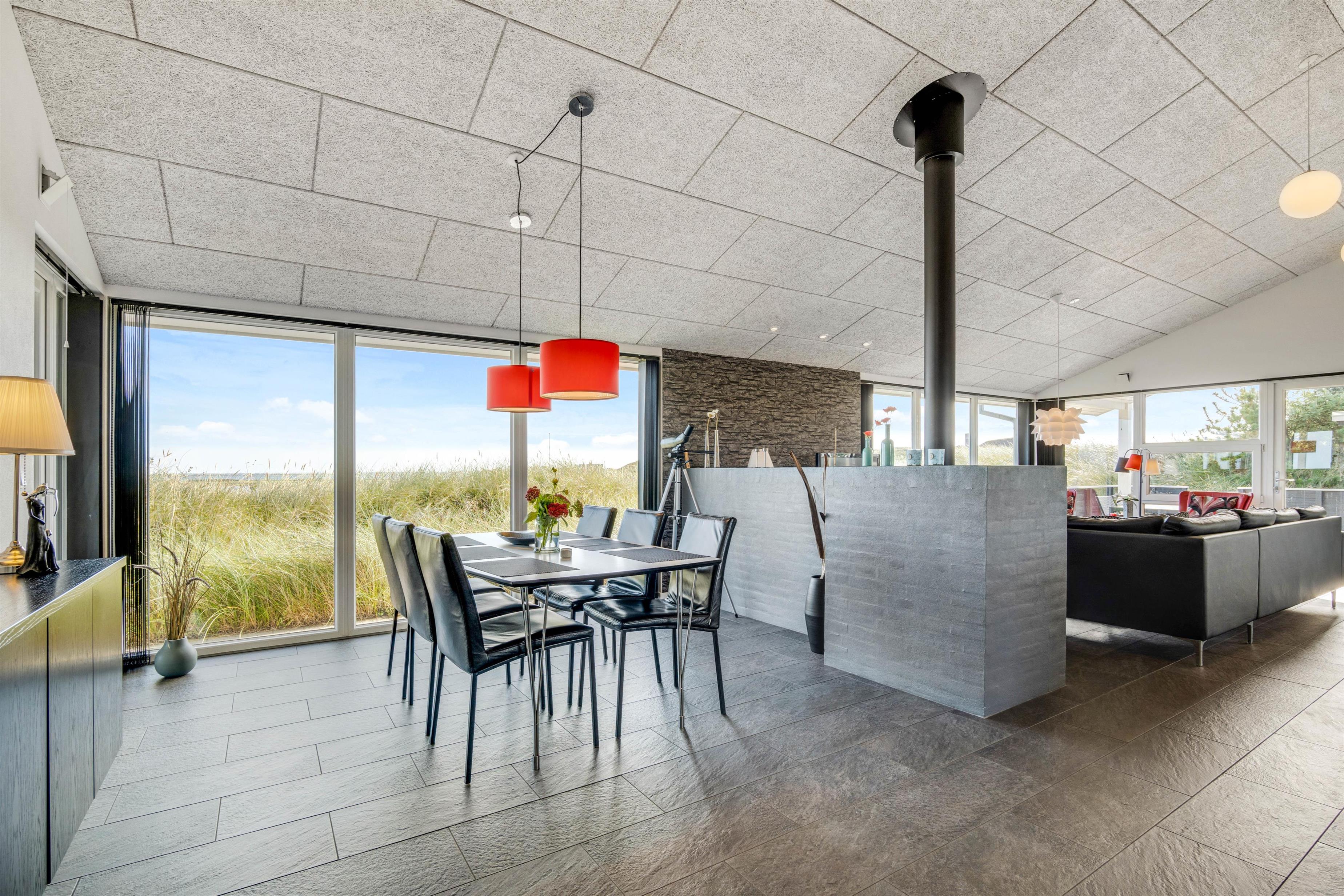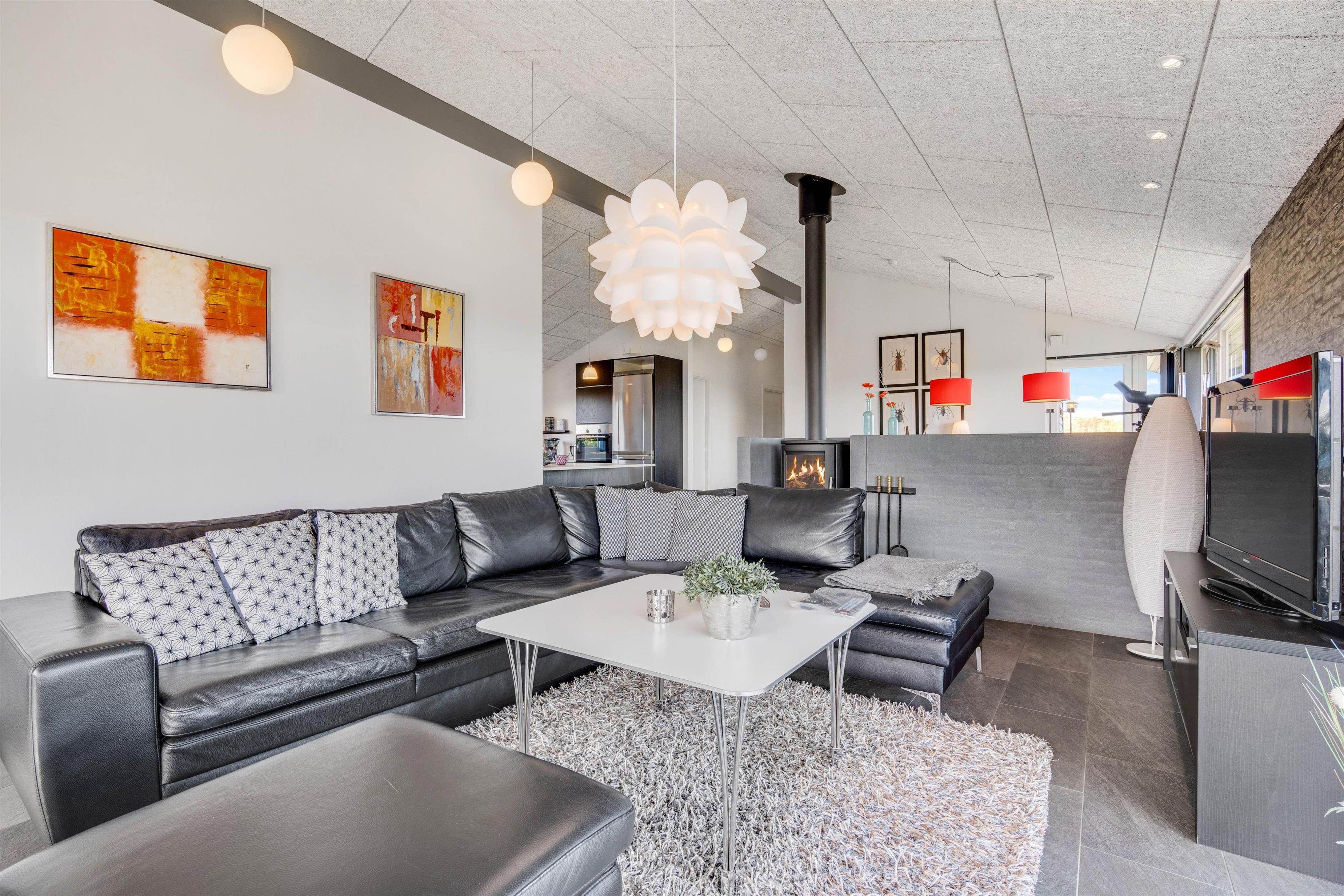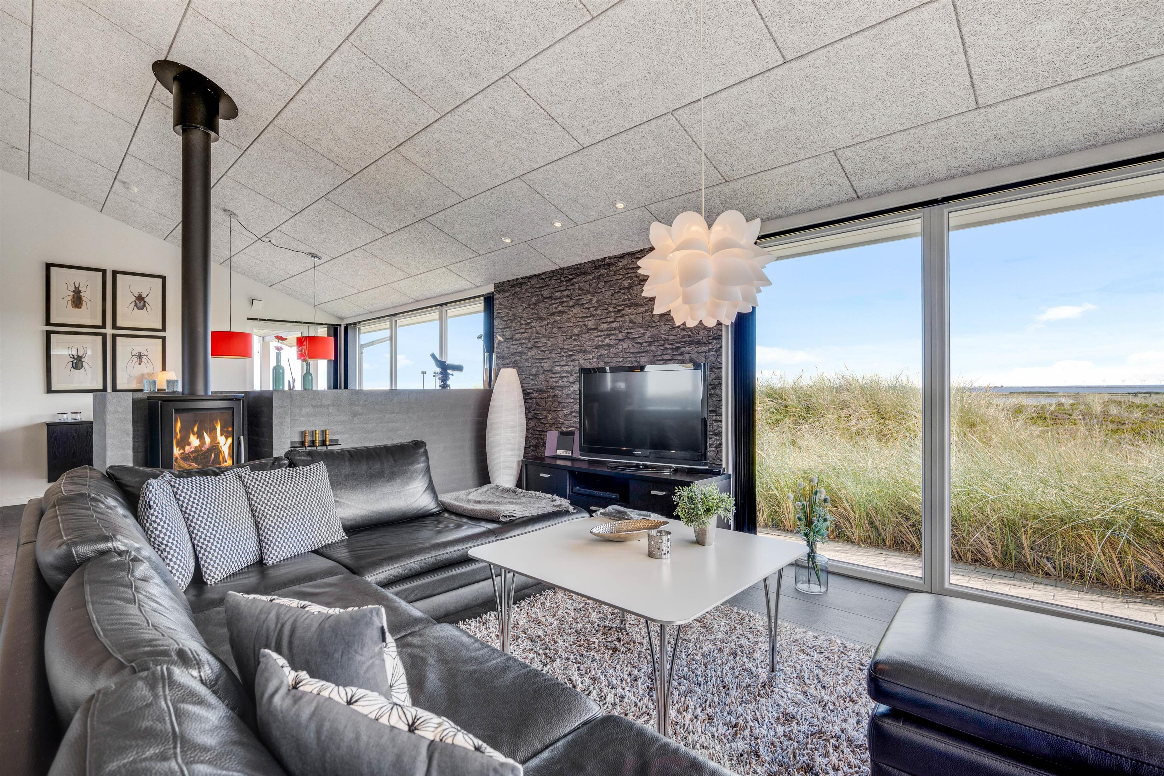 Her er 2 flotte badeværelser med gulvvarme. Det ene med boblebad og adgang til sauna. Sommerhusets køkken er lækkert og veludstyret i åben forbindelse med den flotte stue. Stuen er velindrettet med komfortable møbler og brændeovn og herfra er der storslået udsigt over området og til Ringkøbing Fjord. Du får her også gratis trådløst internet.