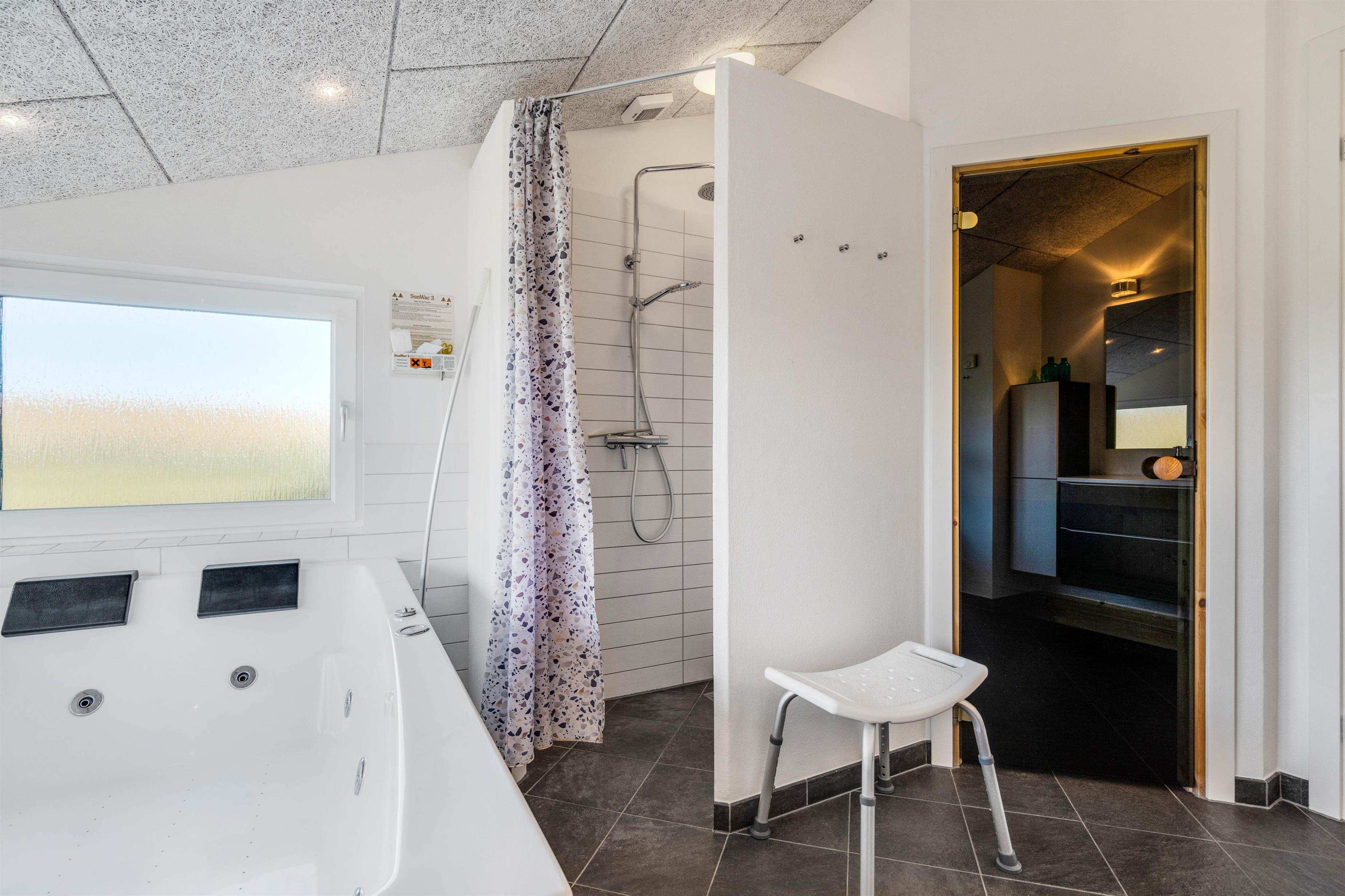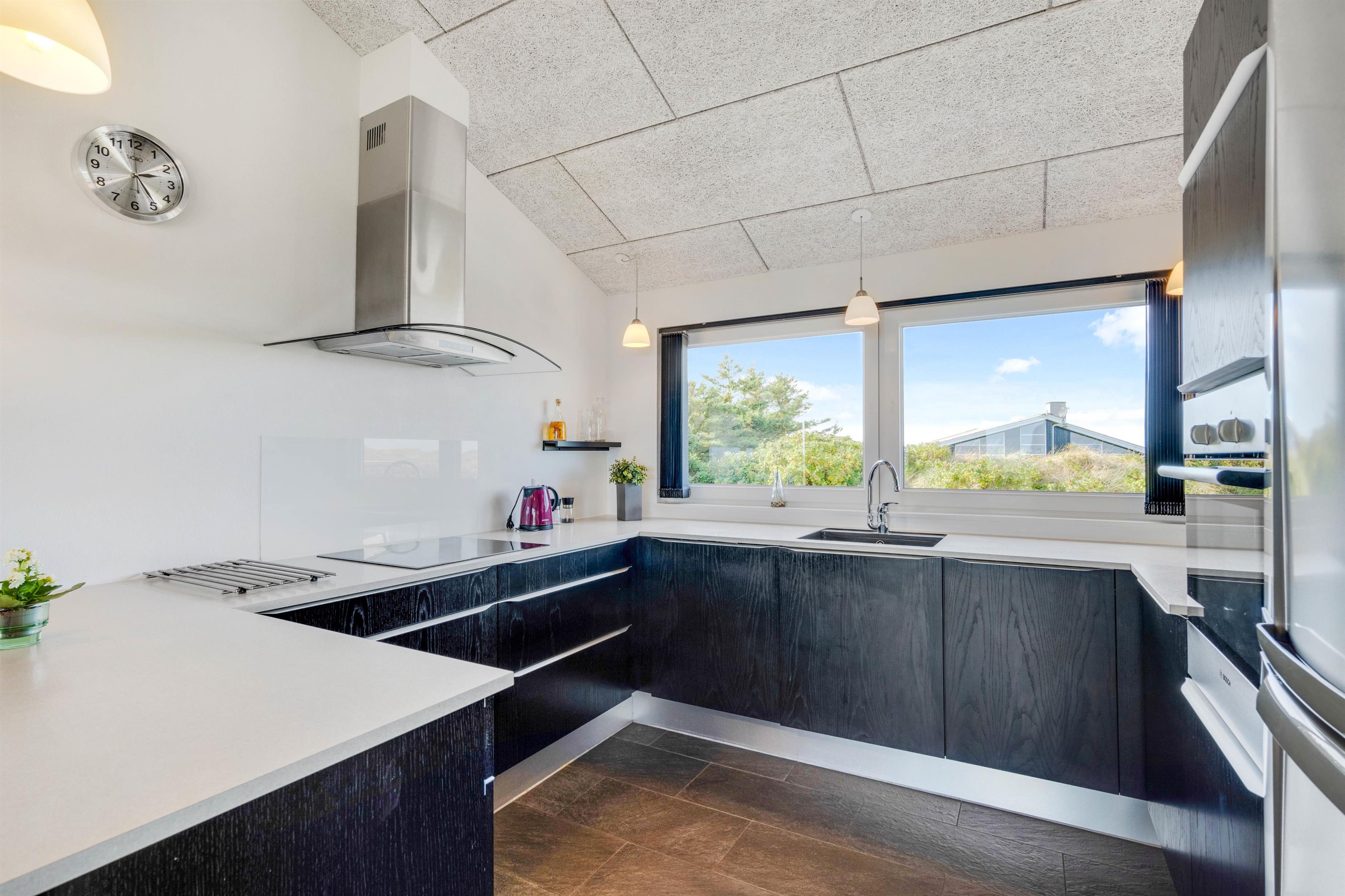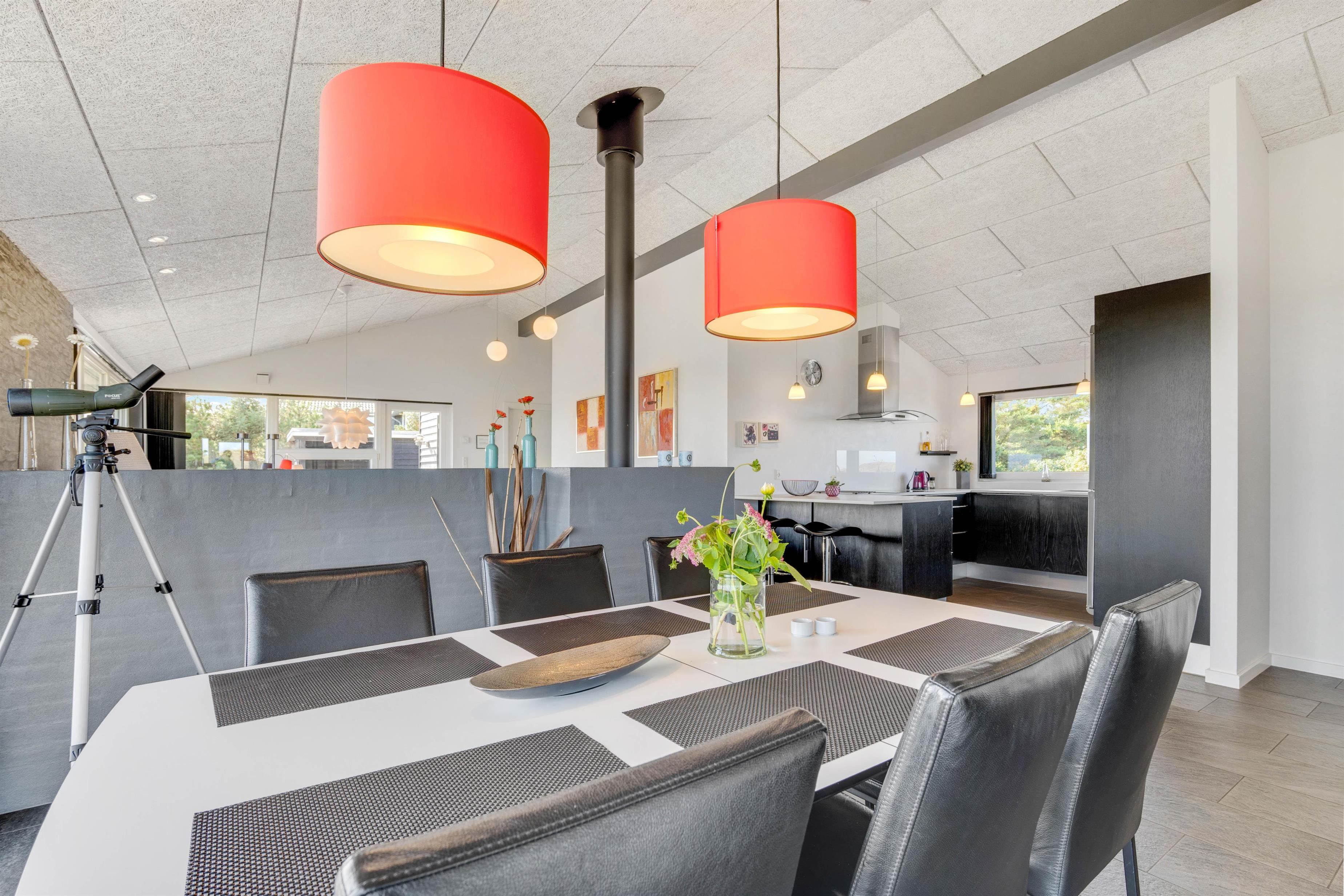 Her er 2 flotte badeværelser med gulvvarme. Det ene med boblebad og adgang til sauna. Sommerhusets køkken er lækkert og veludstyret i åben forbindelse med den flotte stue. Stuen er velindrettet med komfortable møbler og brændeovn og herfra er der storslået udsigt over området og til Ringkøbing Fjord. Du får her også gratis trådløst internet.