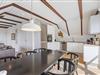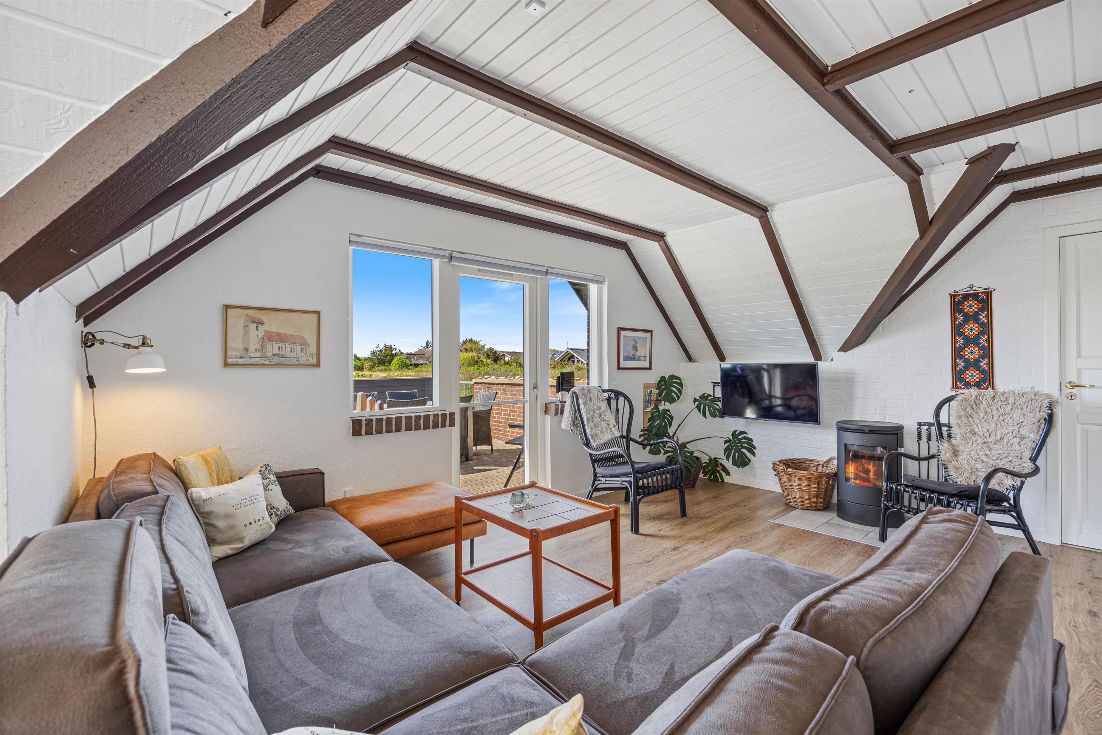 Det moderne og komfortable sommerhus er blevet renoveret i 2024 og er lyst og venligt indrettet. Det åbne køkken i forbindelse med stuen indeholder alt, hvad I behøver for at tilberede lækre måltider til hinanden, herunder induktionskomfur, separat fryser på 80 l og opvaskemaskine. Stuen er hyggeligt indrettet med synlige bjælker, og her kan I nyde samværet foran ilden i brændeovnen. Bemærk, at der er et trin op fra entré til stue-/køkkenområde.