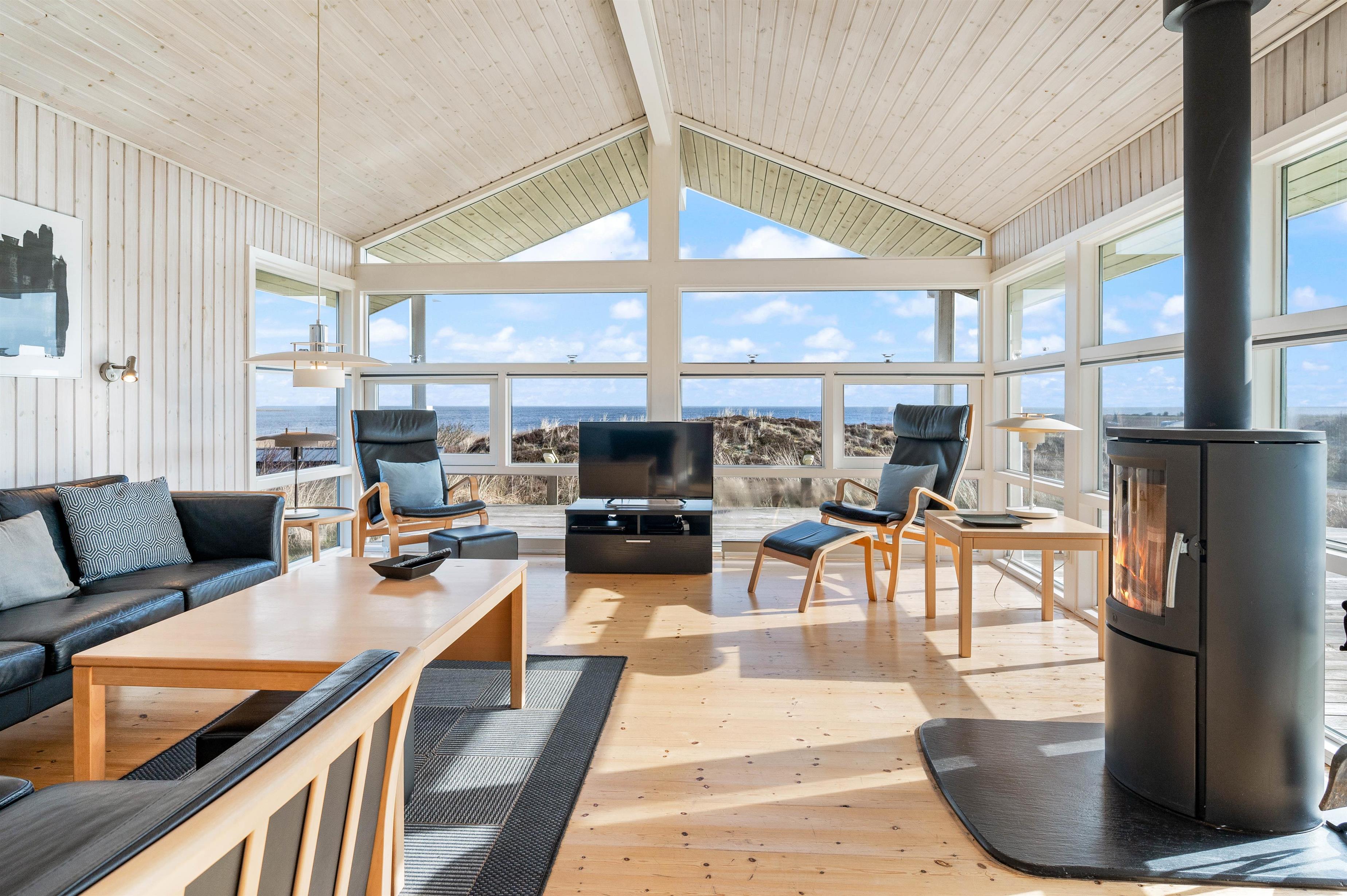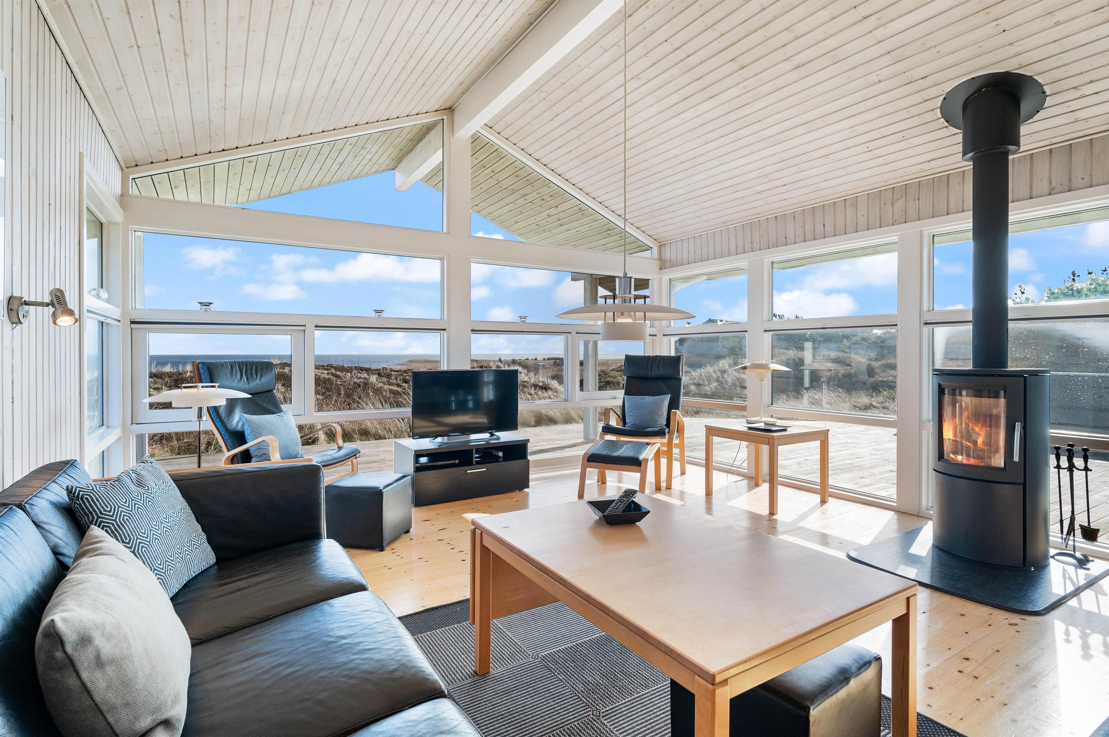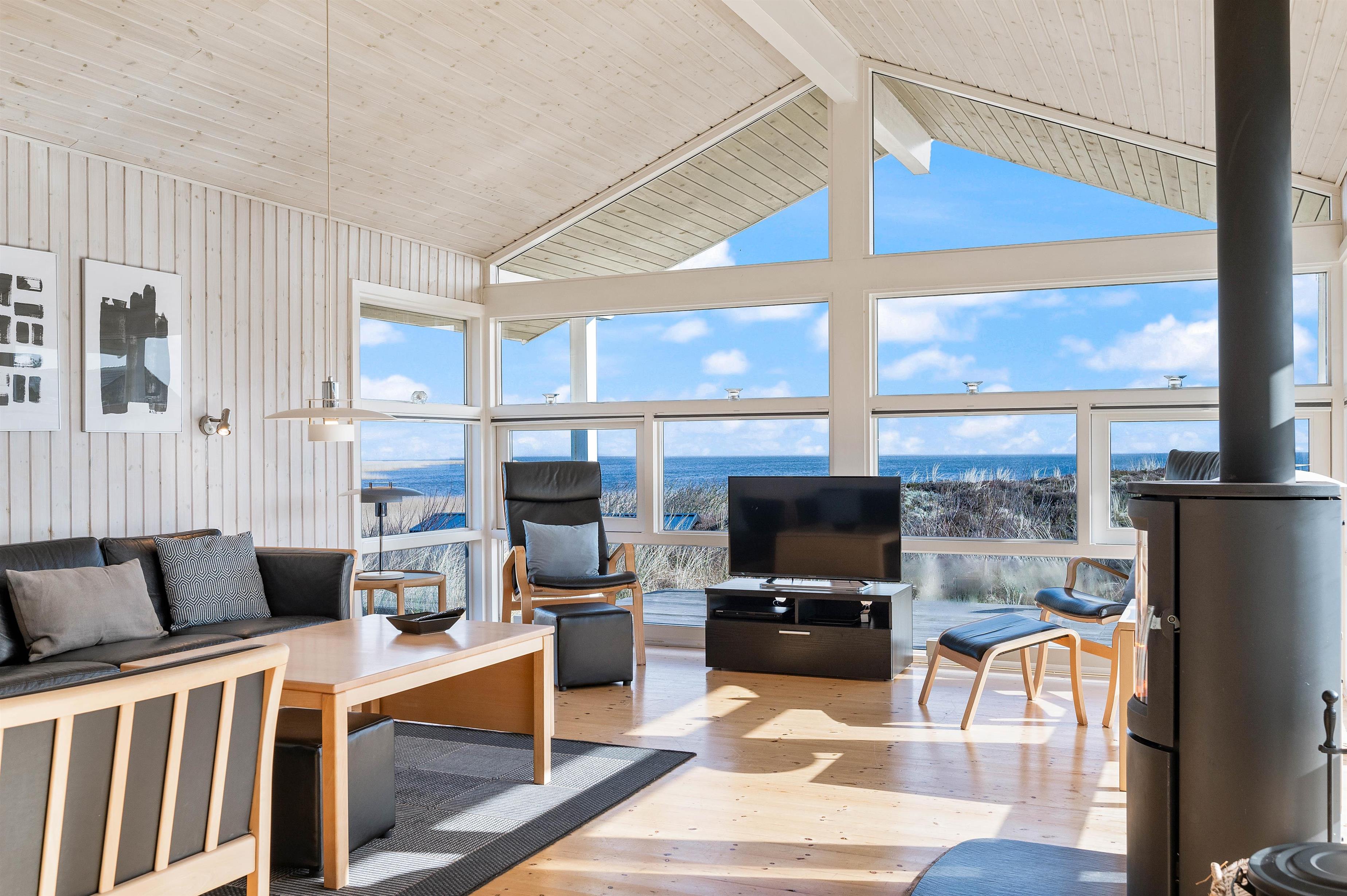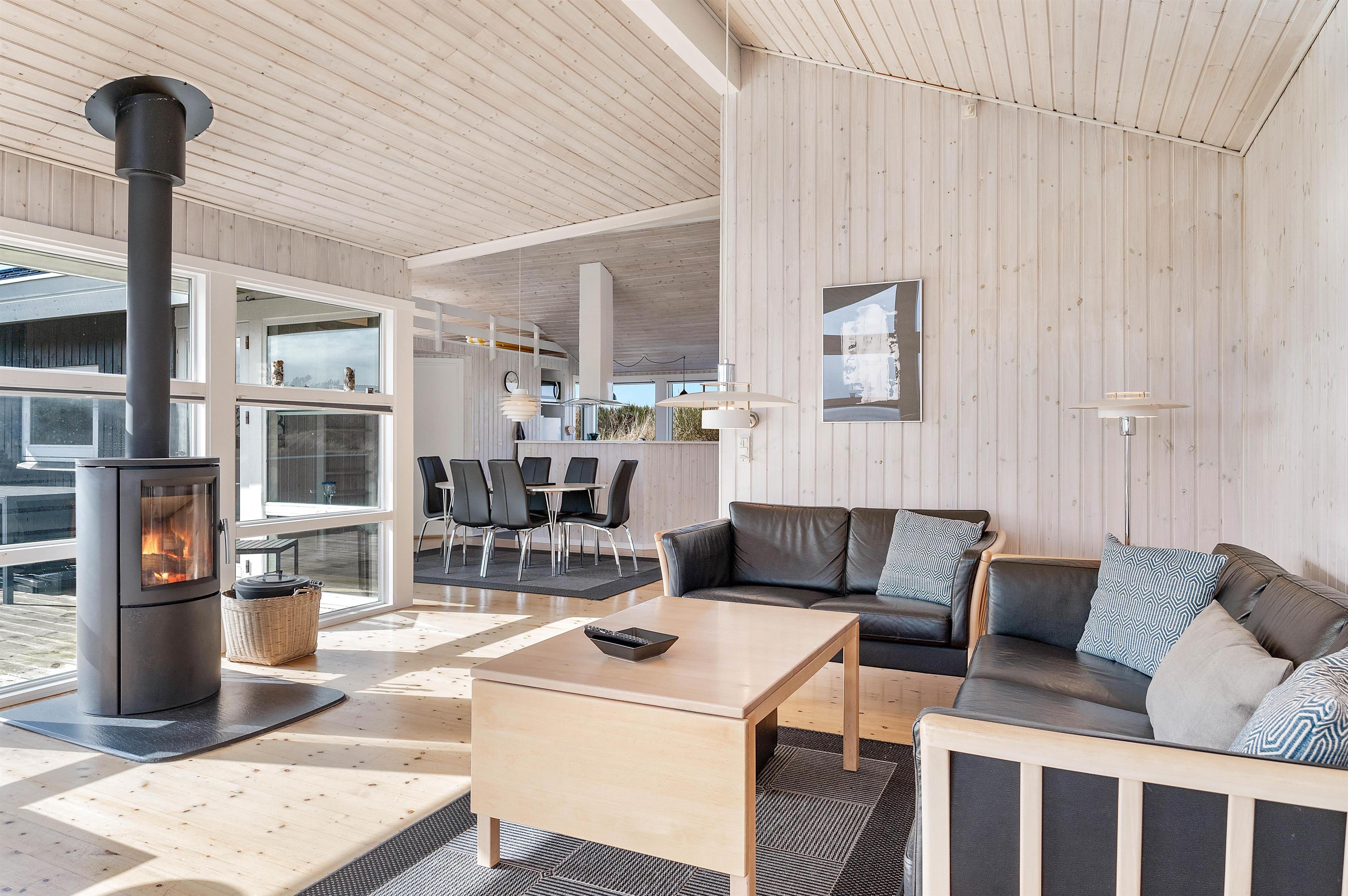 Indretningen i feriehuset er holdt i en lys og helt enkelt stil, som passer godt til det landskab, huset er en del af. Sommerhuset er indrettet med et stort opholdsrum, der ligger i åben forbindelse med køkkenet. I stuen kan I samles til filmhygge, imens I kan nyde varmen fra den knitrende brændeovn. Antallet af danske TV kanaler i huset er dog begrænset.