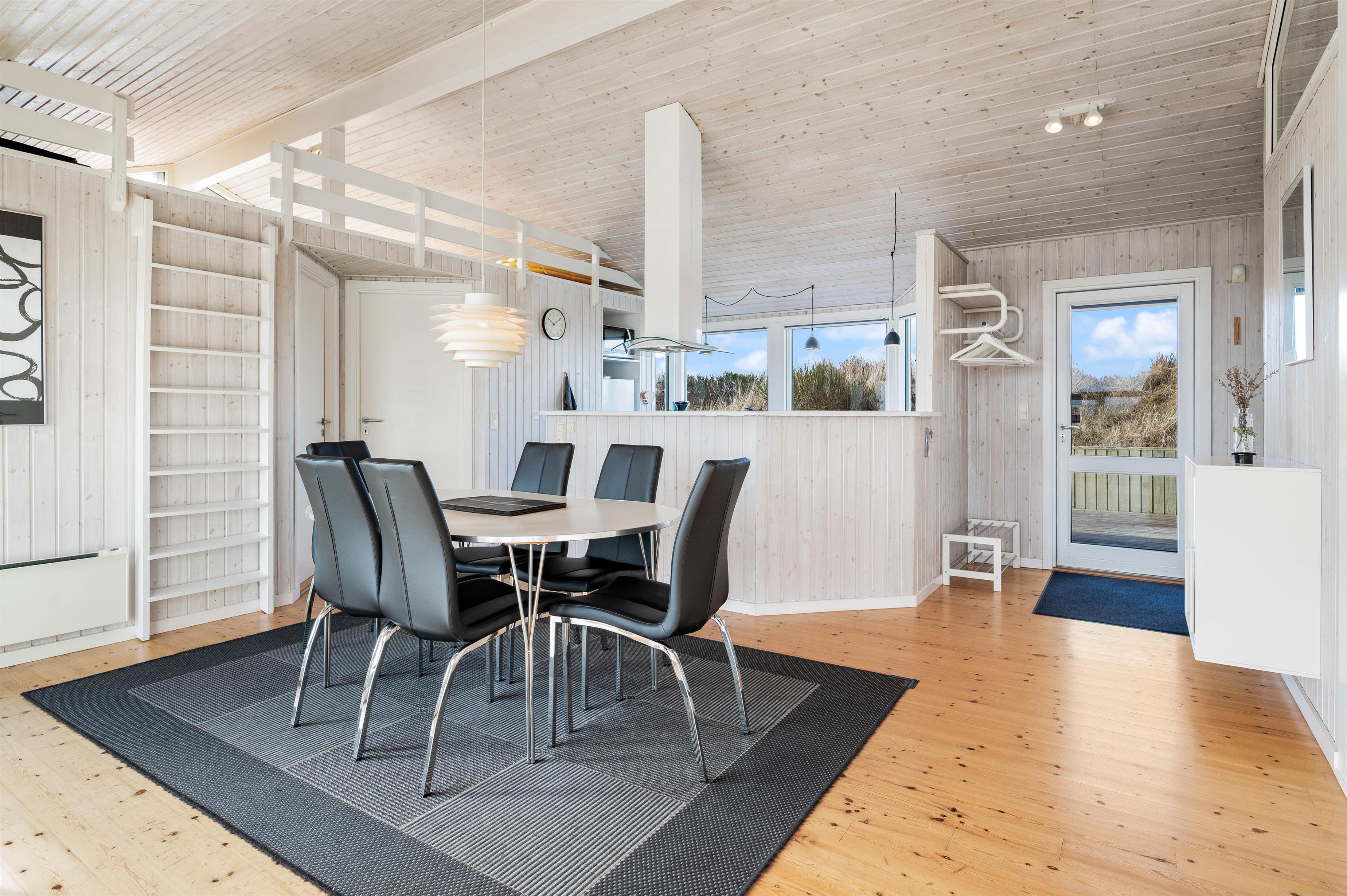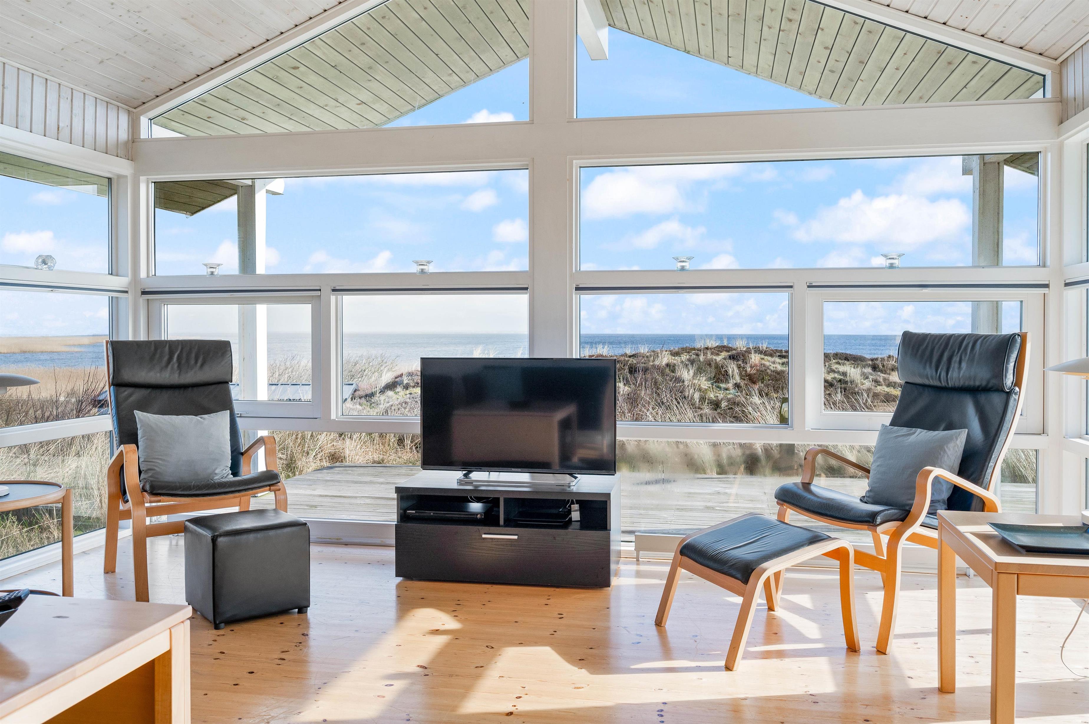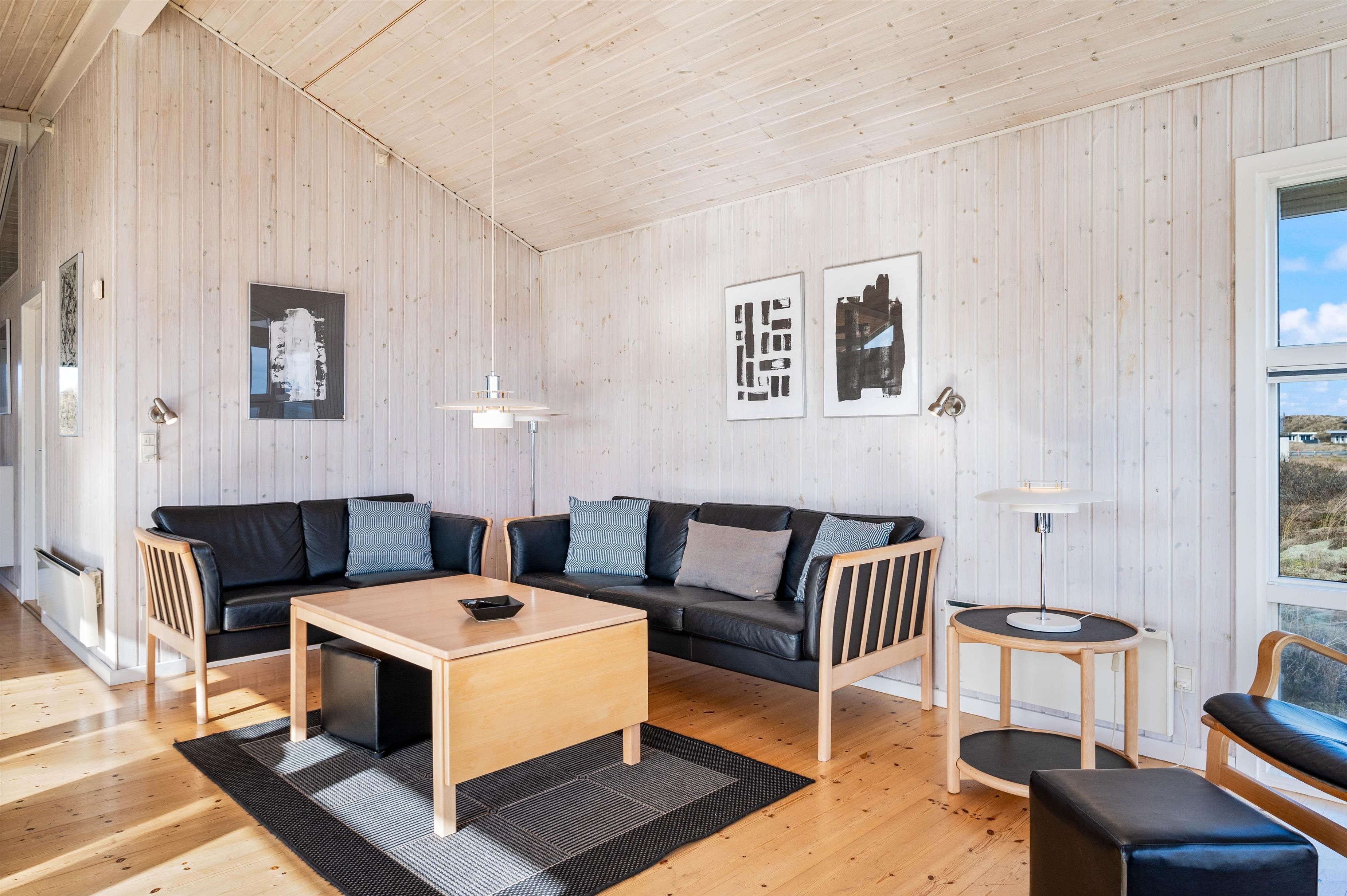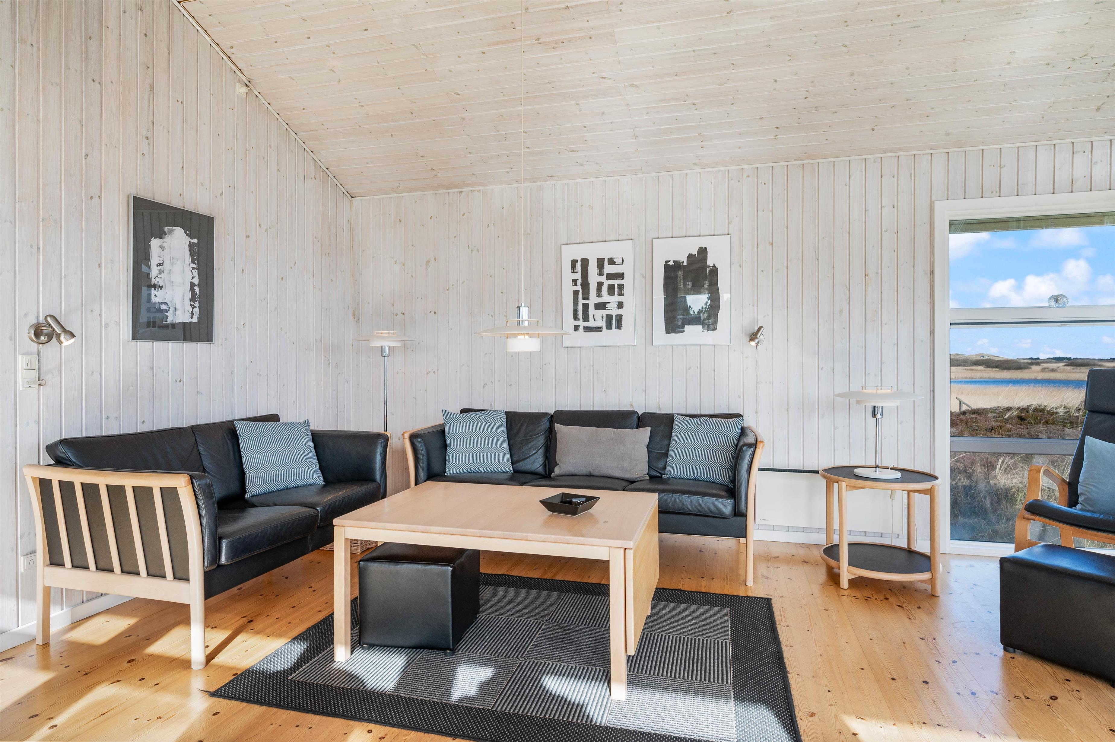 Indretningen i feriehuset er holdt i en lys og helt enkelt stil, som passer godt til det landskab, huset er en del af. Sommerhuset er indrettet med et stort opholdsrum, der ligger i åben forbindelse med køkkenet. I stuen kan I samles til filmhygge, imens I kan nyde varmen fra den knitrende brændeovn. Antallet af danske TV kanaler i huset er dog begrænset.