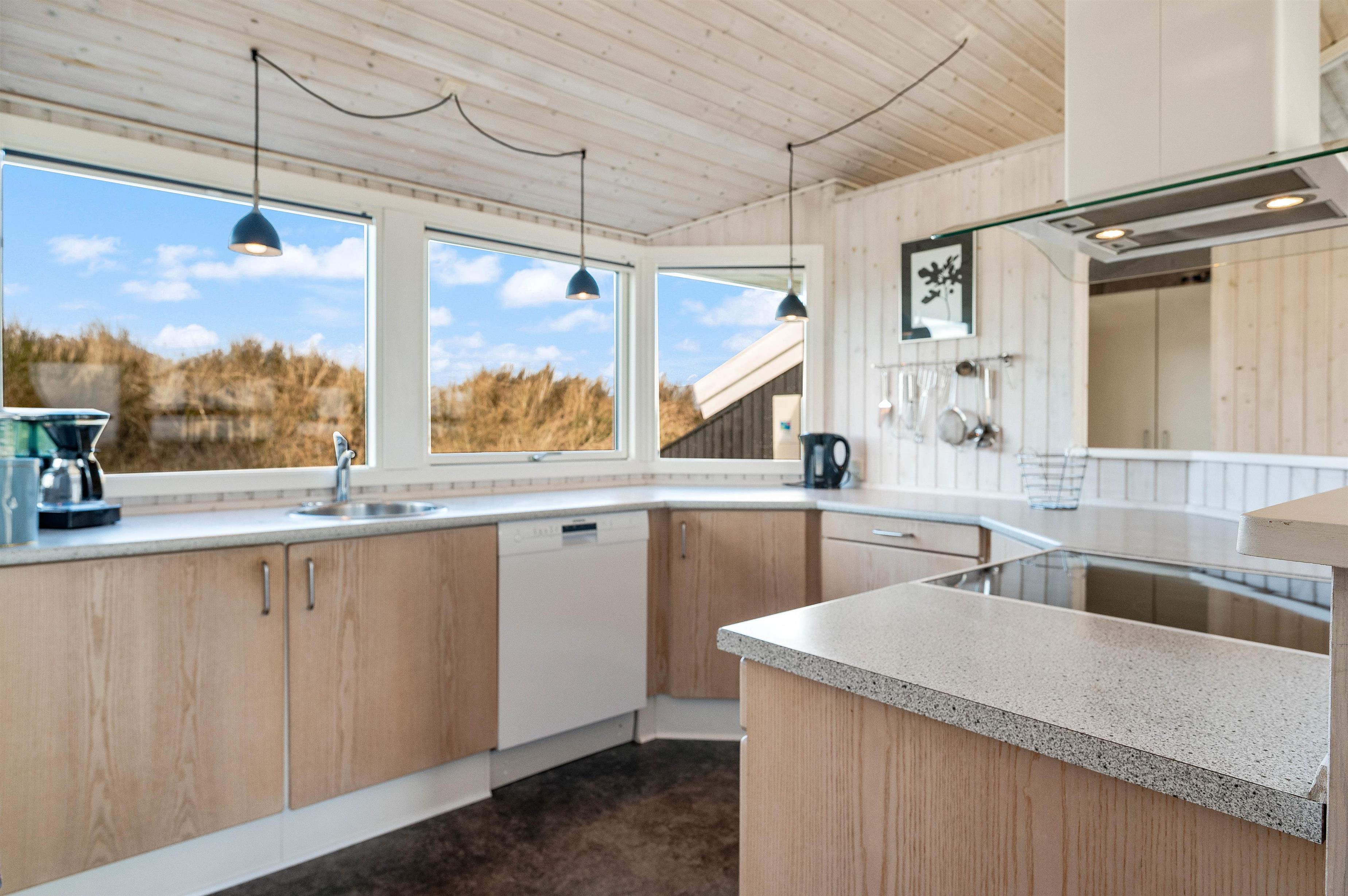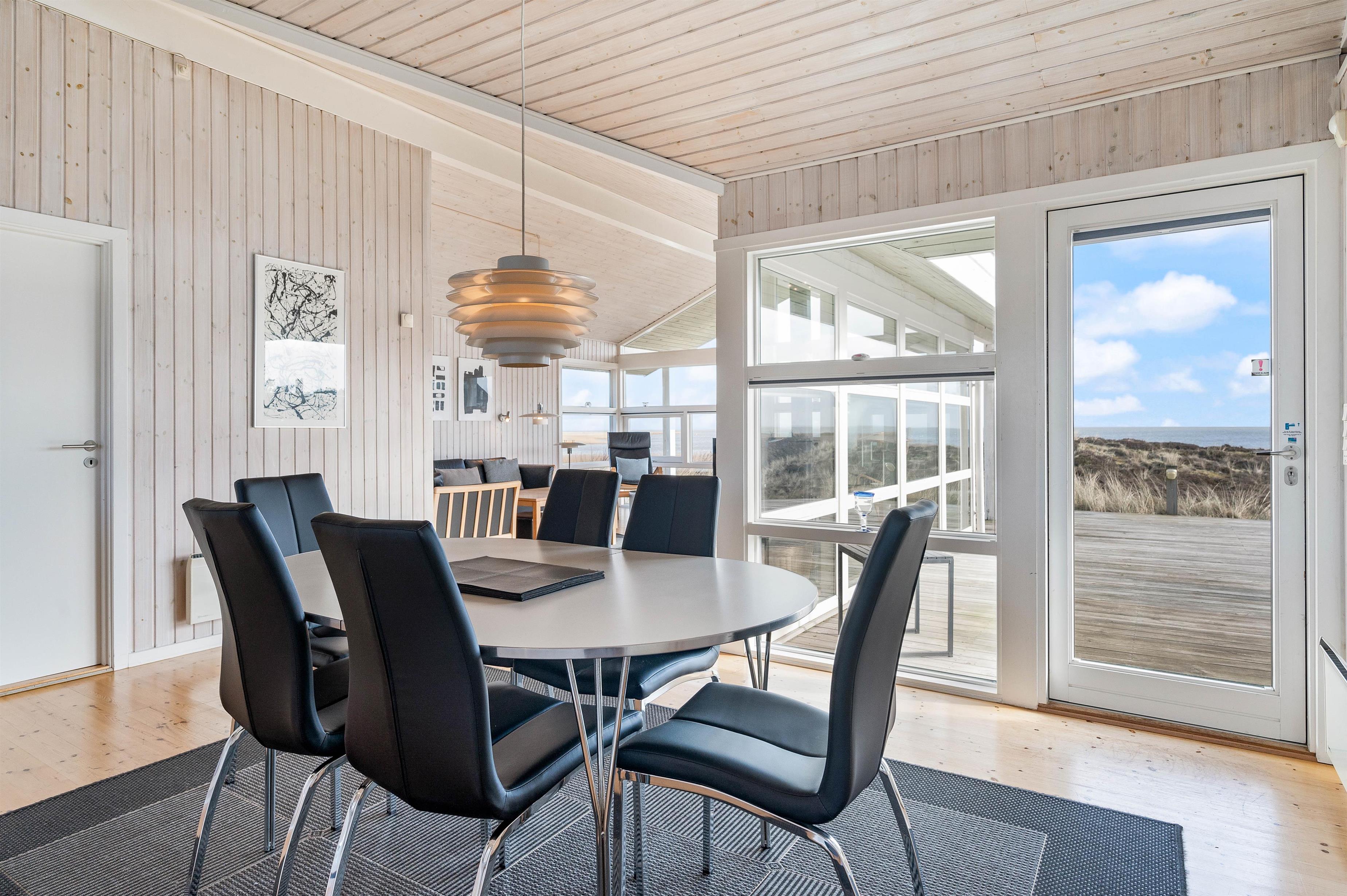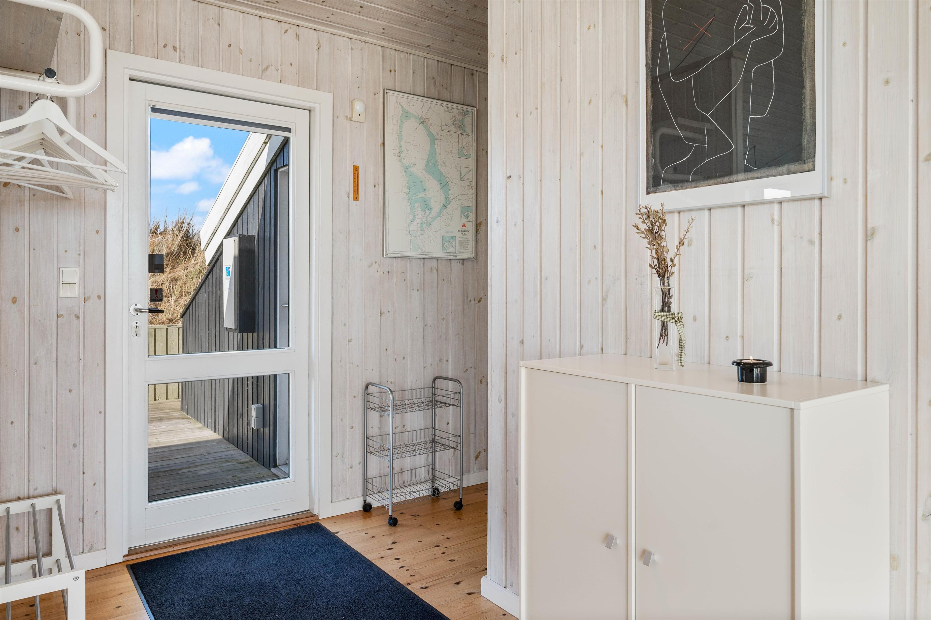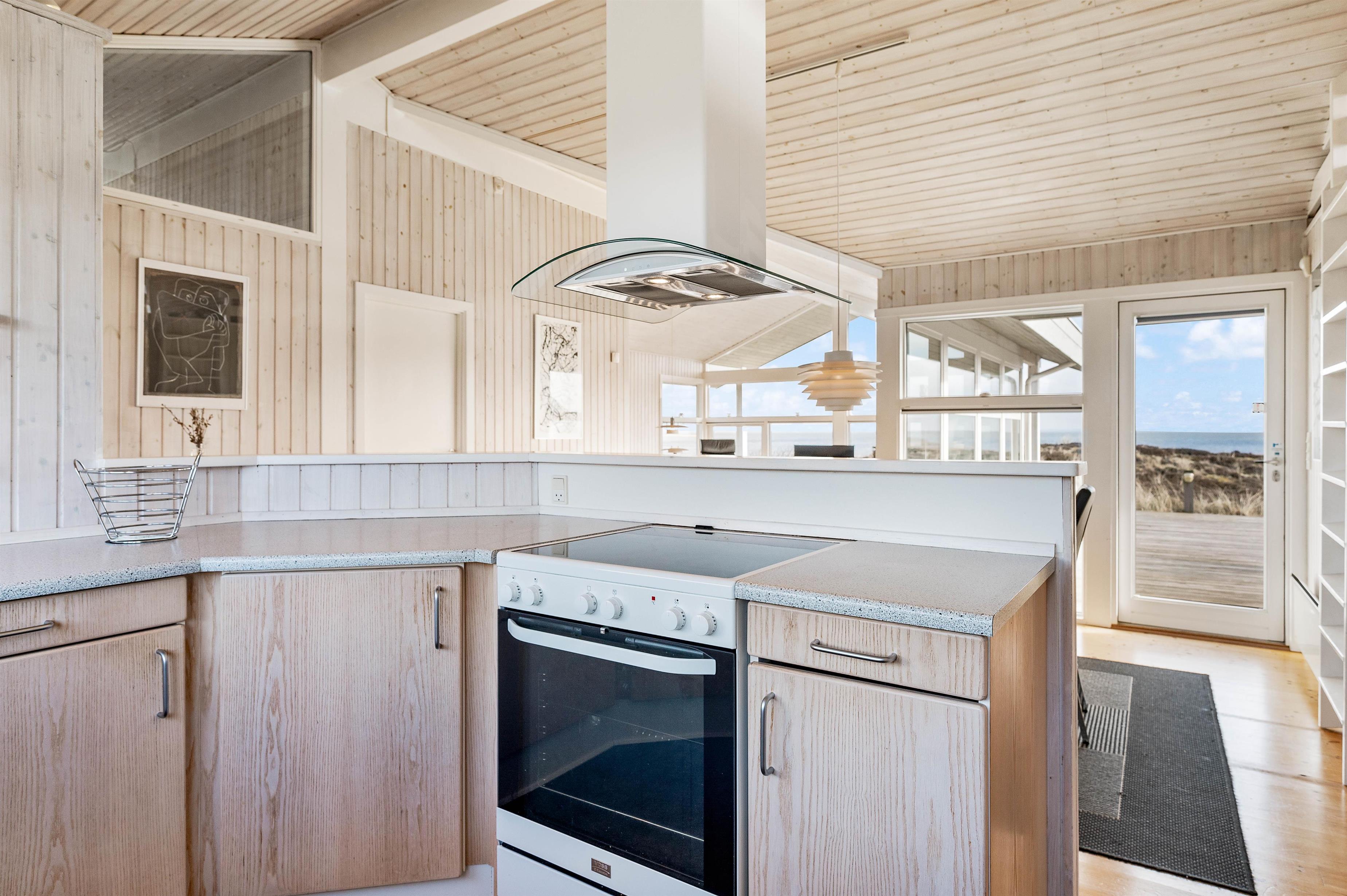 Indretningen i feriehuset er holdt i en lys og helt enkelt stil, som passer godt til det landskab, huset er en del af. Sommerhuset er indrettet med et stort opholdsrum, der ligger i åben forbindelse med køkkenet. I stuen kan I samles til filmhygge, imens I kan nyde varmen fra den knitrende brændeovn. Antallet af danske TV kanaler i huset er dog begrænset.