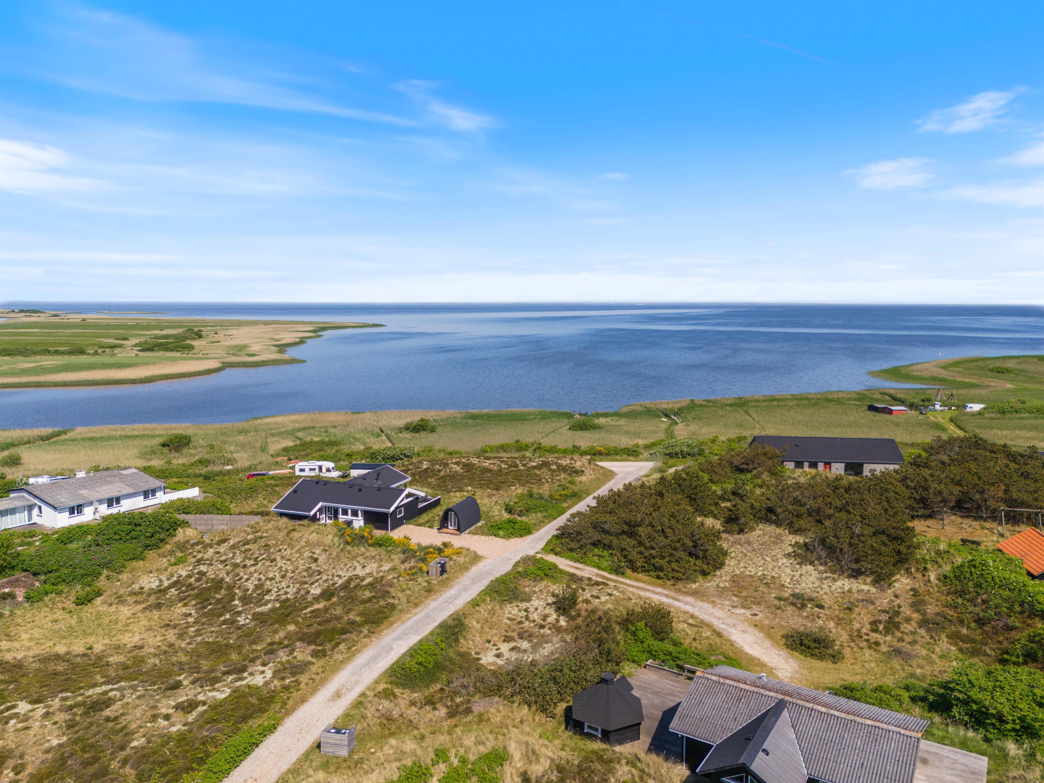 Hareklit ligger i Skodbjerge og er en af de få veje, som ligger på østsiden af vejen. Det betyder, at der fra feriehuset, som er beliggende på en klitgrund, er en helt fantastisk udsigt. I stuen er der glaspartier til tre sider, hvilket skaber en skøn panoramaudsigt over Ringkøbing Fjord og et utroligt dejligt lysindfald i stuen. Naturen kommer næsten væltende ind i stuen – uanset årstid, vejr og vind er det en fornøjelse at sidde her med en kop kaffe og bare nyde landskabet.