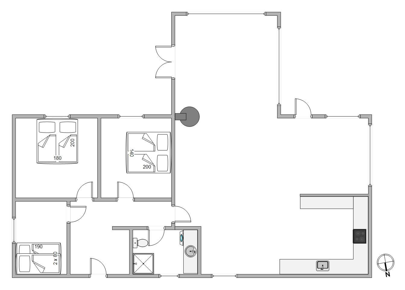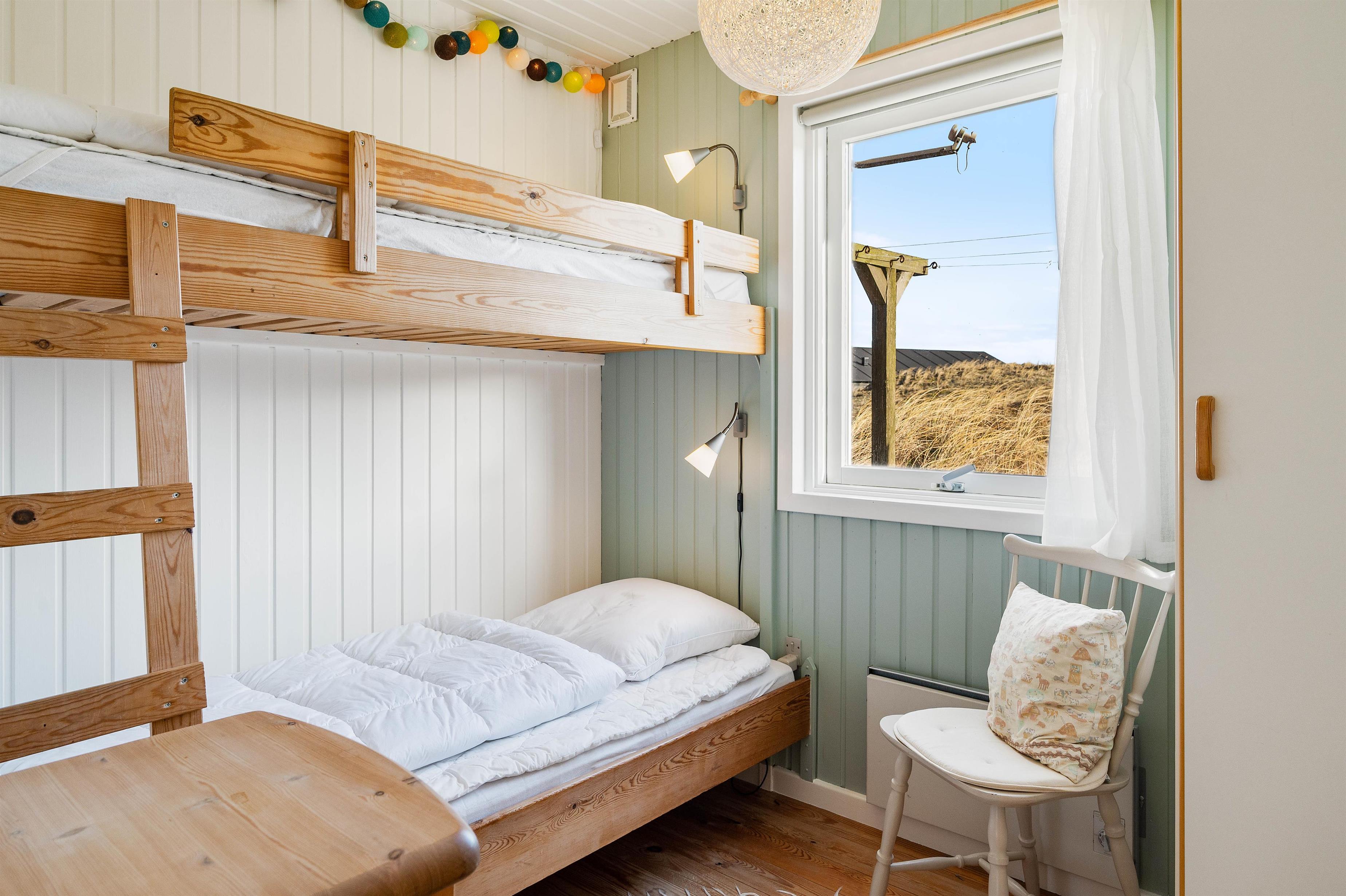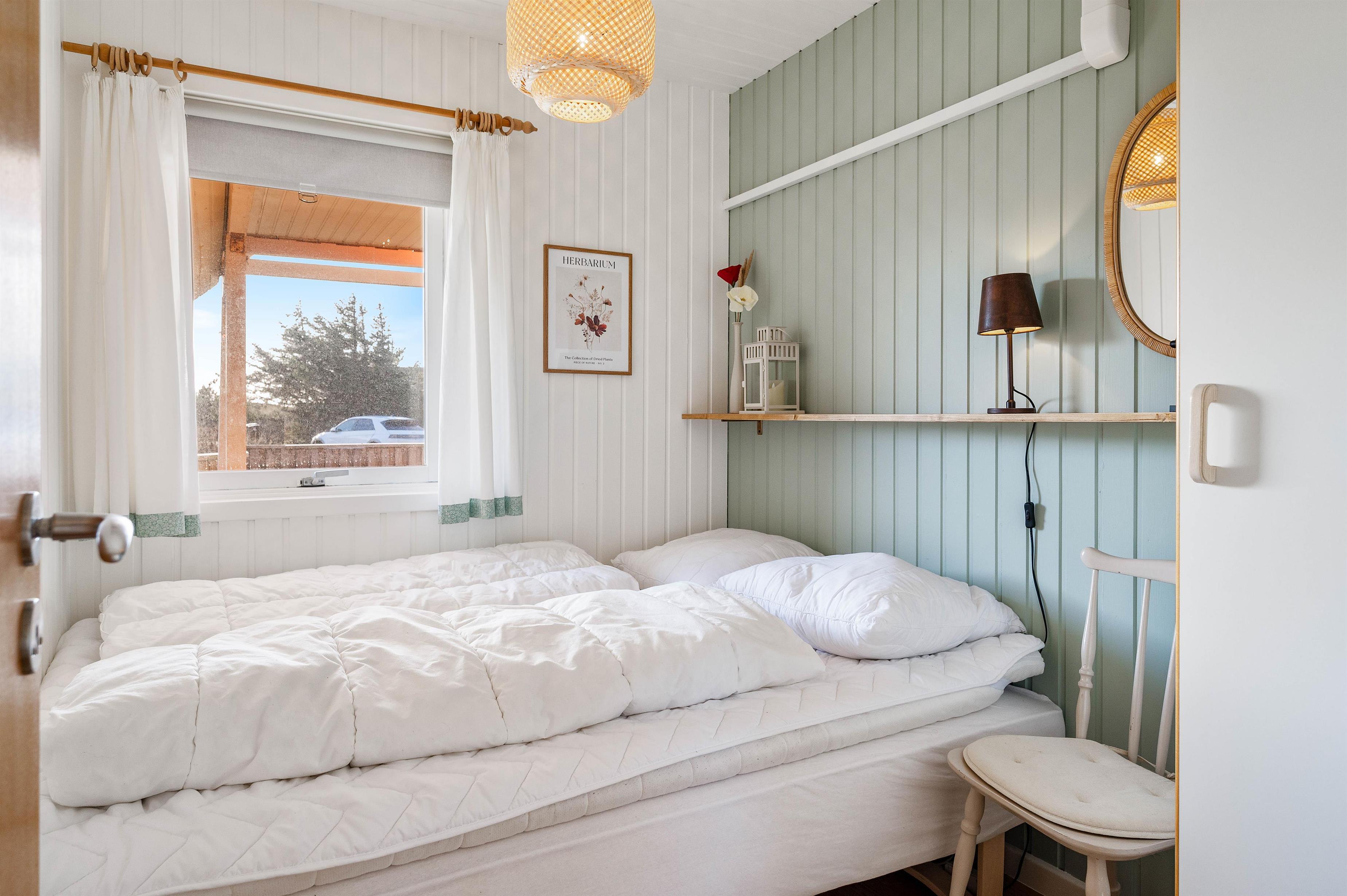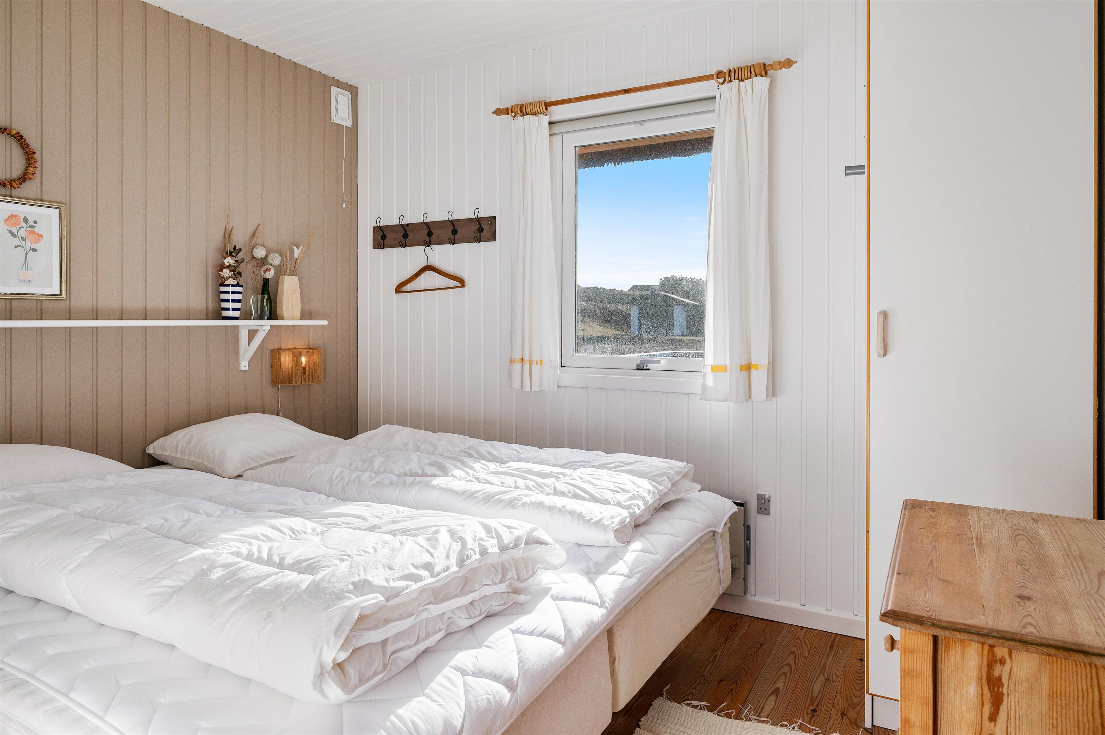 Sommerhuset har et fint badeværelse med gulvvarme samt 3 gode værelser. Der er 1 dobbeltseng, 3/4 seng og 1 Etageseng.