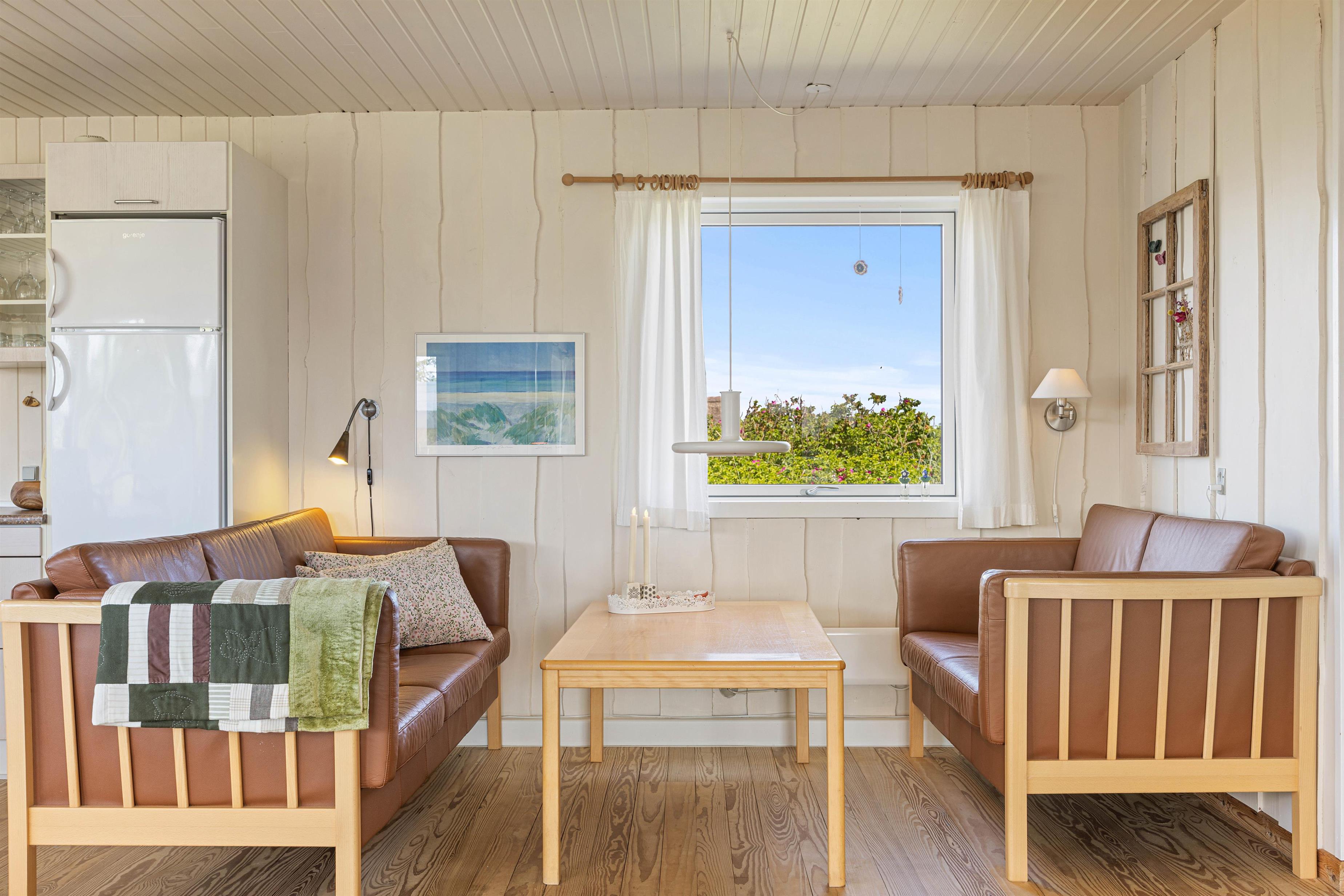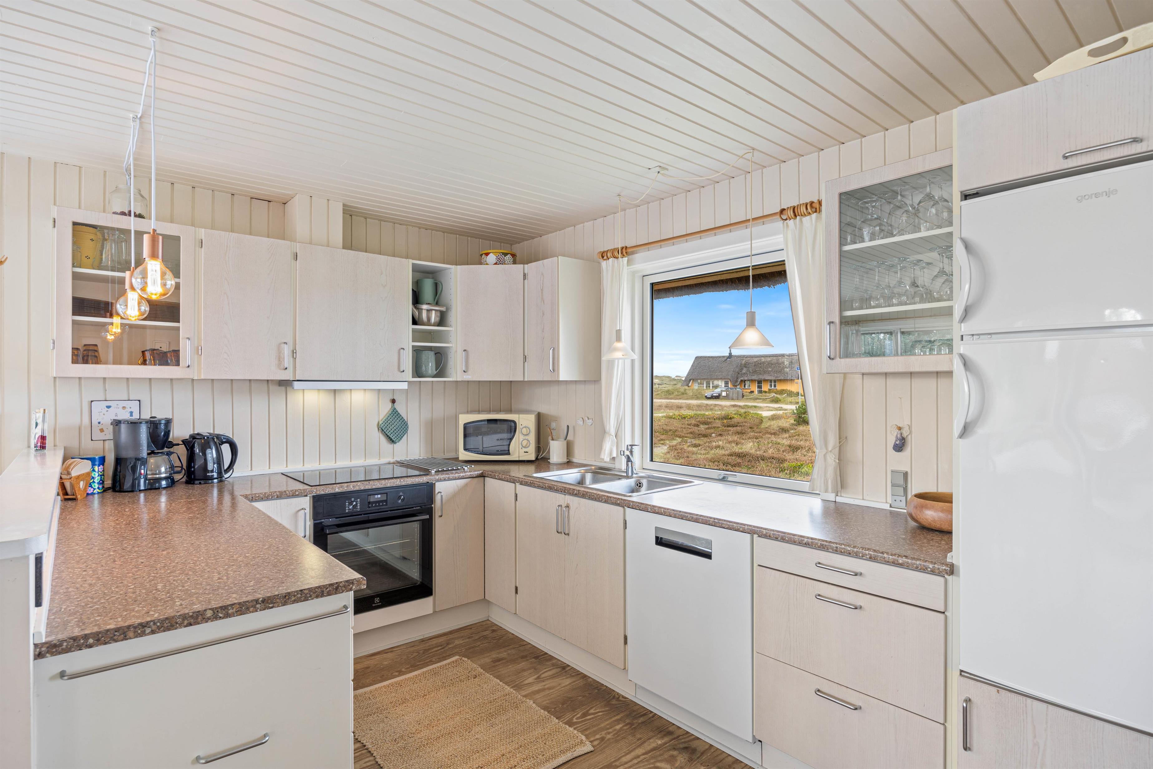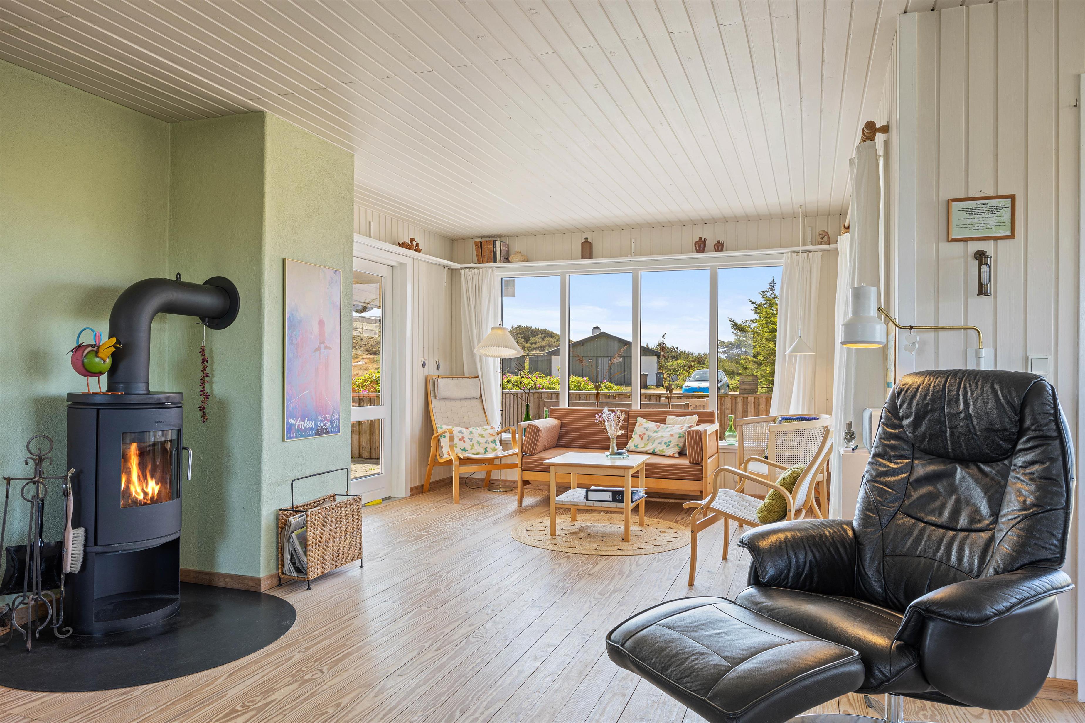 Tænd op i brændeovnen og mærk, hvordan hyggen breder sig. Sommerhuset er indrettet i traditionel og personlig stil og har god plads til op til 5 personer i den hyggelige stue med varmepumpe. Her er flere gode hyggekroge, perfekte til at slappe af med en god krimi eller måske et spil kort med resten af familien. U-køkkenet er i åben forbindelse med stuen, så alle kan være med – også når der laves mad. Spisebordet står foran et stort vinduesparti, så du herfra kan nyde den smukke udsigt til hede og klitter.