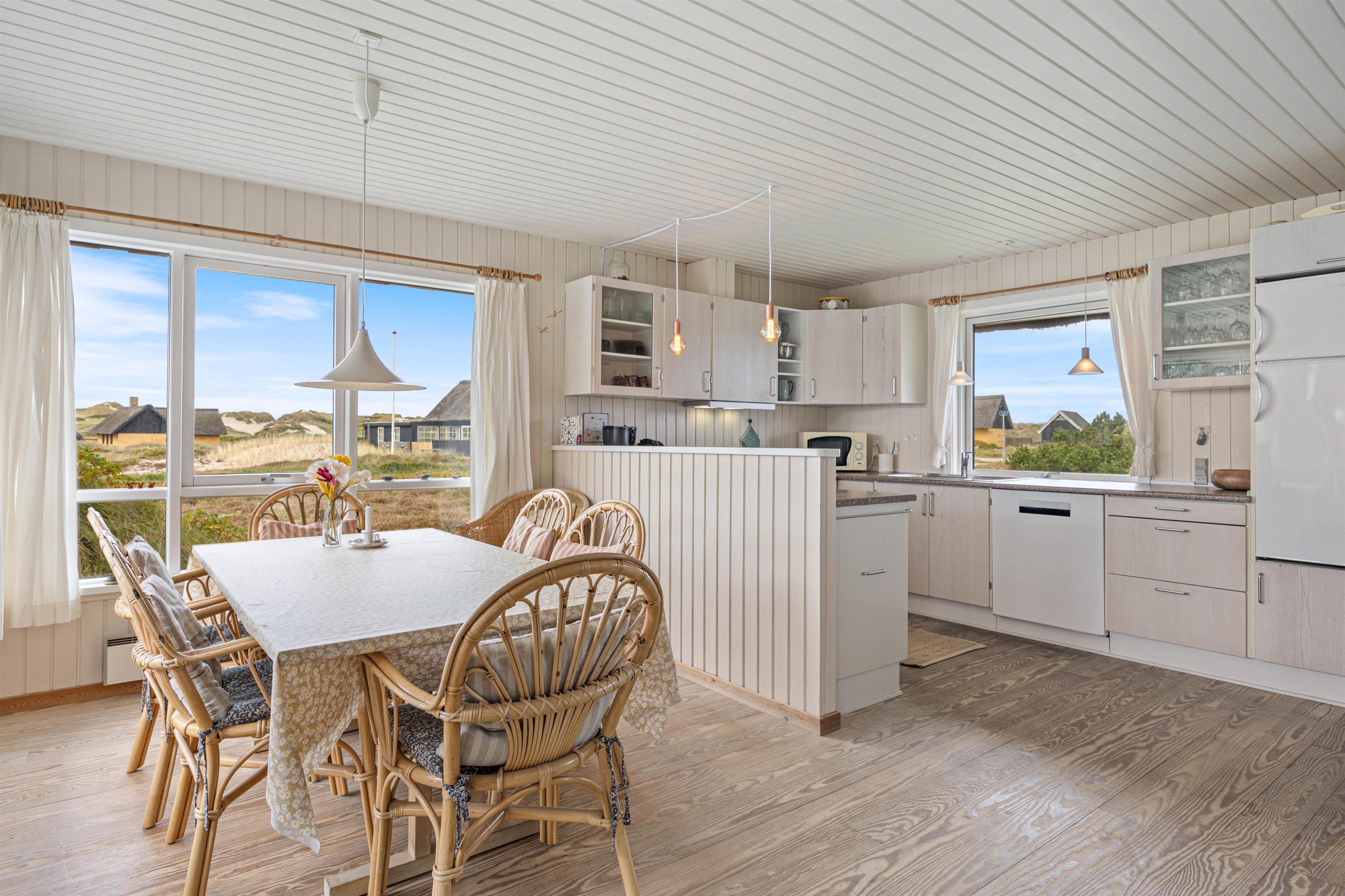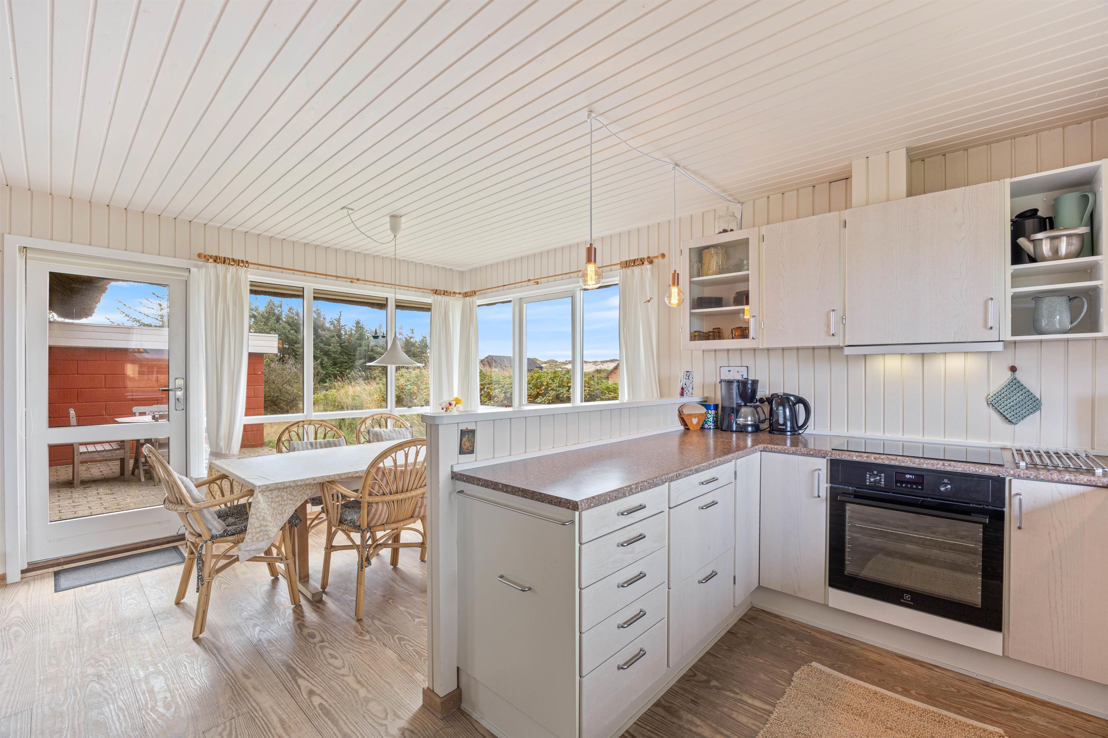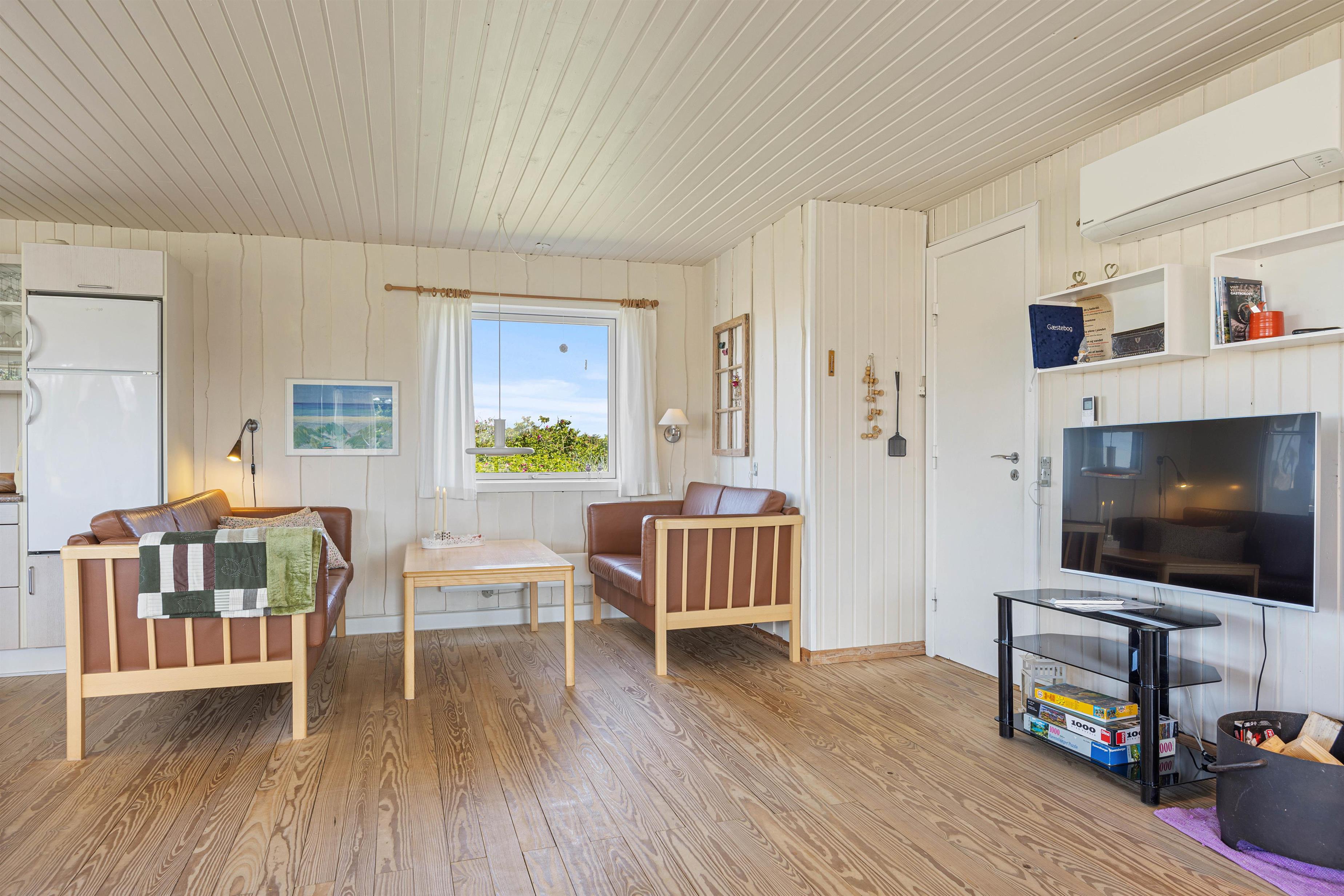 Tænd op i brændeovnen og mærk, hvordan hyggen breder sig. Sommerhuset er indrettet i traditionel og personlig stil og har god plads til op til 5 personer i den hyggelige stue med varmepumpe. Her er flere gode hyggekroge, perfekte til at slappe af med en god krimi eller måske et spil kort med resten af familien. U-køkkenet er i åben forbindelse med stuen, så alle kan være med – også når der laves mad. Spisebordet står foran et stort vinduesparti, så du herfra kan nyde den smukke udsigt til hede og klitter.