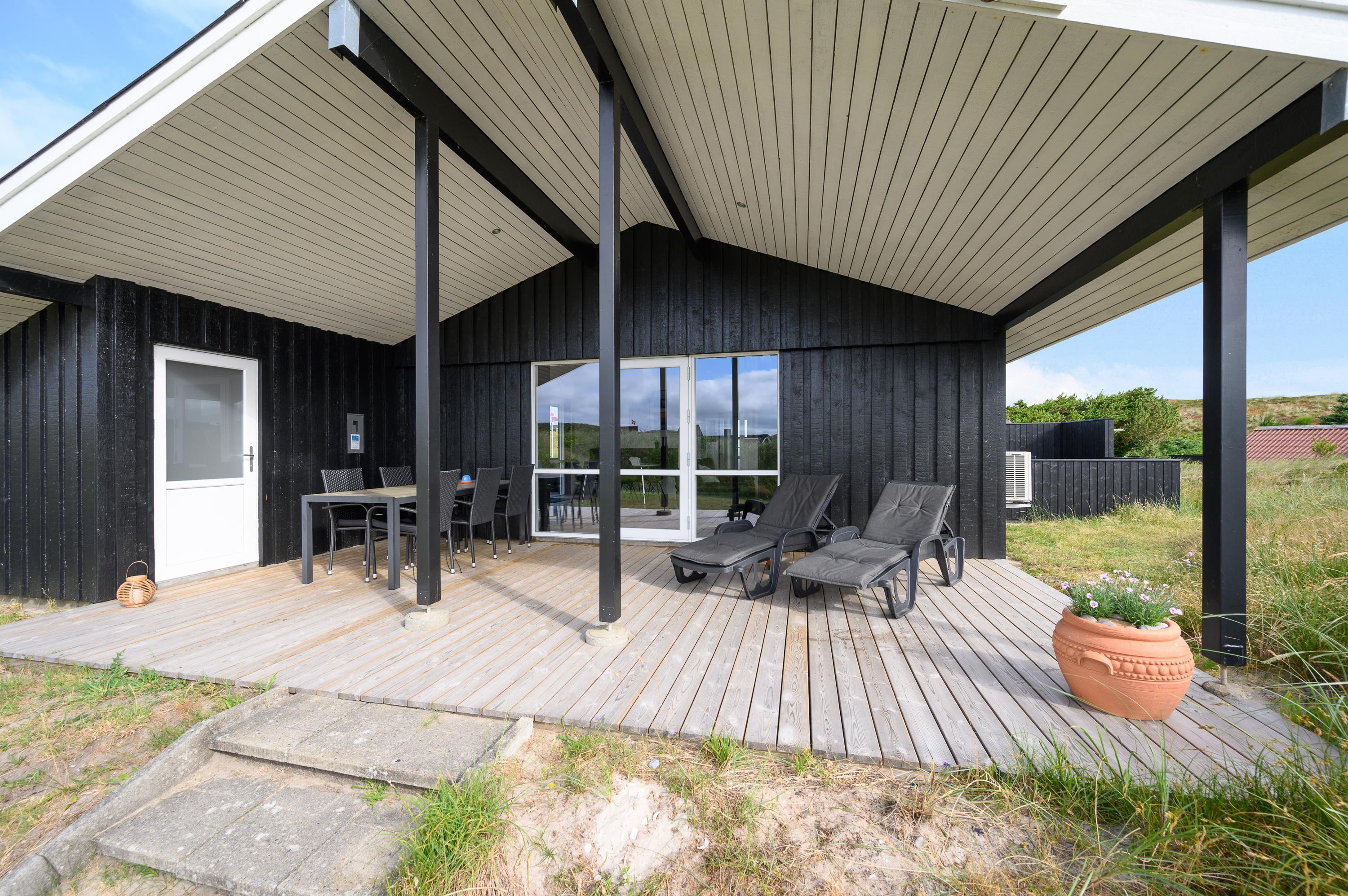 Med en overdækket og en lukket terrasse er der mange muligheder for at tilbringe tid udendørs ved feriehuset. Selv på regnvejrsdage kan I indånde den friske luft i tørvejr under overdækket med udsigt til den bakkede grund. På den lukkede terrasse kan I sidde i læ for vinden og nyde solens stråler fra liggestolene med en god bog. Legeredskaberne trækker også børnene udenfor i det gode vejr: De kan flyve højt til vejrs på gyngerne eller grave dybe kanaler i sandkassen.