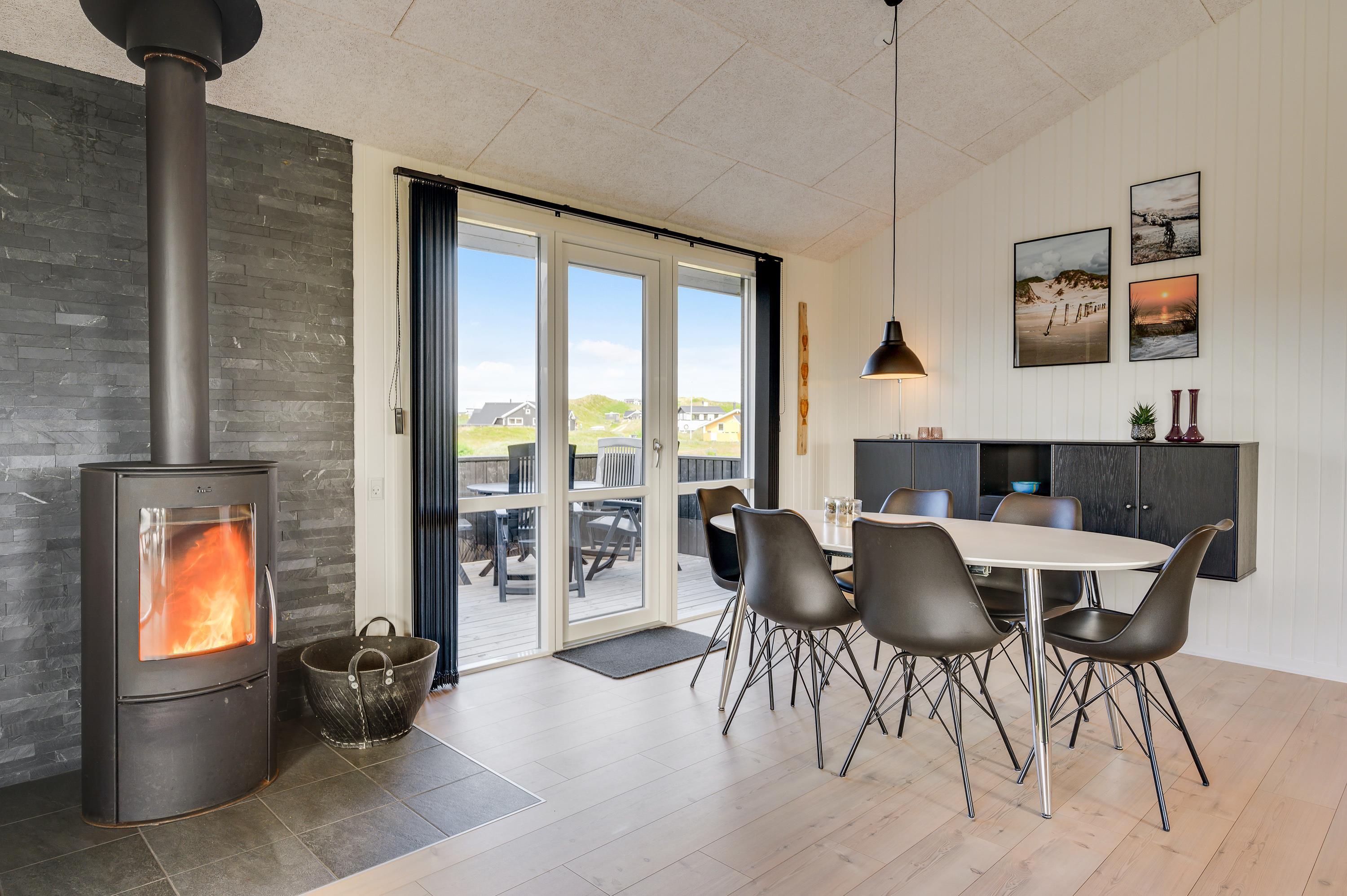 Moderne indretning med brændeovn og plads til hele familien