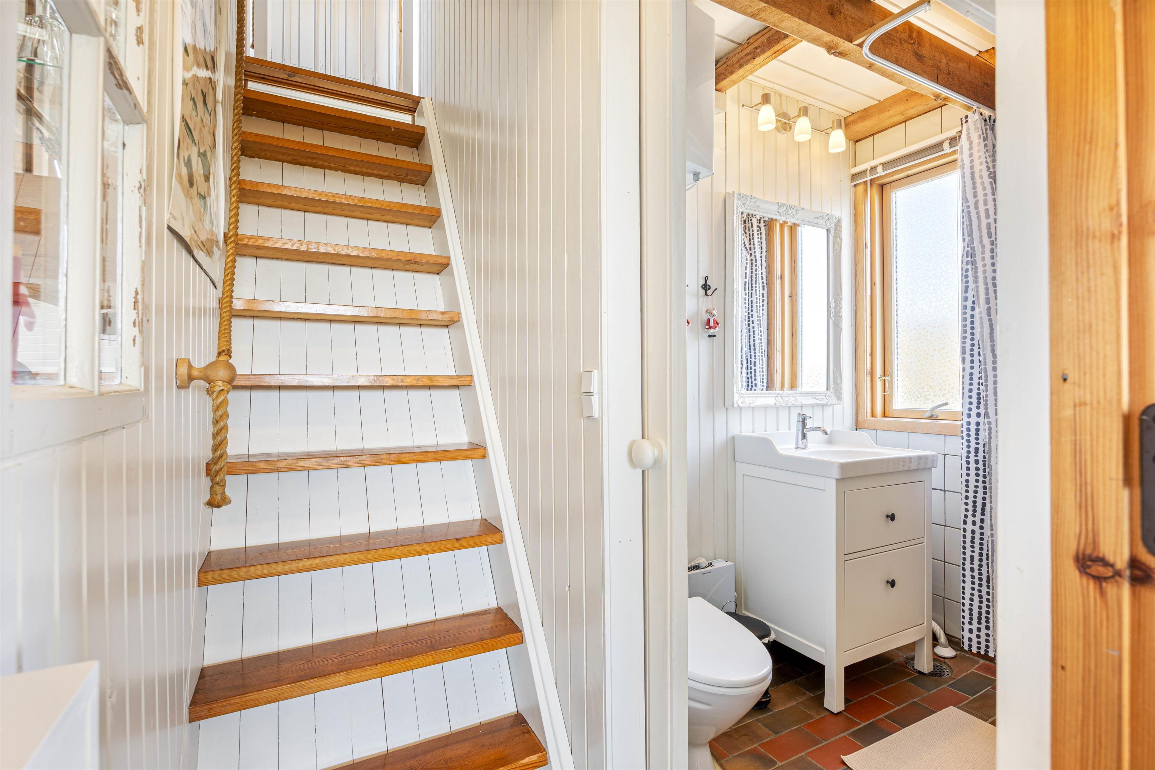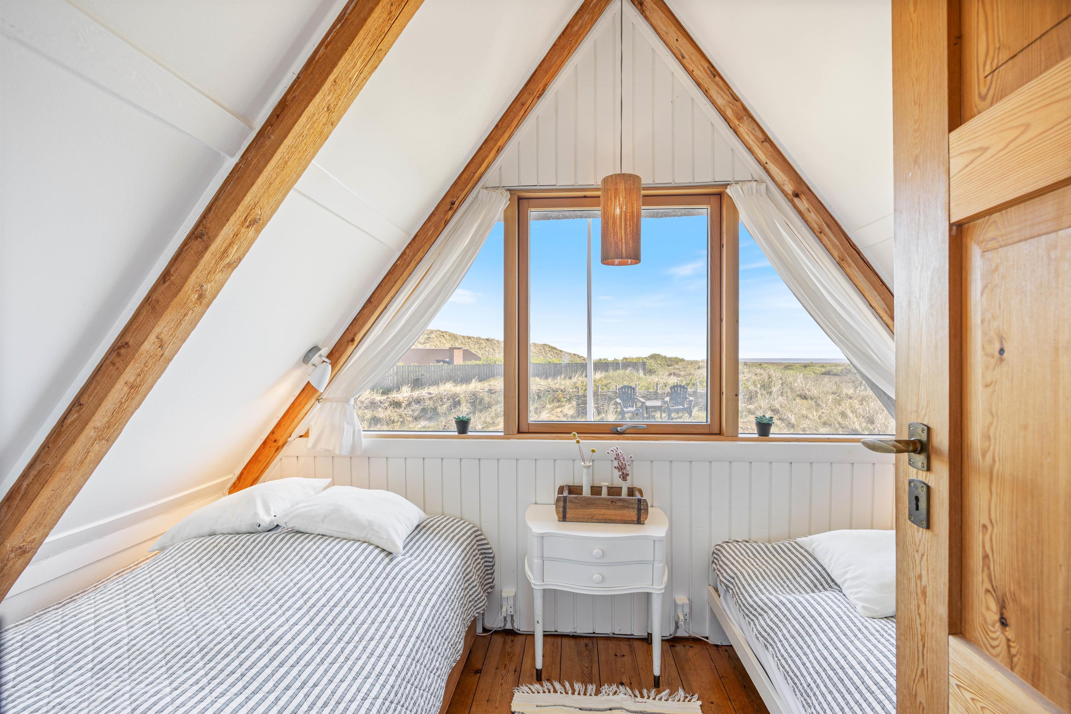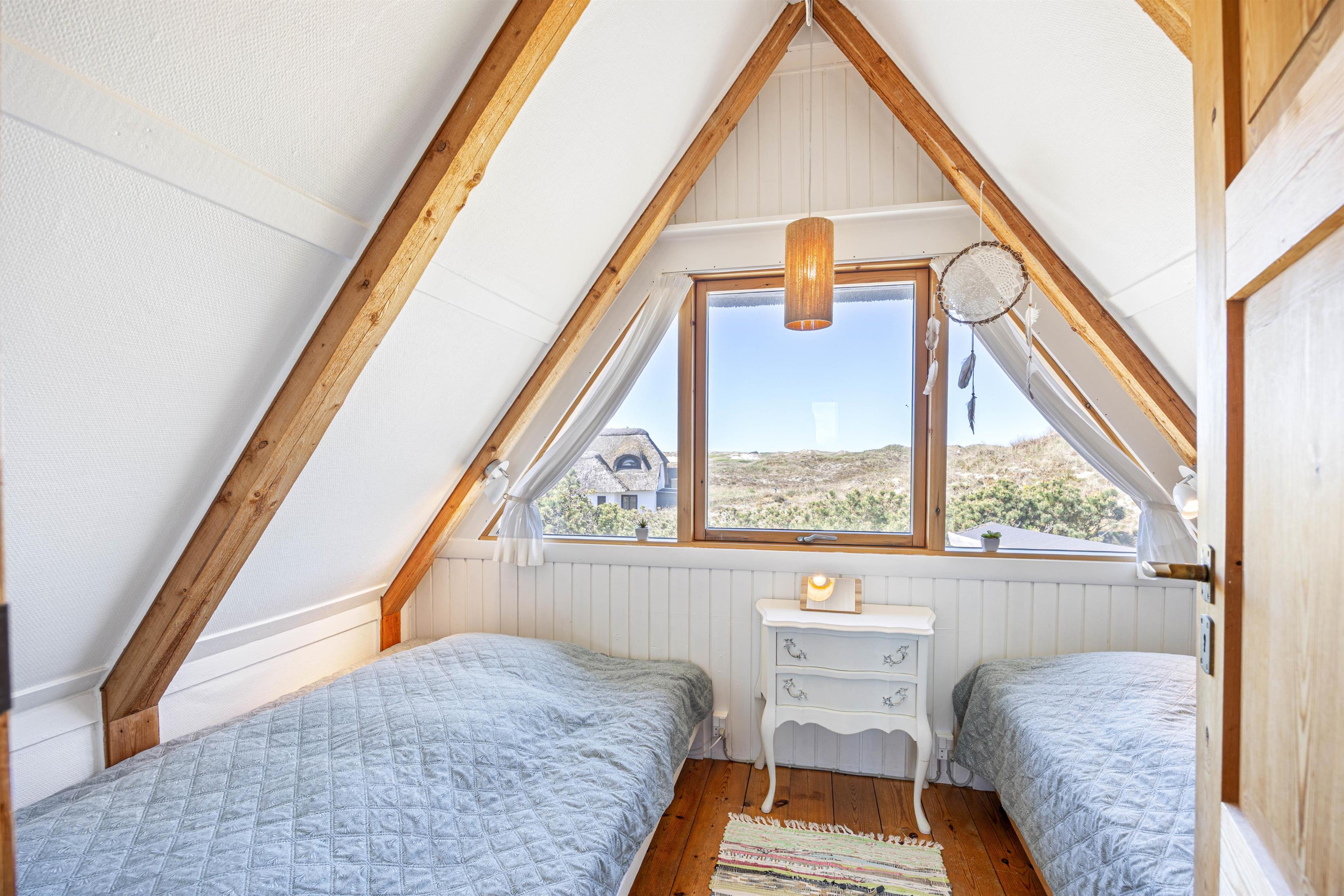 Over den smalle og stejle trappe når I til overetagen, hvor sovepladserne med skøn udsigt til det omkringliggende hede- og klitlandskab befinder sig. På hvert værelse finder I 2 enkeltsenge, hvor I kan lade batterierne op til endnu en oplevelsesrig feriedag.