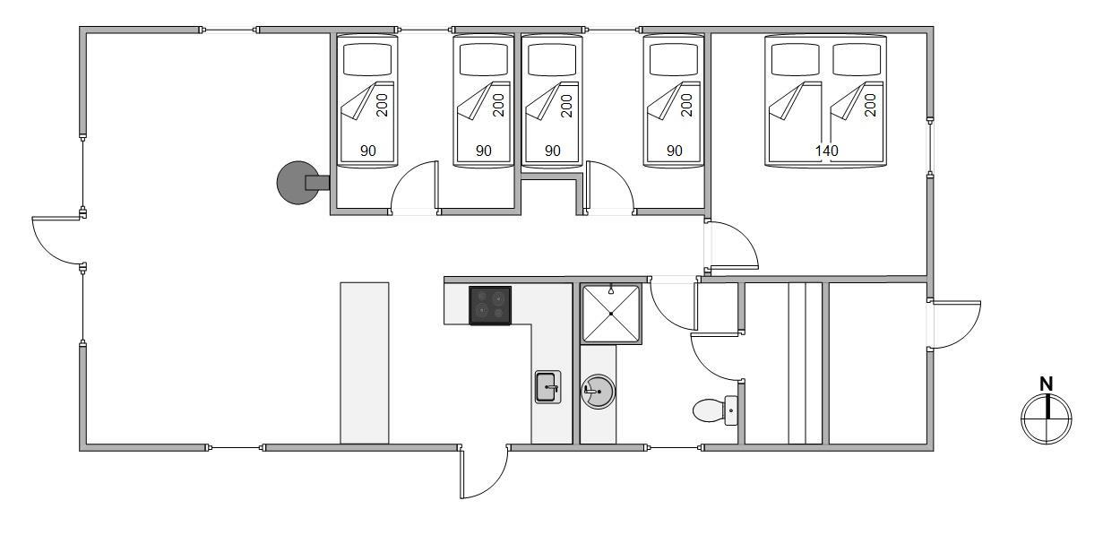 Det tilstødende køkken, udstyret med induktionskomfur og opvaskemaskine, har alle faciliteter til at lave mad sammen med familie eller venner. Prøv også at lave egnsretter, som for eksempel bakskuld, hvis I har mod på det. Afslapning tilbydes på badeværelset med gulvvarme og en sauna. Her kan I nyde lidt ekstra wellness, når I trænger til det. Sovepladserne fordeler sig på 3 værelser: et soveværelse med en dobbeltseng og to yderligere værelser, hver med to enkeltsenge, hvor batterierne kan genoplades. Læg mærke til, at den friske vesterhavsluft gør noget godt for nattesøvnen.