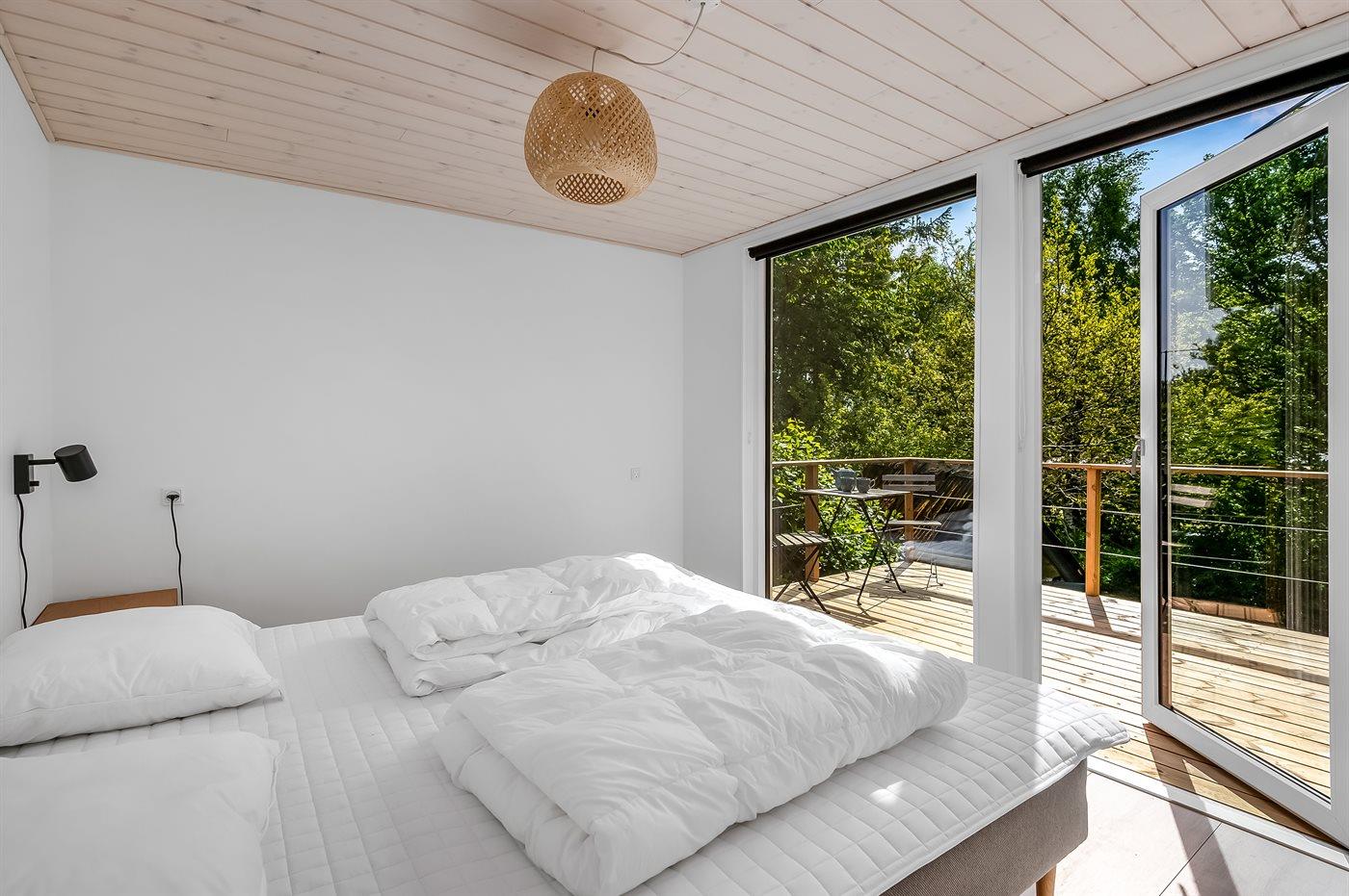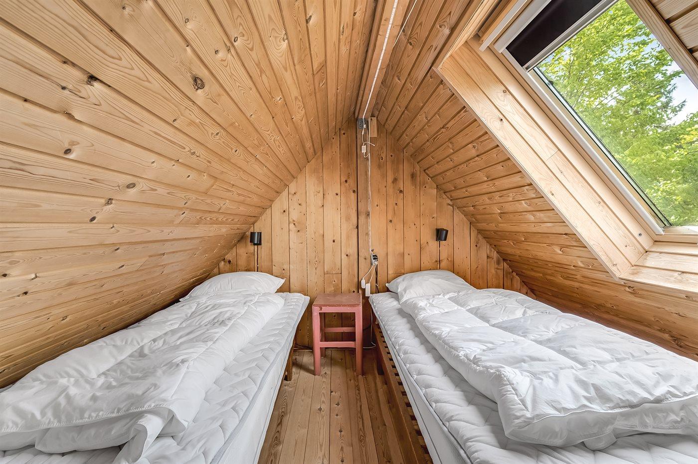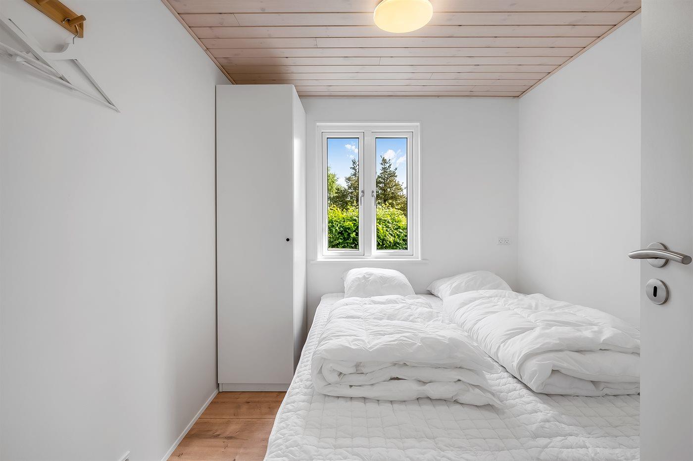 Der er i alt 2 soveværelser. Sovepladserne fordeler sig på: 4 sovepladser i dobbeltsenge. 2 sovepladser i enkeltsenge. 1 soveplads på madras. 3 af disse sovepladser befinder sig på husets hems. Derudover er der 1 stk. barneseng.