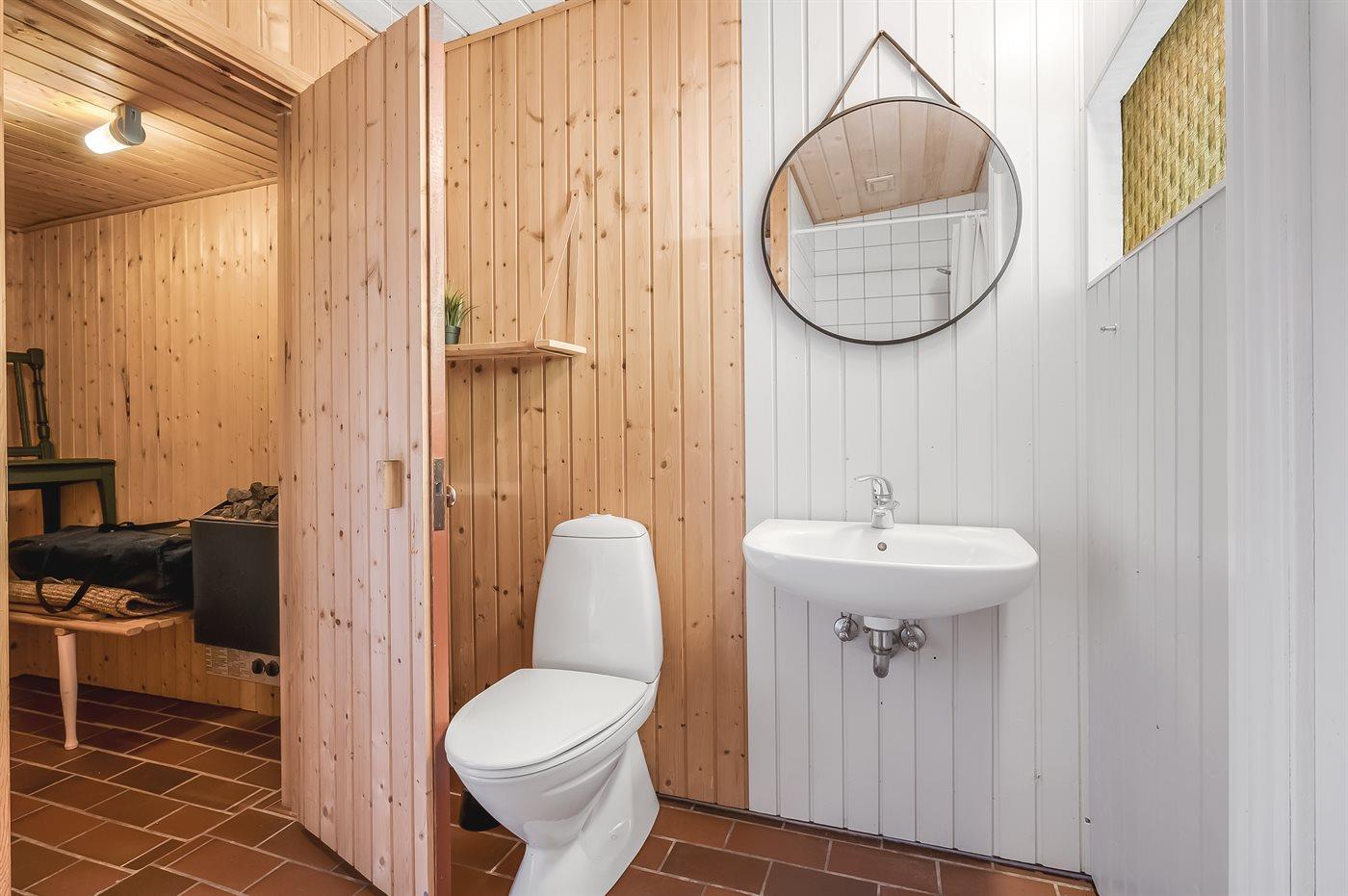 Der er 1 badeværelse med bruseniche og 1 toilet. I saunaen er der mulighed for afslapning.