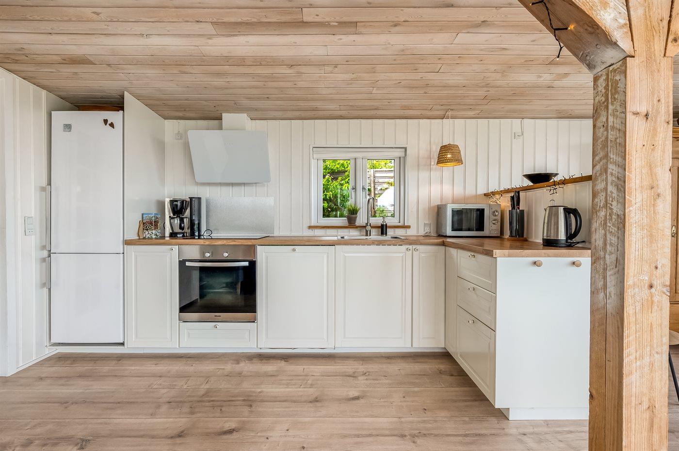 Køkkenet er udstyret med 1 køleskab. Der er 4 induktionskogeplader, varmluftovn, mikrobølgeovn samt opvaskemaskine.