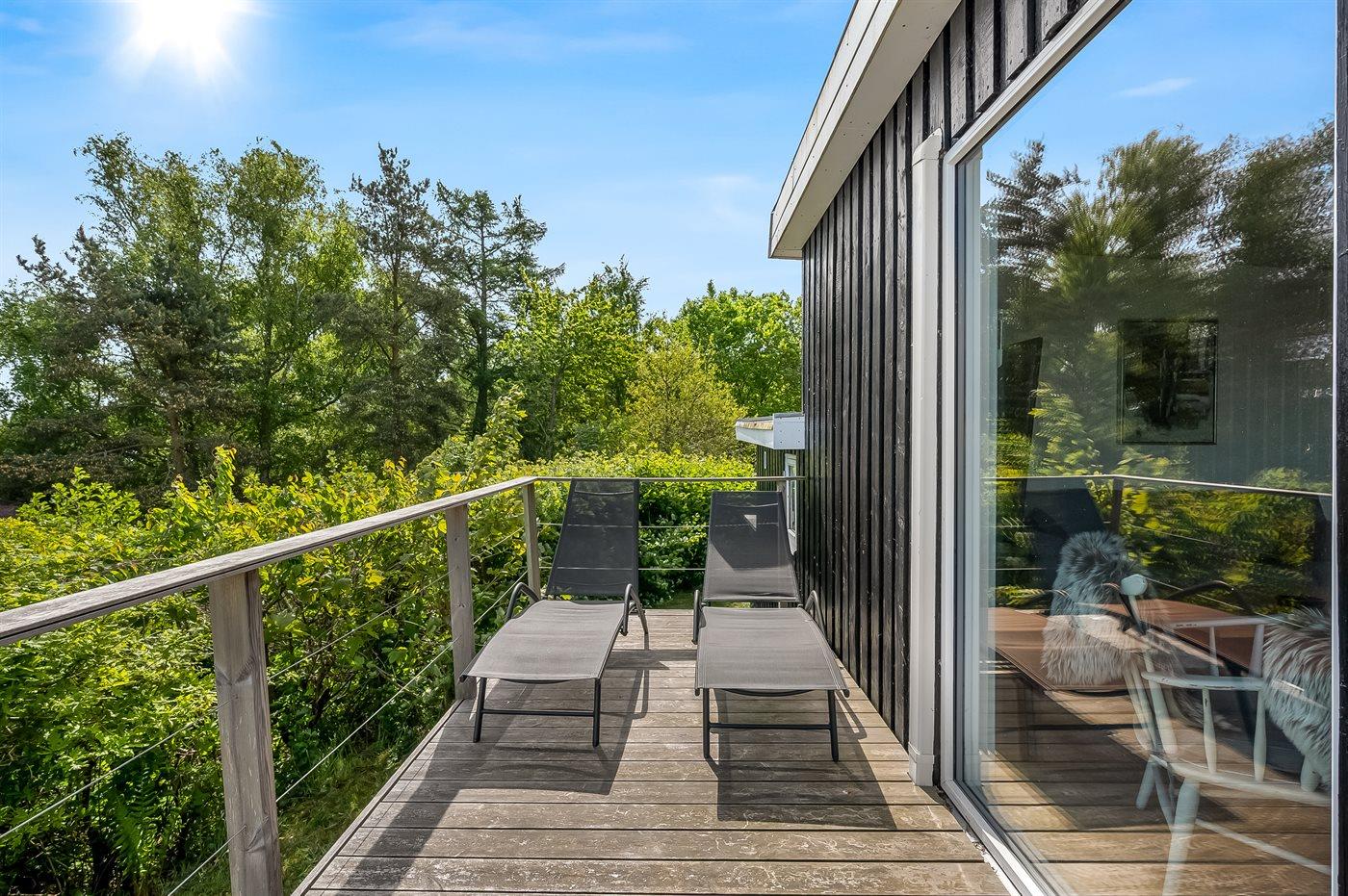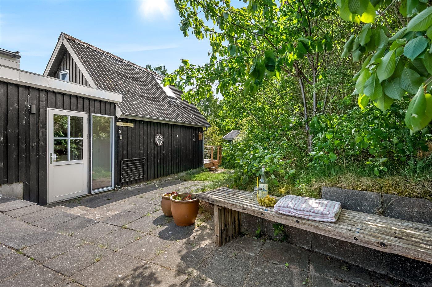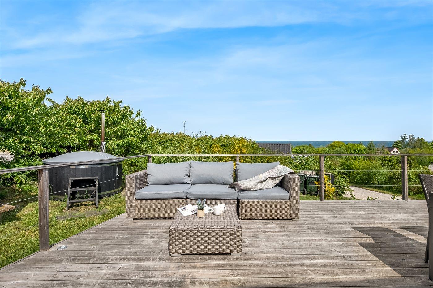 Der findes skønne terrassearealer på flere sider af huset, som inviterer til mange timer i det fri - her er der altid mulighed for at finde en lækrog og nyde de dejlige omgivelser. Her findes tilmed et skønt vildmarksbad med plads til hele familien, hvorfra den skønne udsigt over havet også kan nydes.