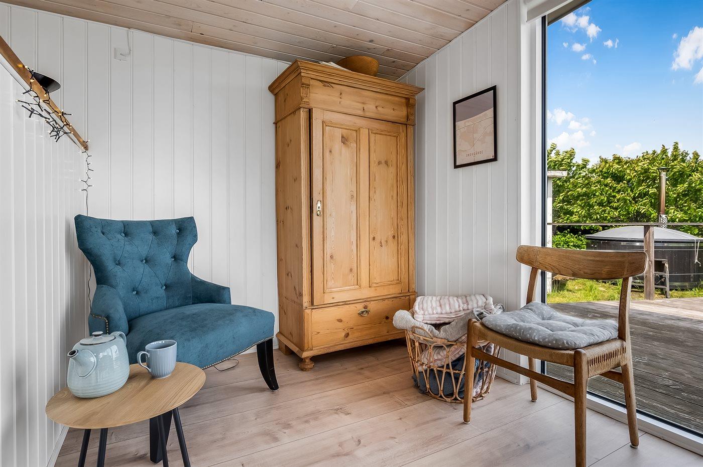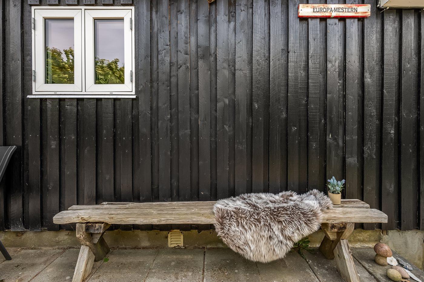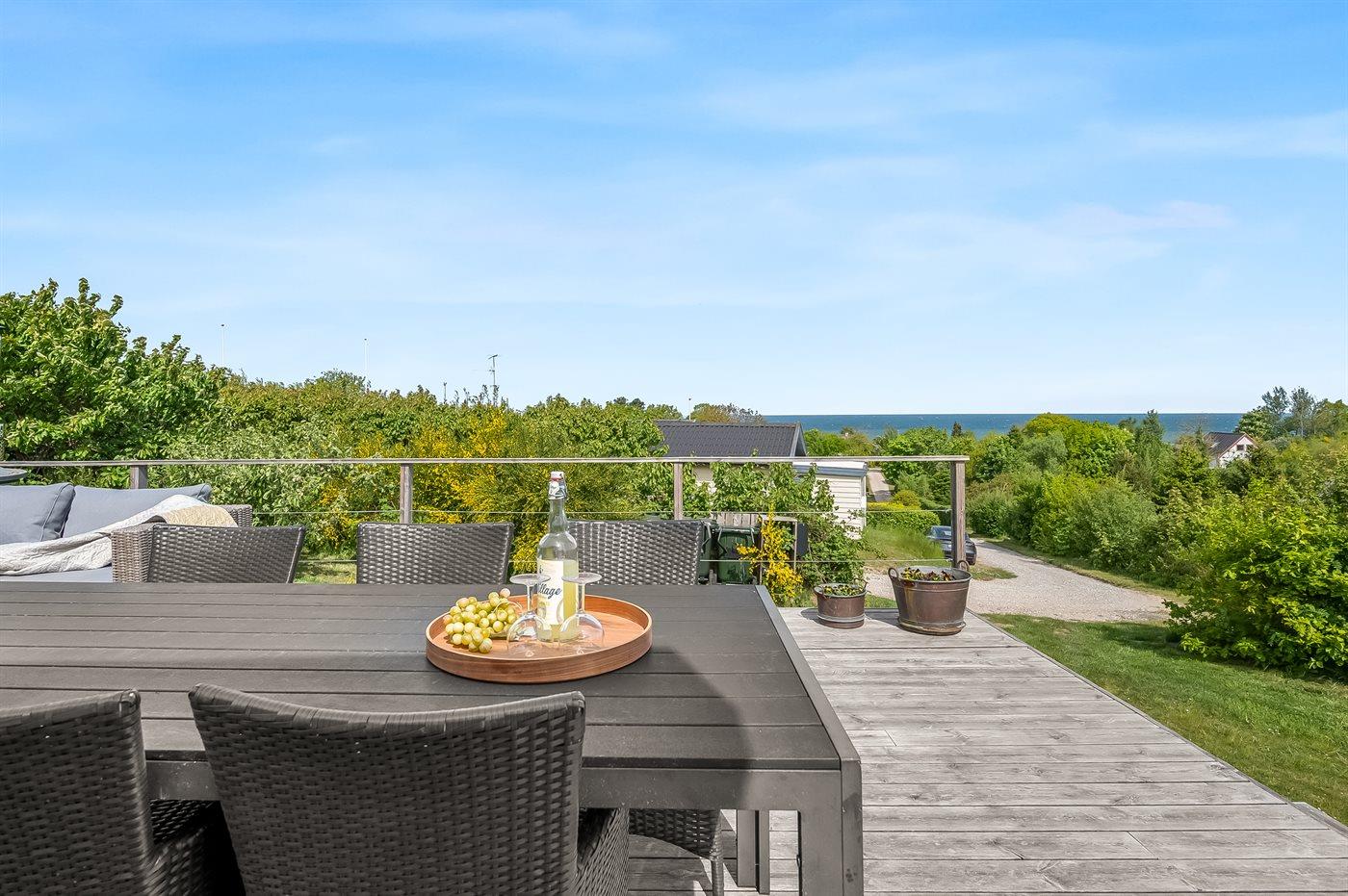 Der findes skønne terrassearealer på flere sider af huset, som inviterer til mange timer i det fri - her er der altid mulighed for at finde en lækrog og nyde de dejlige omgivelser. Her findes tilmed et skønt vildmarksbad med plads til hele familien, hvorfra den skønne udsigt over havet også kan nydes.