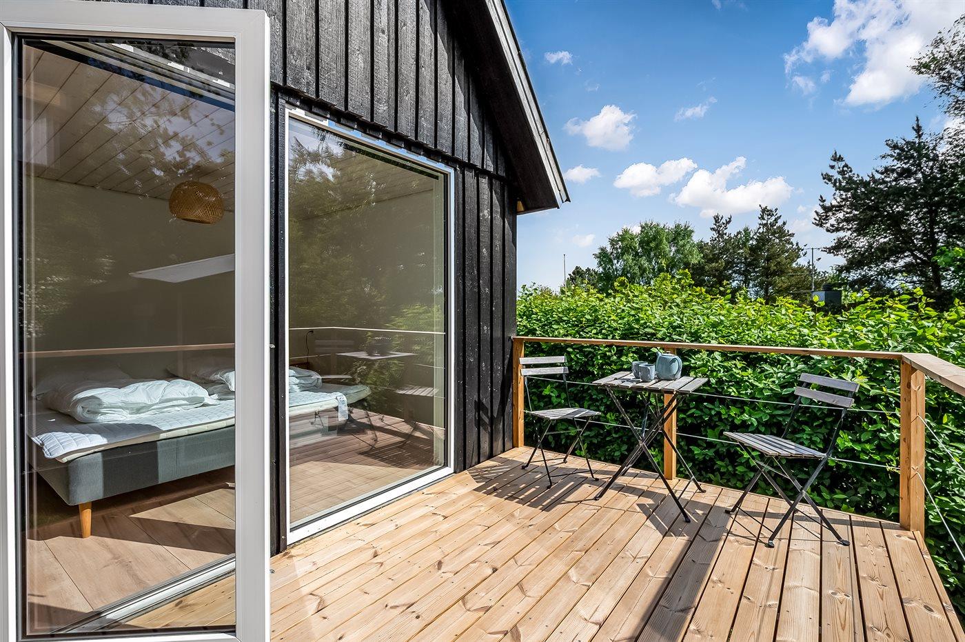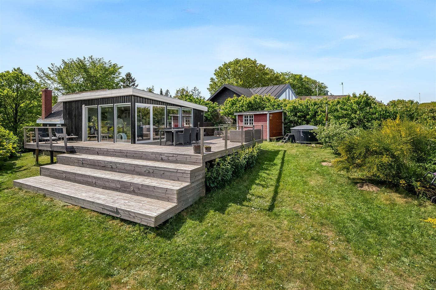 Velindrettet sommerhus nær havet på Djurslands nordkyst med stor terrasse og vildmarksbad til afslapning.