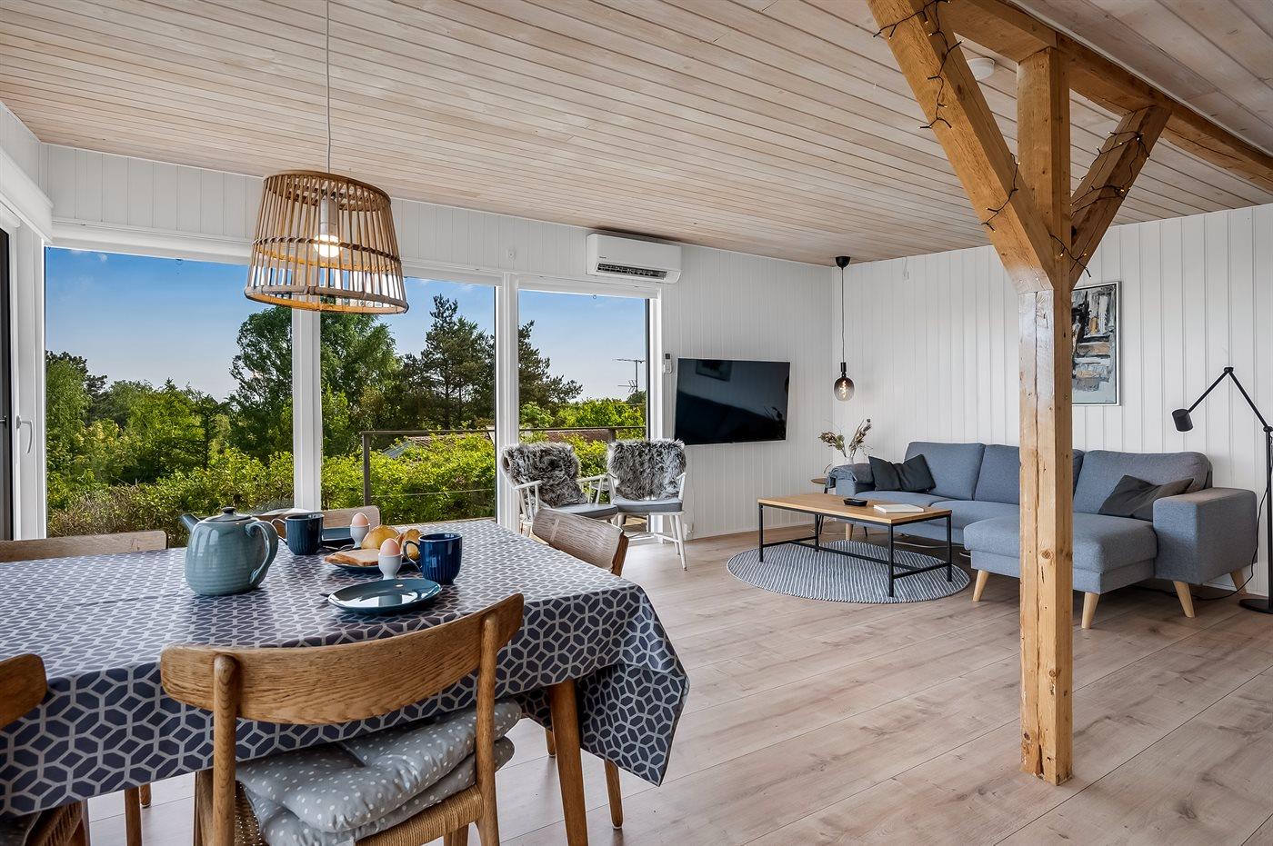 Sommerhuset er rummeligt og fremstår i fin stand, og løbende renoveret. I den ældre del af sommerhuset findes soveværelserne og badeværelset, og i den renoverede del findes et stort køkken/alrum, der ligger i åben forbindelse med stuen - her er virkelig tale om et skønt leverum. Havet kan ses både inde fra huset og fra grunden og ikke mindst fra den store og dejlige terrasse. I den forbindelse kommer den gode beliggenhed virkelig til sin ret, da man også fornemmer nærheden til havet.
