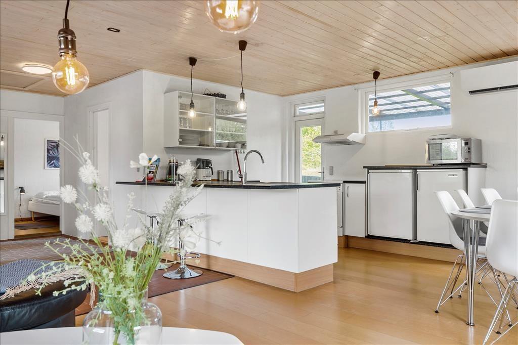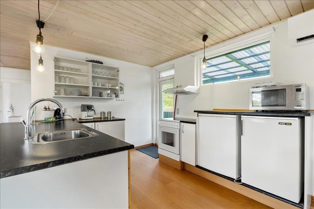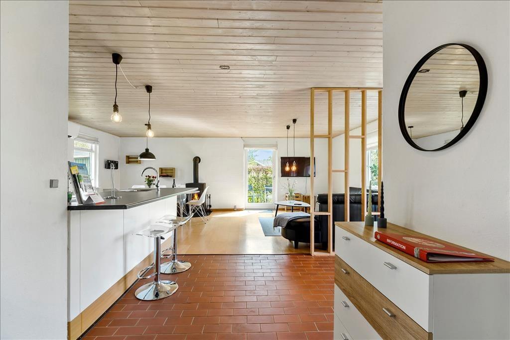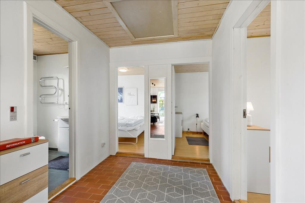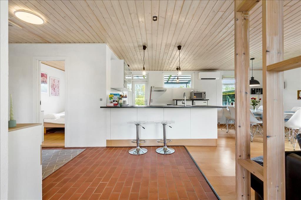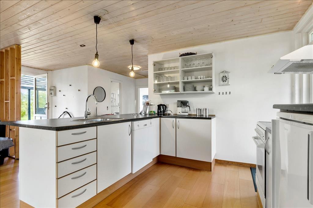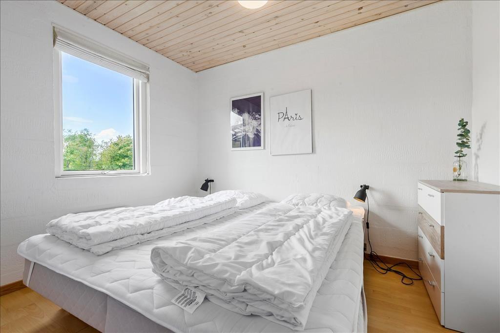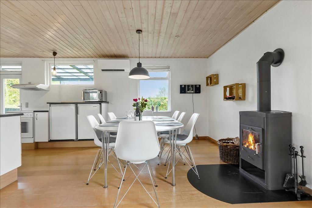 Kun en kort gåtur på 200 meter fra en dejlig badestrand, finder du dette hyggelige sommerhus, der er enkelt, hyggeligt og lige til at tage på ferie i. Når du træder ind i den lyse stue, bliver du straks mødt af en hyggelig stemning, hvor en brændeovn står klar til at sprede varme på kølige dage. Stuen er i åben forbindelse med det funktionelle køkken, som er veludstyret, så tilberedning af feriemaden kan blive så nem og bekvem, som muligt. Pænt badeværelse med bruseniche og 3 soveværelser - alle med dobbeltsenge, så du kan nyde en god nats søvn og være klar til næste dags strabadser.