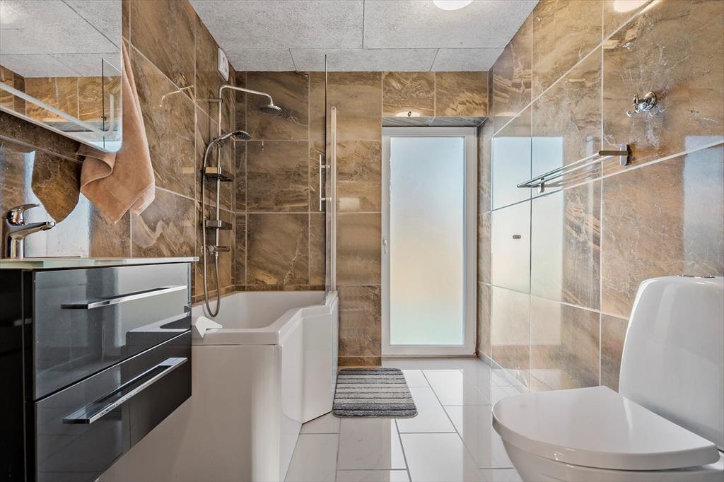 Med fire rummelige soveværelser, alle indrettet med dobbeltsenge, og en hyggelig hems med tre ekstra sovepladser er der god plads til hele familien – og måske endda et par venner. Badeværelset er en oase i sig selv med badekar og direkte adgang til terrassen, hvor vildmarksbadet står klar til at fuldende jeres afslappende feriedage. Og med både vaskemaskine og tørretumbler er de praktiske detaljer også tænkt på.