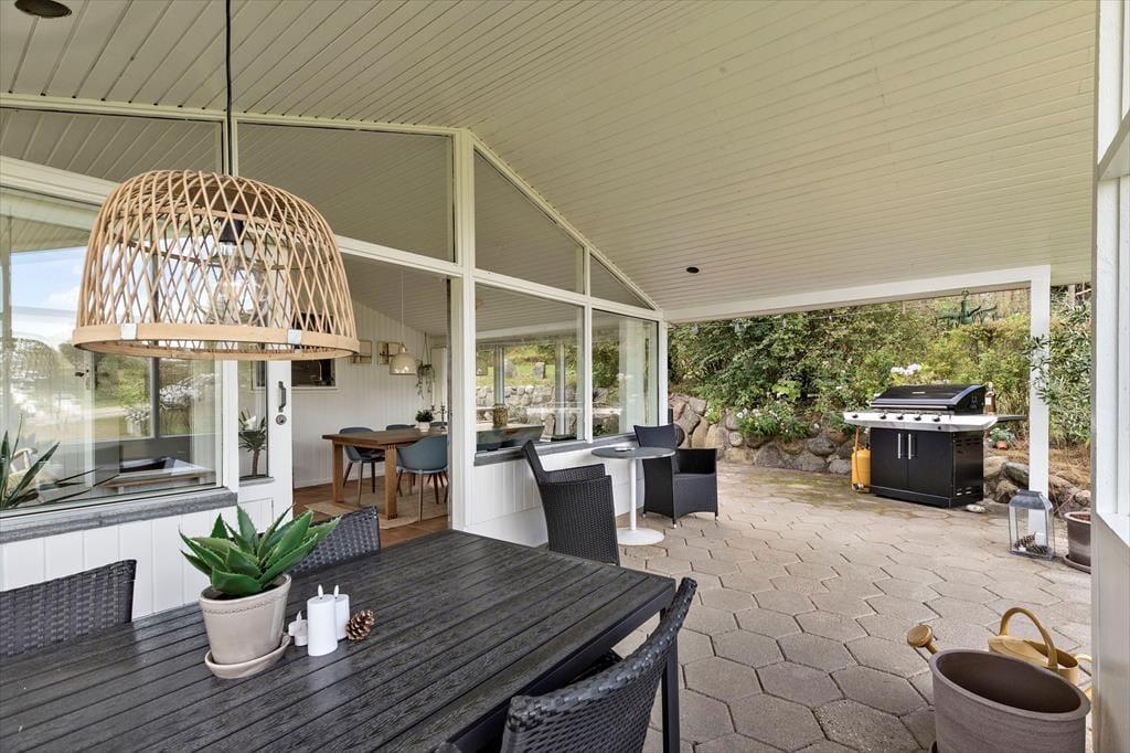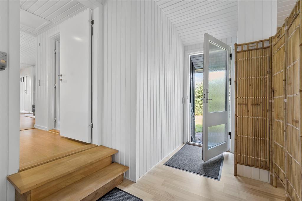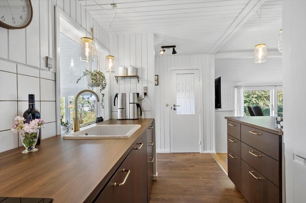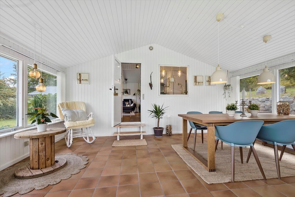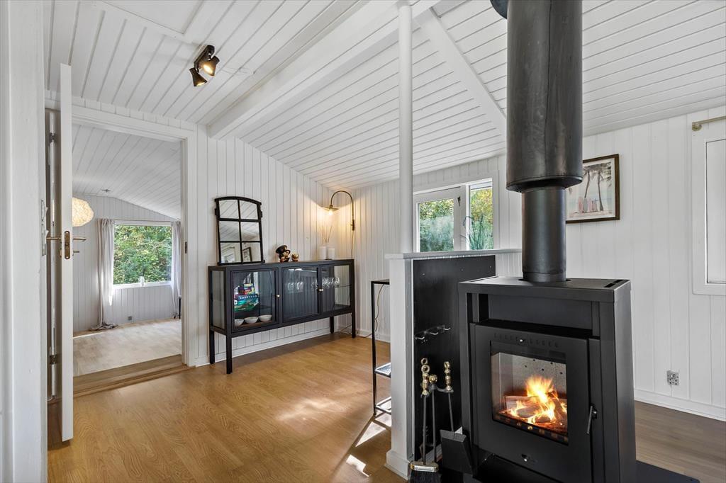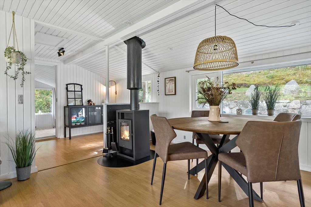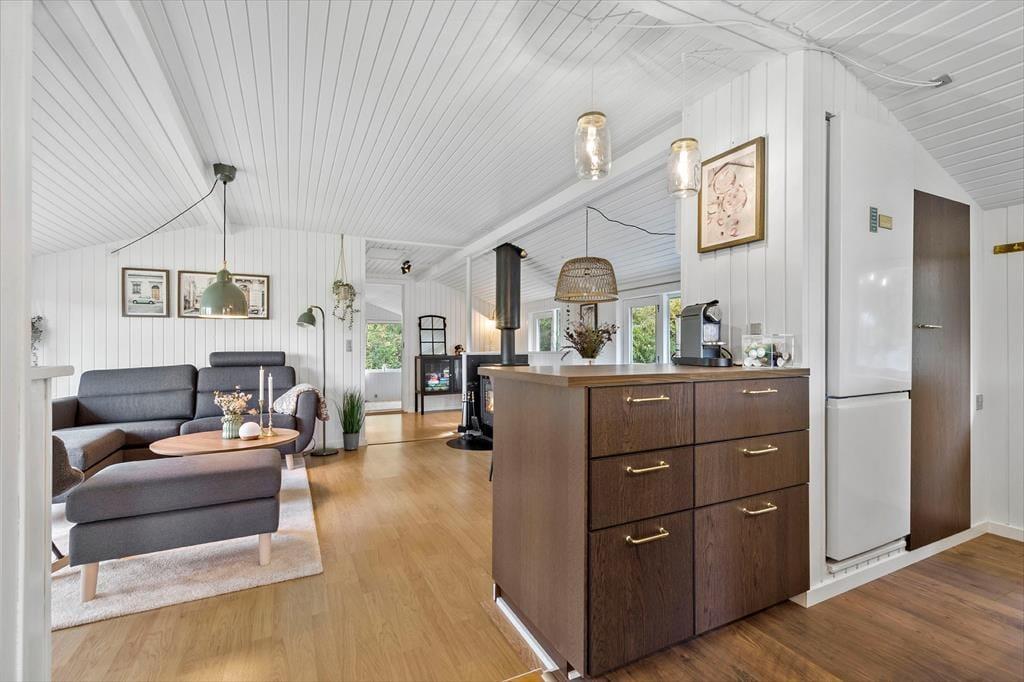 Velkommen indenfor til et sommerhus, hvor hygge og ferieglæde mødes på den mest naturlige måde. Huset er moderne indrettet med sans for kreative detaljer, og allerede i den charmerende udestue kan du mærke, hvordan roen sænker sig. Her kan du nyde livet det meste af året – tænde radiatoren på de kølige dage eller åbne døren til huset og lade varmen fra brændeovnen eller varmepumpen brede sig. Fra køkkenet kan du samtidig holde øje med, hvad der foregår i udestuen, mens du tilbereder måltider.