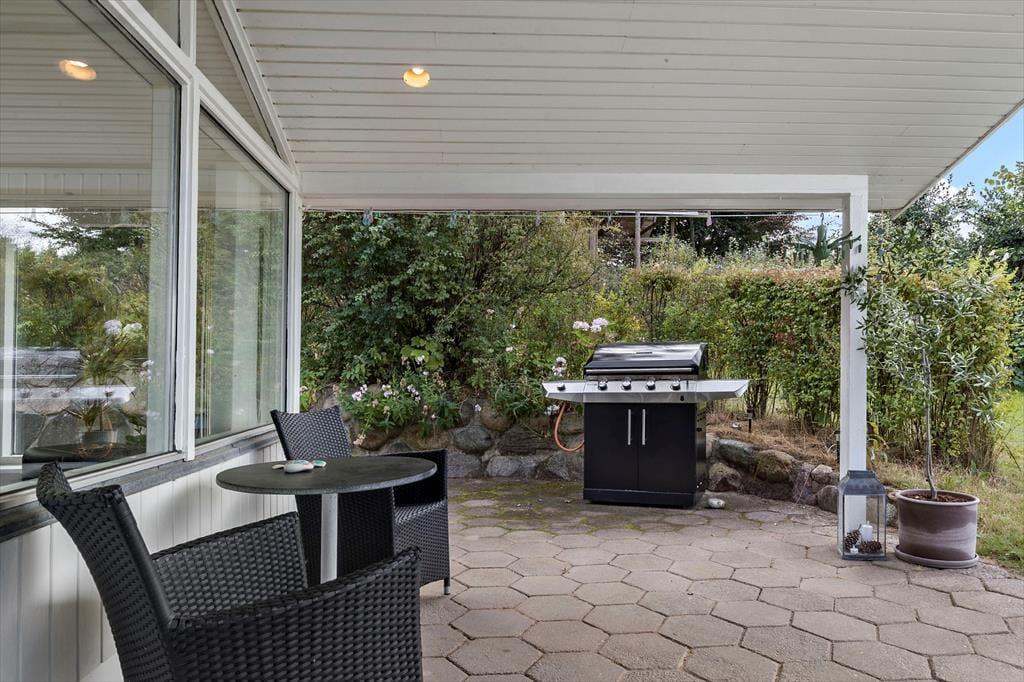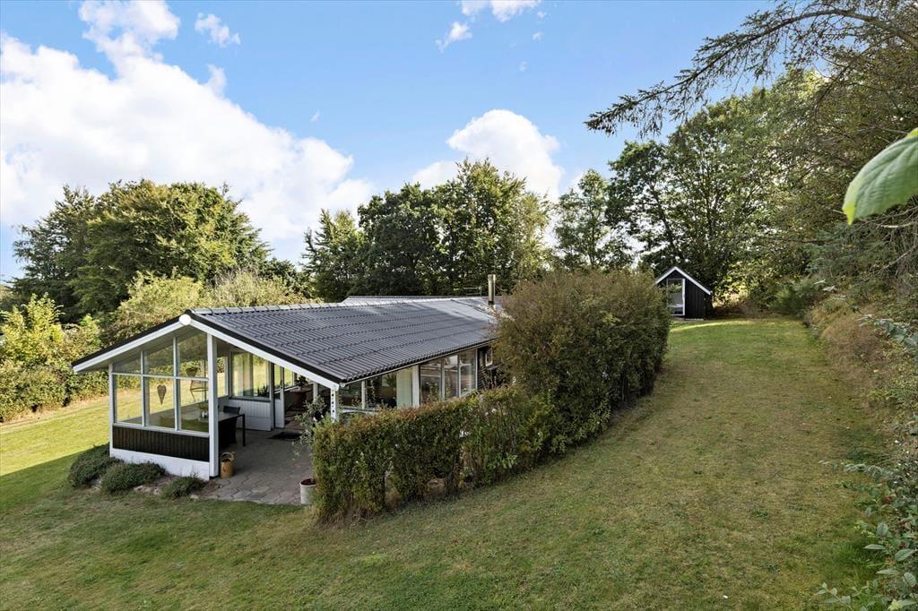 Grunden omkring sommerhuset er både charmerende og alsidig. Den er bakket i den ene side, hvor annekset ligger, og plan på den anden side, hvilket skaber gode muligheder for leg og afslapning. Med lidt held og på de rette tider af året kan du skimte havet i horisonten. Mellem huset og annekset ligger den dejligste solgård, hvor du kan nyde solen i læ og samvær med familie og venner i rolige og private omgivelser.