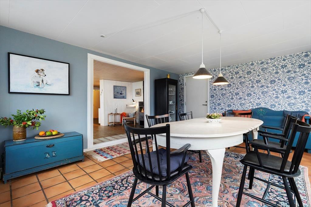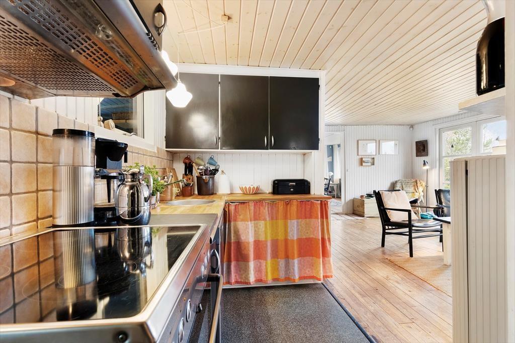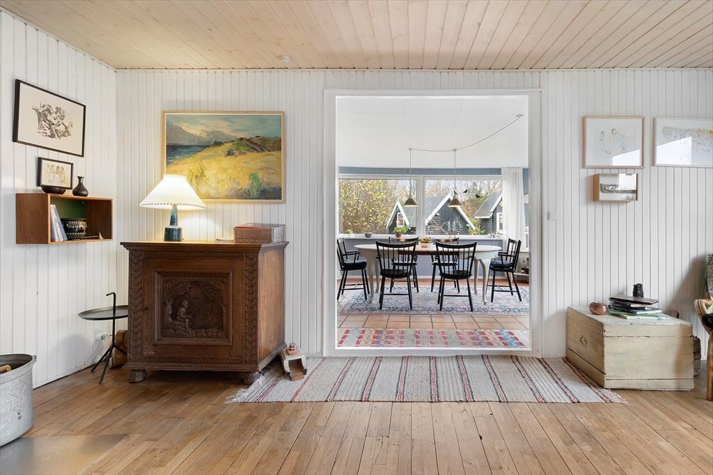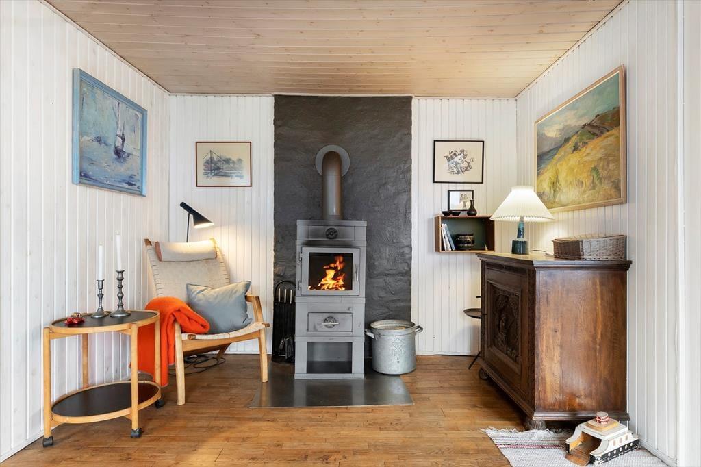 Den lyse spisestue danner rammen om hyggelige måltider og lange samtaler, mens opholdsstuen indbyder til ro og nærvær med blød sofa, tv og en brændeovn, der spreder varme og atmosfære, når aftenen falder på. Alt er forbundet i åben plan med et charmerende landkøkken i sommerhusstørrelse – et køkken, der kalder på duften af friskbagt brød og langsomme morgener.