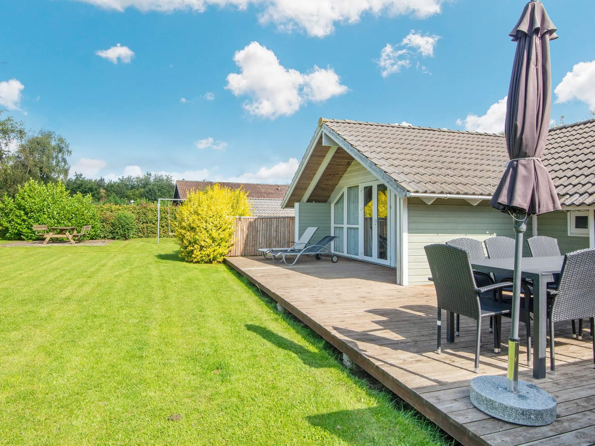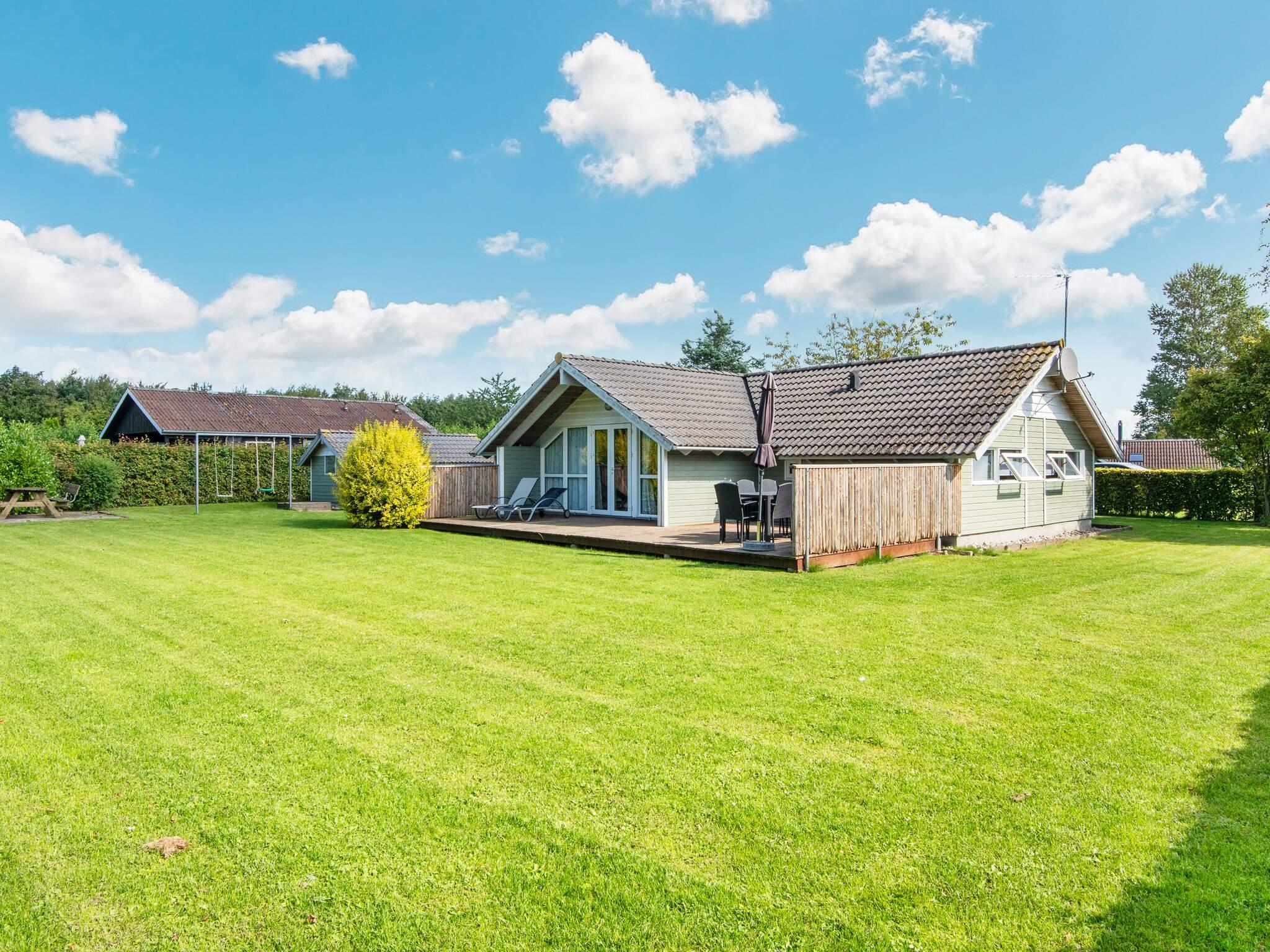 Huset ligger på uforstyrret grund med kort afstand til en børnevenlig strand. Til huset hører en delvis overdækket terrasse samt stor plæne, der indbyder til boldspil og leg. Der er også sandkasse og gynge i haven.