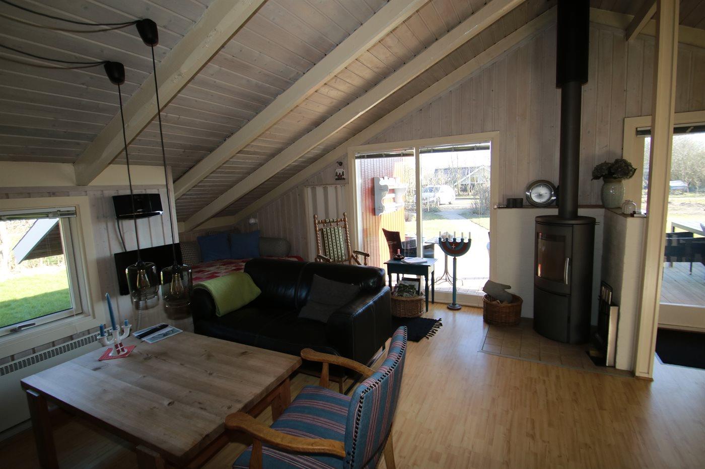 Hyggeligt træsommerhus tæt på børnevenlig sandstrand med sauna og brændeovn.