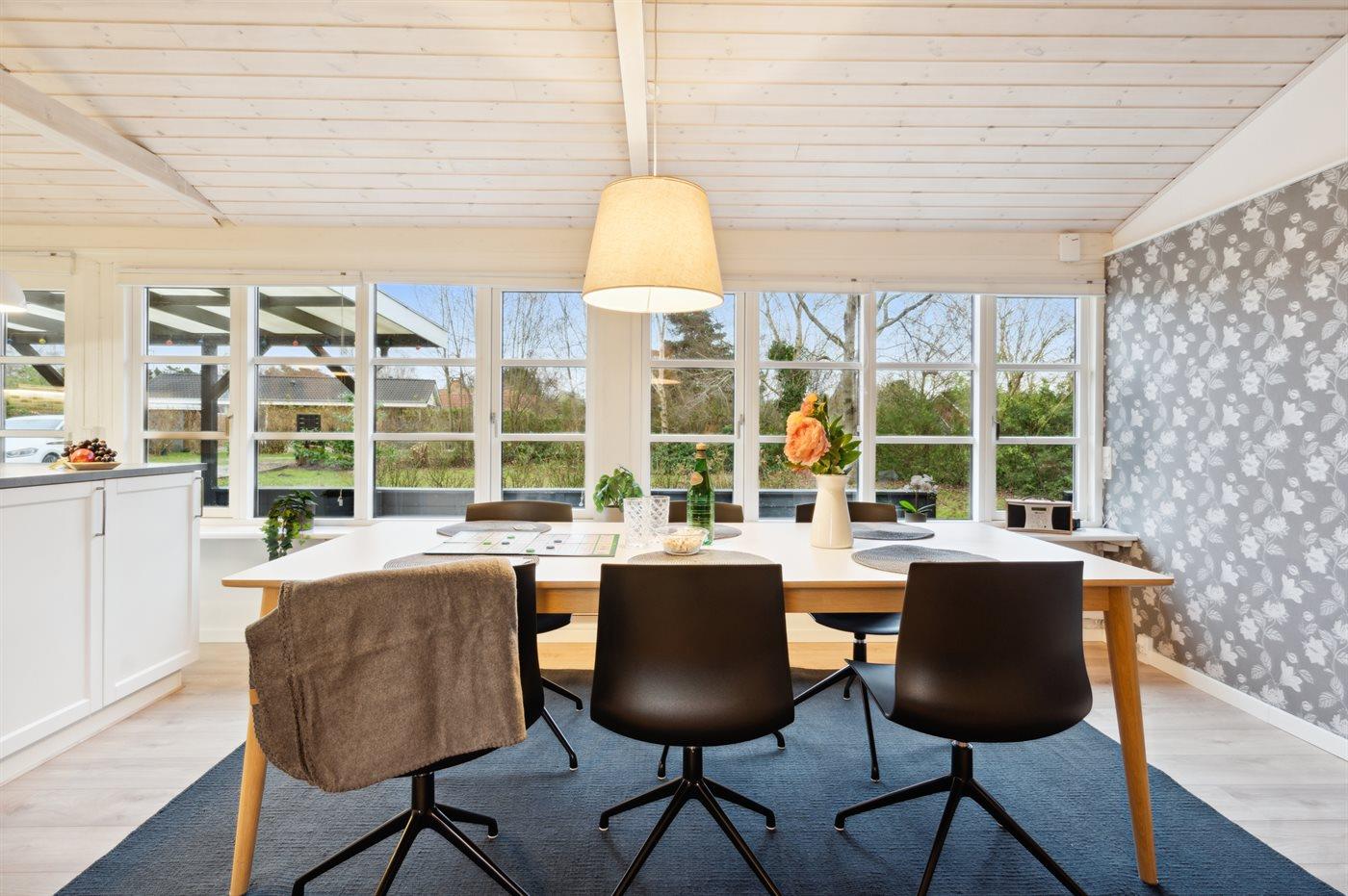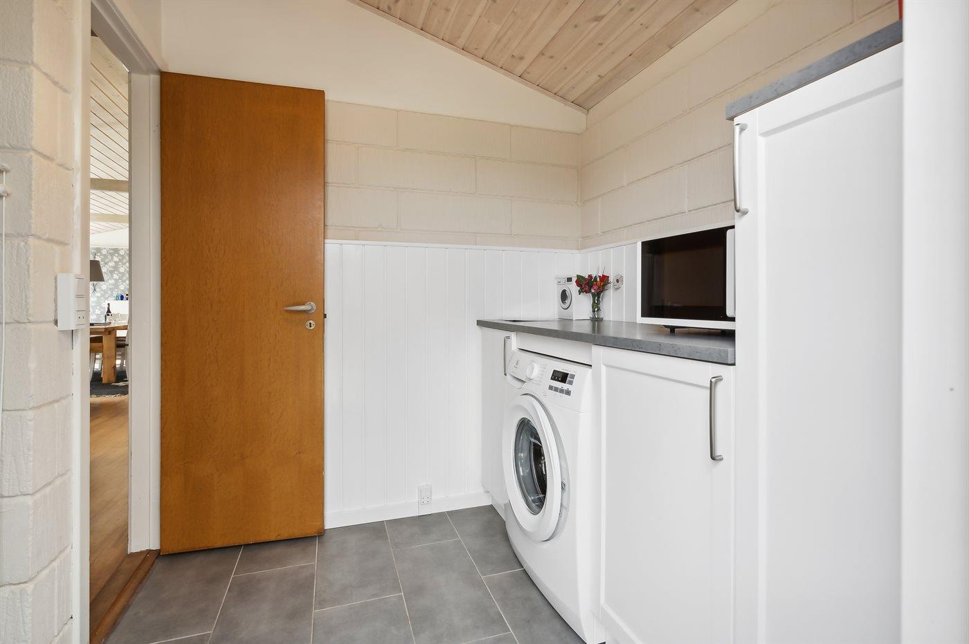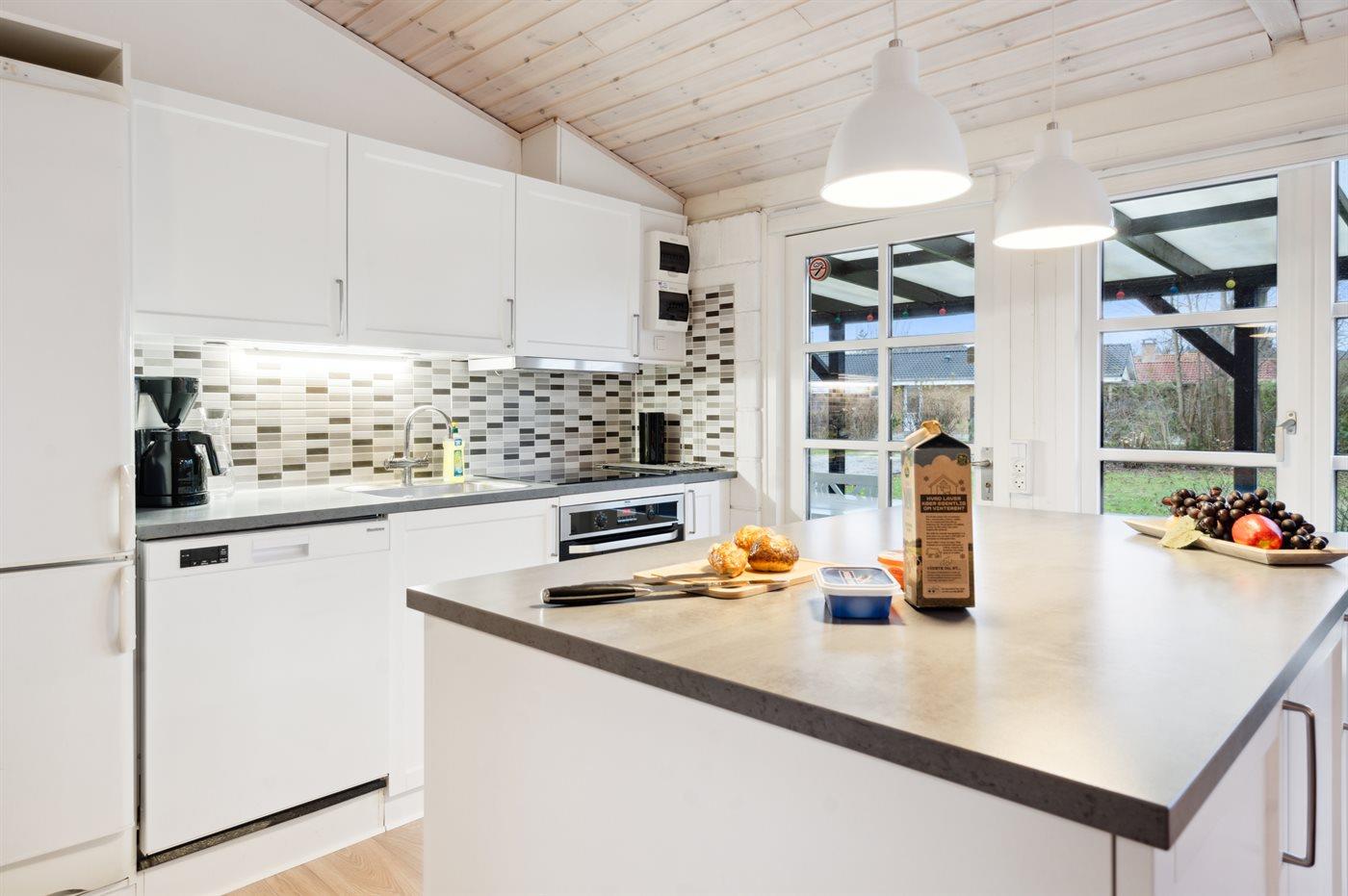 Køkkenet er udstyret med 1 køleskab. Der er 4 keramiske kogeplader, bageovn samt opvaskemaskine.