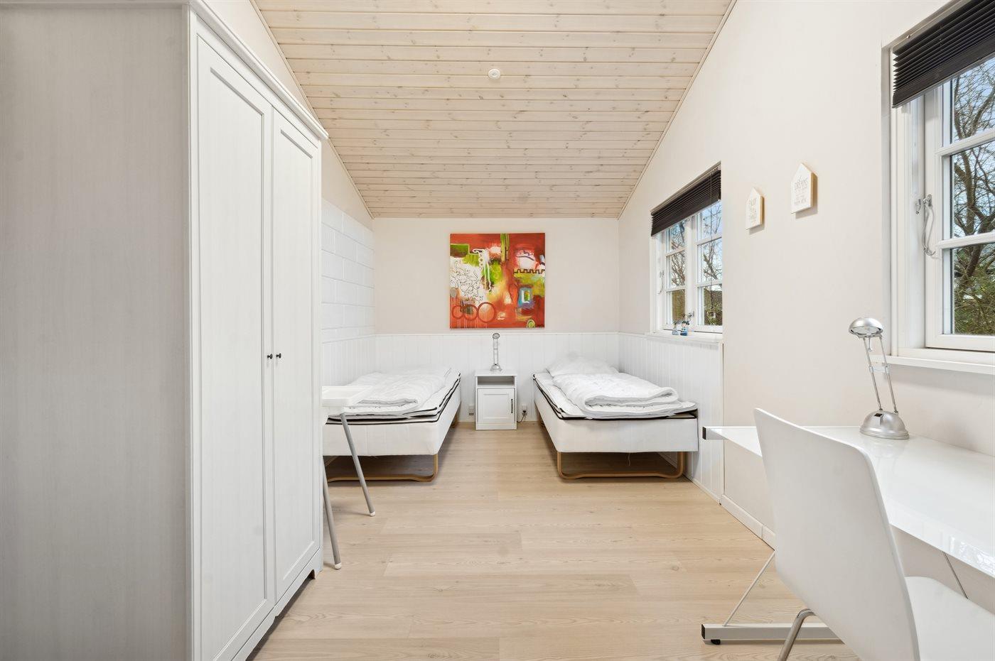 Der er i alt 3 soveværelser. Sovepladserne fordeler sig på: 2 sovepladser i dobbeltseng. 2 sovepladser i enkeltsenge. 2 sovepladser i køjeseng. Derudover er der 1 stk. barneseng.