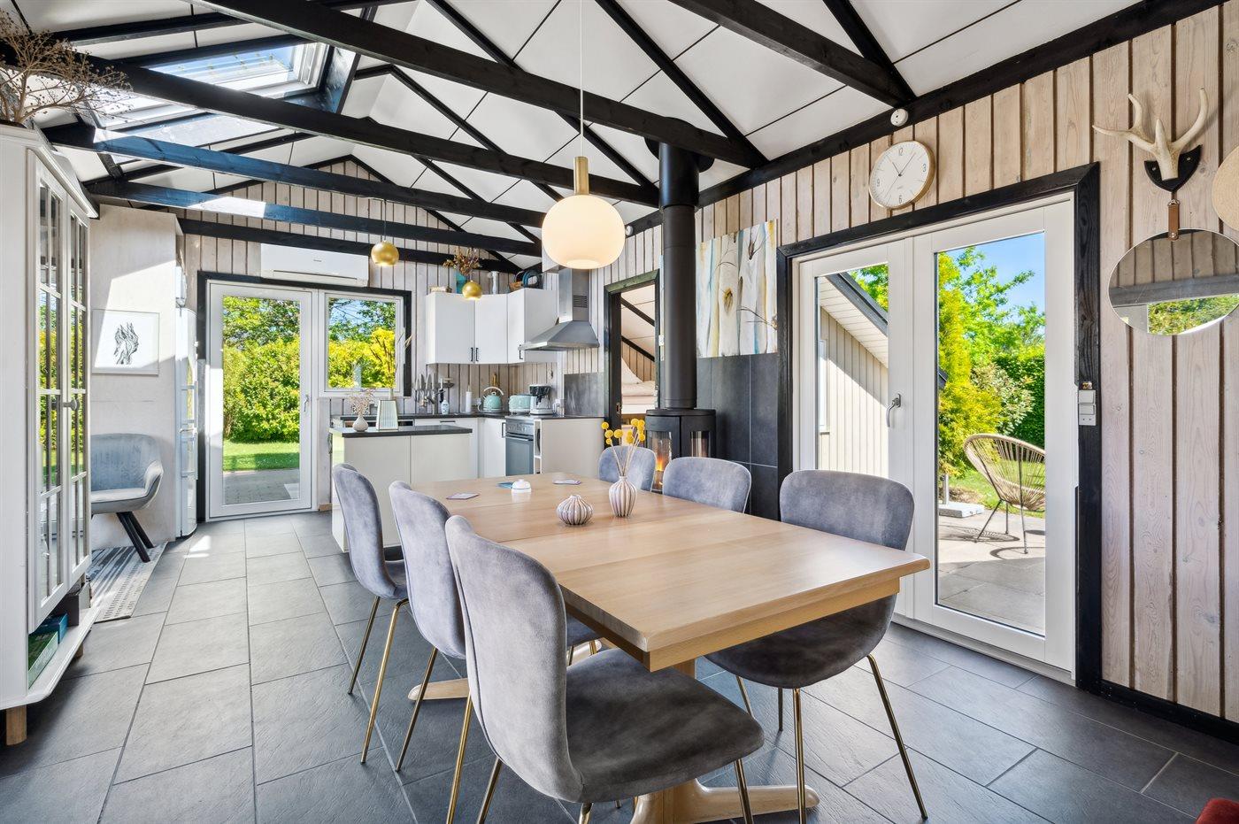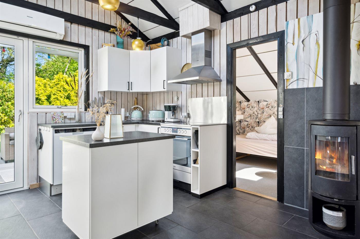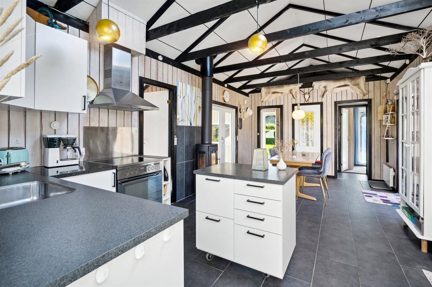 Køkkenet er udstyret med 1 køleskab. Der er 4 induktionskogeplader, varmluftovn, mikrobølgeovn samt opvaskemaskine.