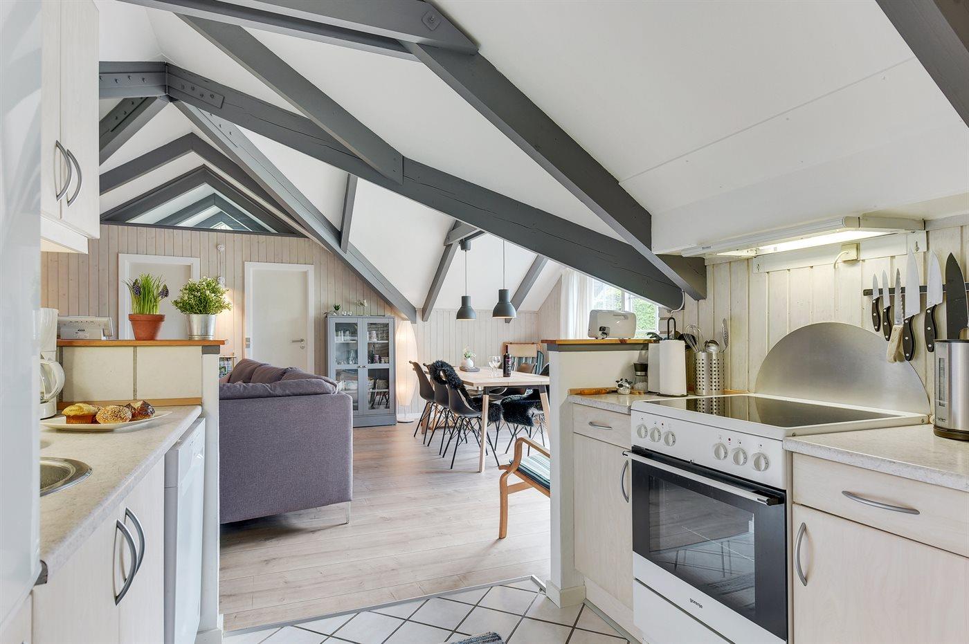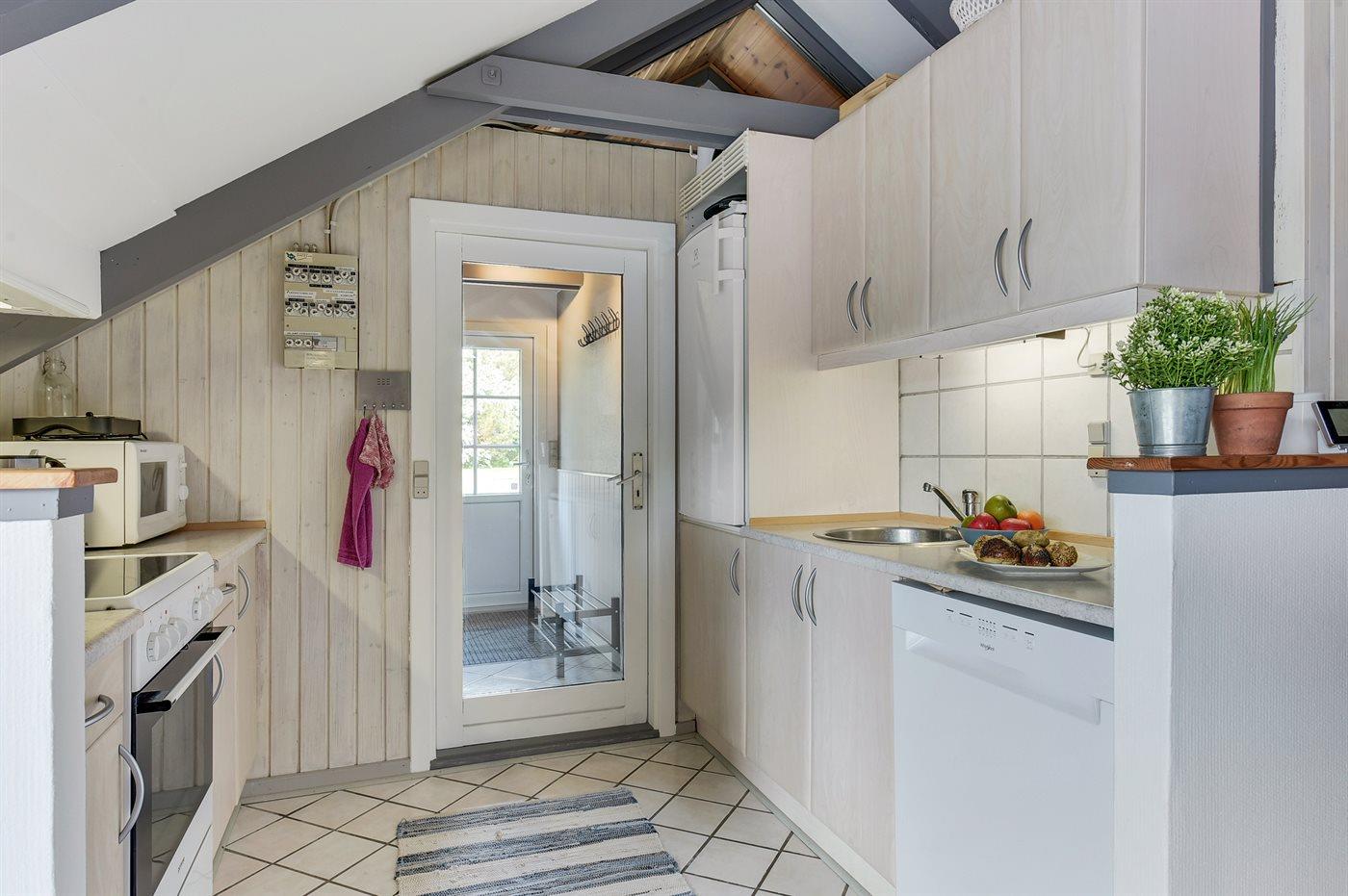 Køkkenet er udstyret med 1 køleskab. Der er 4 keramiske kogeplader, varmluftovn, mikrobølgeovn samt opvaskemaskine.