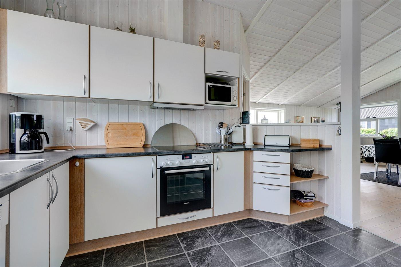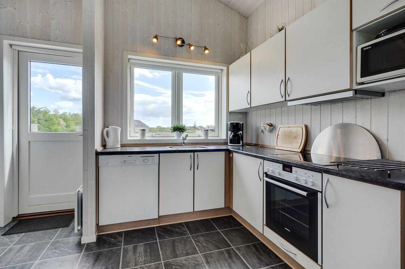 Køkkenet er udstyret med 1 køleskab. Der er 4 keramiske kogeplader, varmluftovn, mikrobølgeovn samt opvaskemaskine.