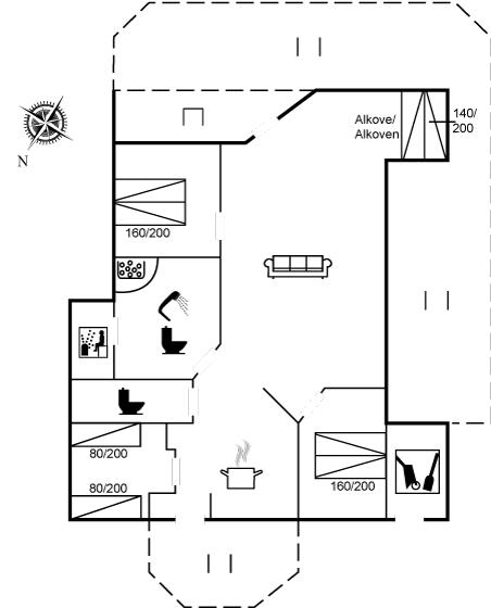 Der er i alt 3 soveværelser. Sovepladserne fordeler sig på: 4 sovepladser i dobbeltsenge. 2 sovepladser i enkeltsenge. 2 sovepladser i alkove. Derudover er der 1 stk. barneseng.